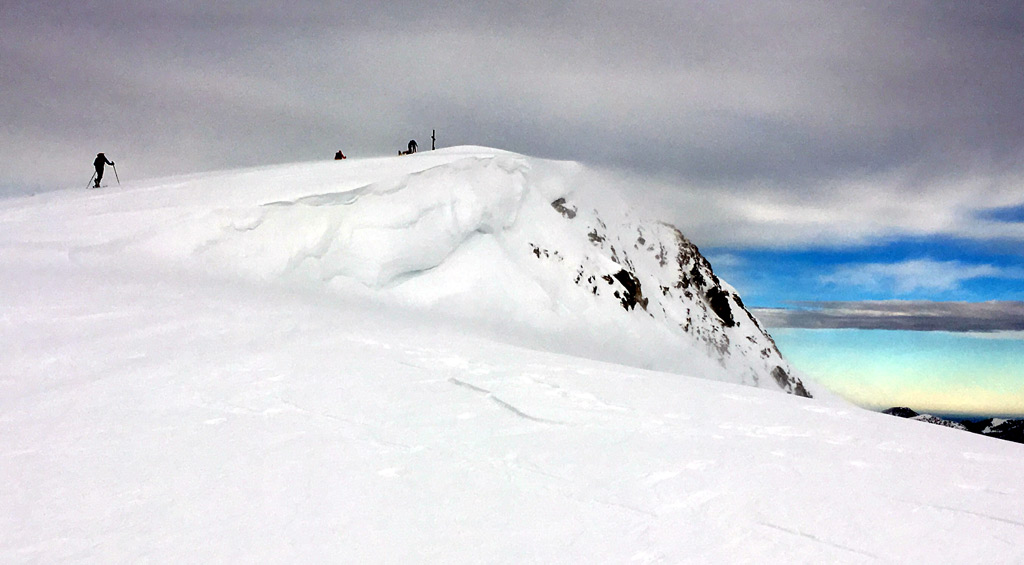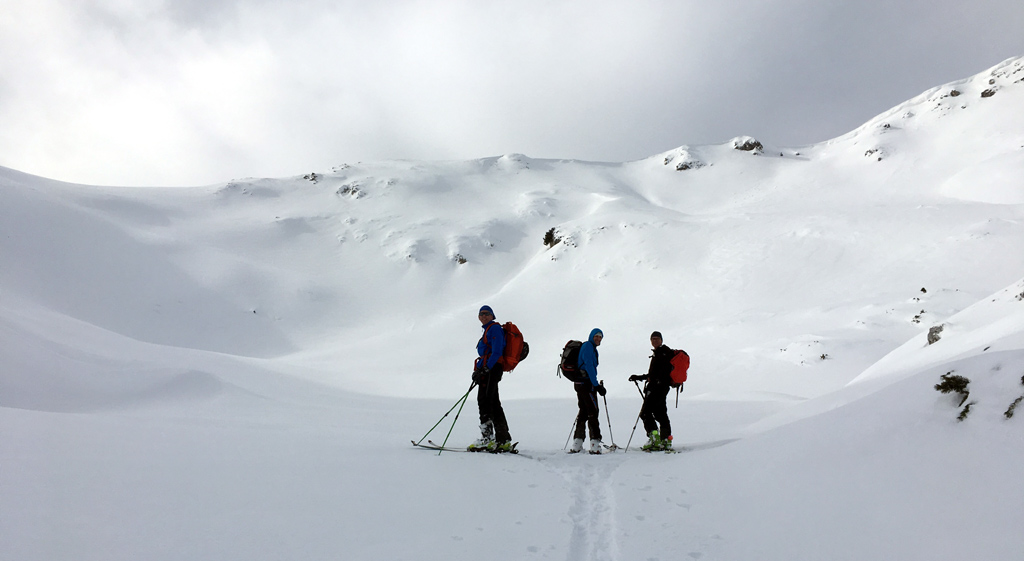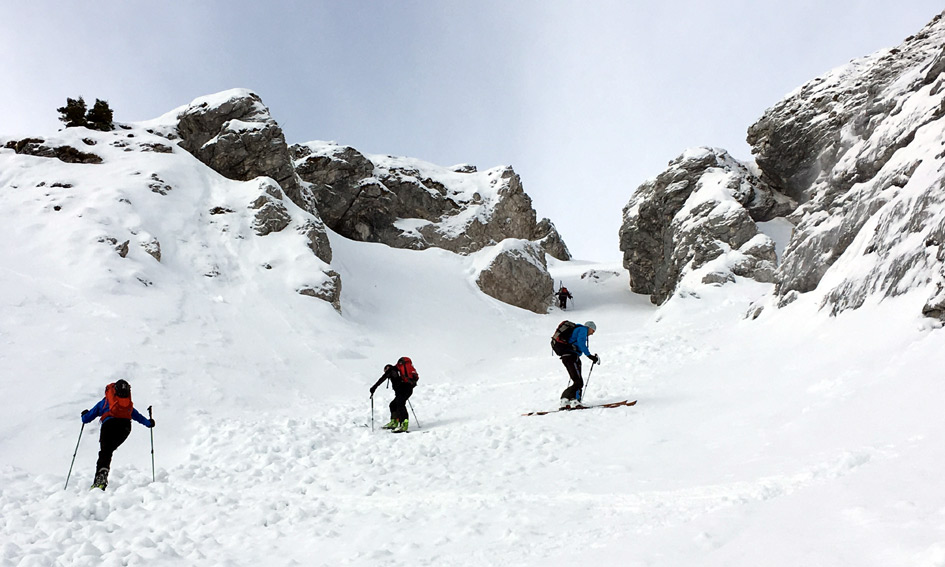 Gefahreneinschätzung: LWS 2-3 - einige Stellen sind wir einzeln begangen (und abgefahren), an einer Stelle haben wir im Aufstieg umgedreht und eine bessere Variante gesucht. Insgesamt mäßiges Lawinenrisiko, wenn man aufpasst (Probleme: windverpresster Triebschnee, stellenweise eingelagerte Altschnee-Schwachschicht).