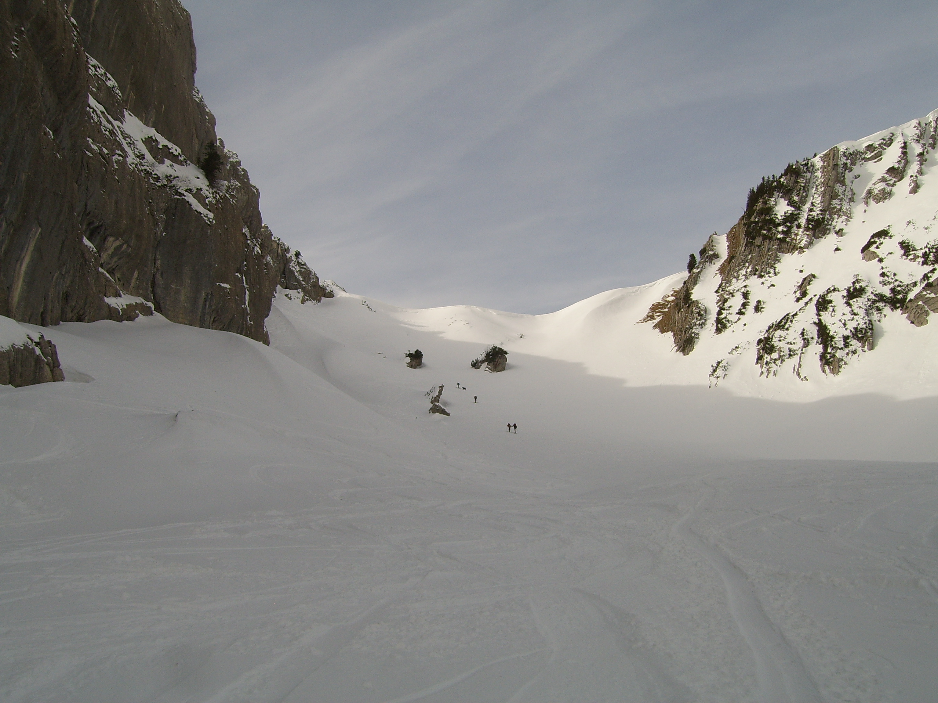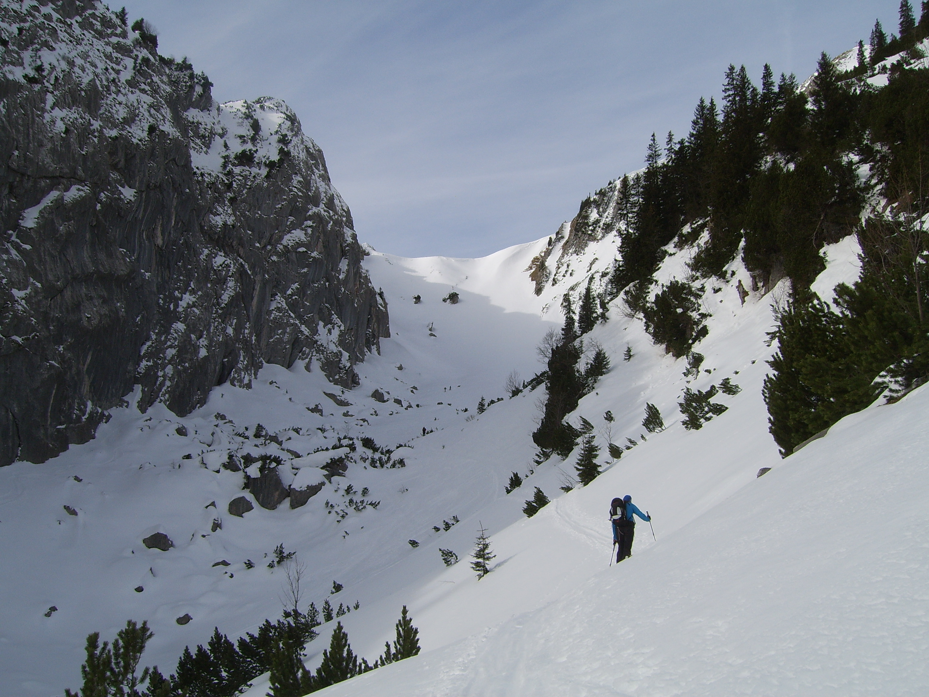 Tourenverhältnisse: Frühjahrsverhältnisse im Februar; durchgängig Schnee auf der Almstrasse (bis auf 1x 5m) bis zu den Wildenkaralmen; Abkürzer sind jedoch kaum noch möglich; Anstieg ab Abzweig Pt. 1081m lt. Aussage anderer Tourengeher nicht mehr so toll (Tragestrecke und sehr hart); Schnittlauchgraben noch super mit (wenigen cm) Pulver; Wächte problemlos; Gipfelhang apert weiter aus, jedoch, mit einem weiten Bogen ins Kar hinein, noch gut zu gehen und abzufahren. So richtig Firn gabs heut nicht, wohl auf Grund der Schleierbewölkung und des kalten Südwinds. Kein Steinkontakt heute.