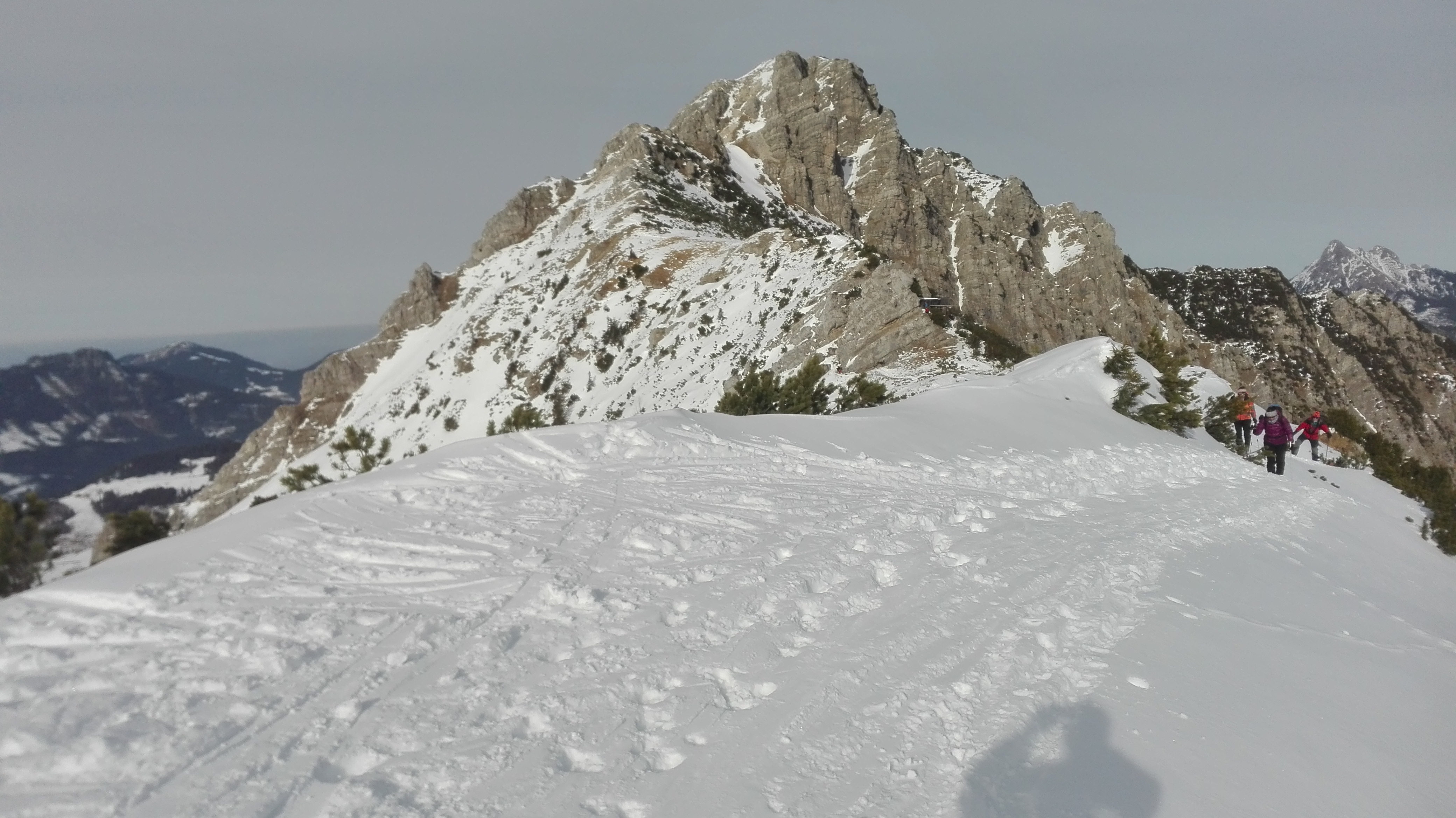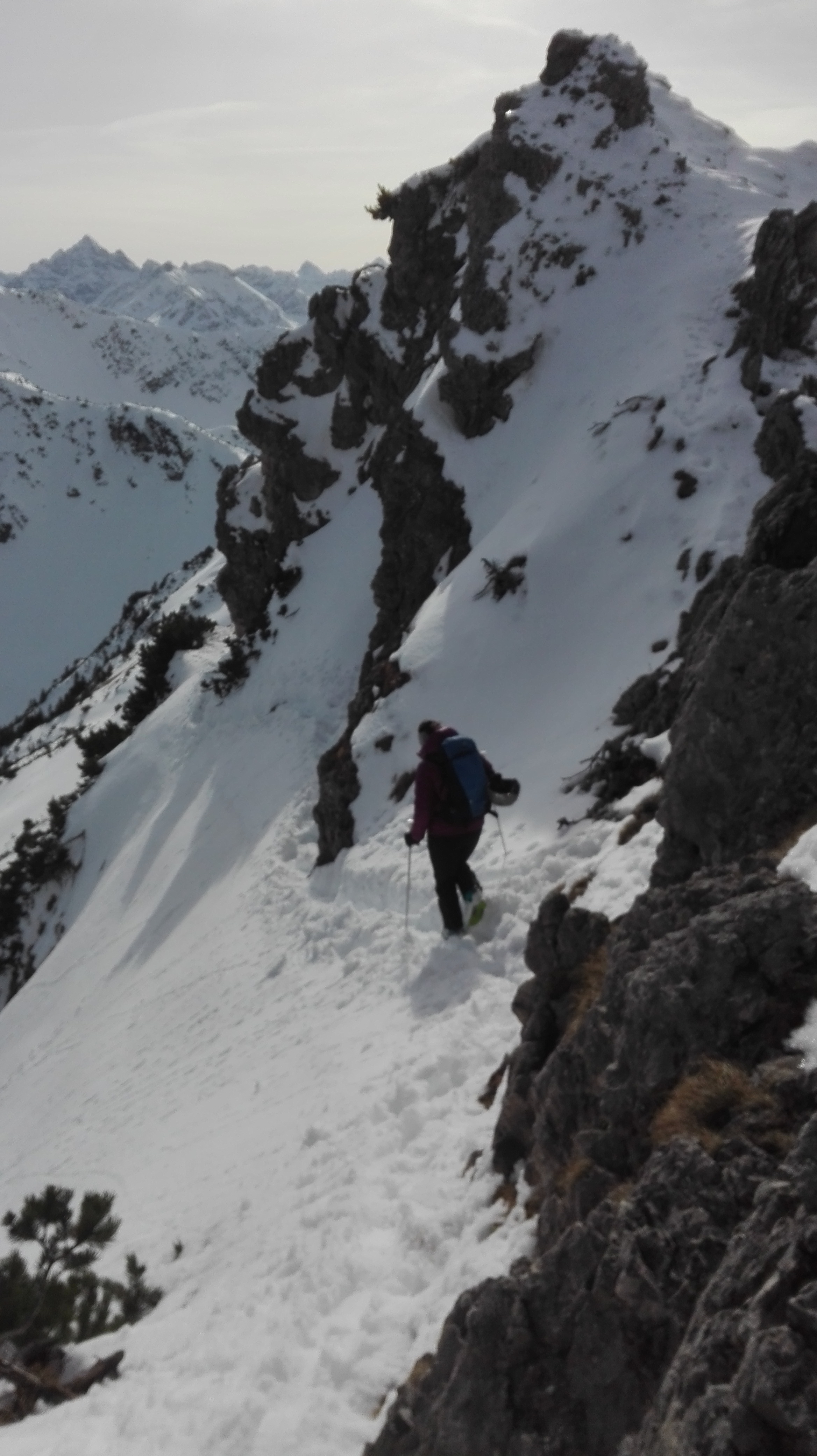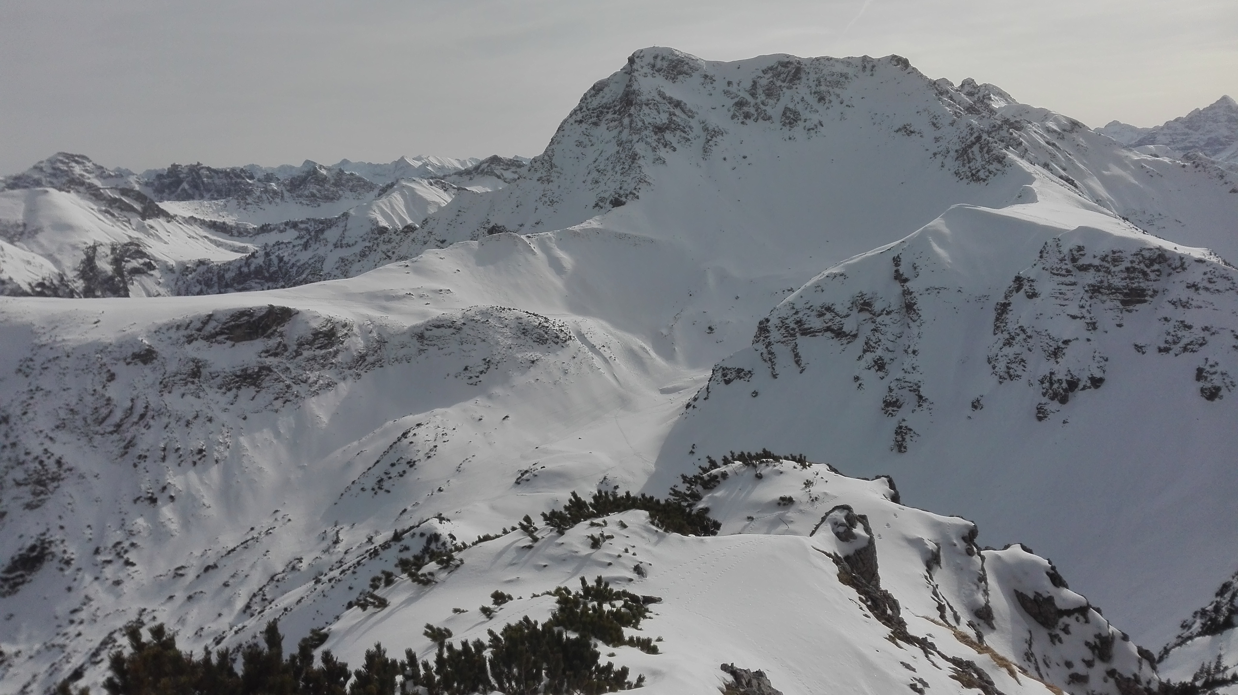 Tourenverhältnisse: gut; Zunächst am Rand der Piste (Nr. 22) bzw. neben dieser bis kurz vor die Bergstation. Dann die blaue Piste etwa 100-200m nach rechts fahren und bei einem Wegweiser nach links in den Wald. Spuren führen auch weiter oben schon in den Wald, dann kaum Höhenverlust. Dann das Pontental entlang, bis sich die Hänge aufsteilen und ostwärts bis zum Skidepot zu Beginn des Südgrats der Rohnenspitze. Zu Fuß ca. 20-30 min zum Gipfel. "Schlüsselstelle" gleich am Anfang eine wenige Meter lange westseitige Rinne, die momentan teilweise vereist ist. Es hängt ein Stahlseil drin. Der Rest ist einfach mit dicker Spur, momentan auch teilweise schneefrei. Abfahrt nicht vom Skidepot über die Westhänge hinab, da hier Bruchharsch war und auch schon einige Steine rausschauten. Daher über den Grat über das Zirleseck und von dort über die Nordhänge abgefahren. Gesetzter Pulver mit hauchdünner Harschkruste, gut zu fahren. In der Nähe des Talgrundes schaut dann wieder vereinzelt Gras raus. Durchs Tal raus bis zur Piste und wieder ins Tal.