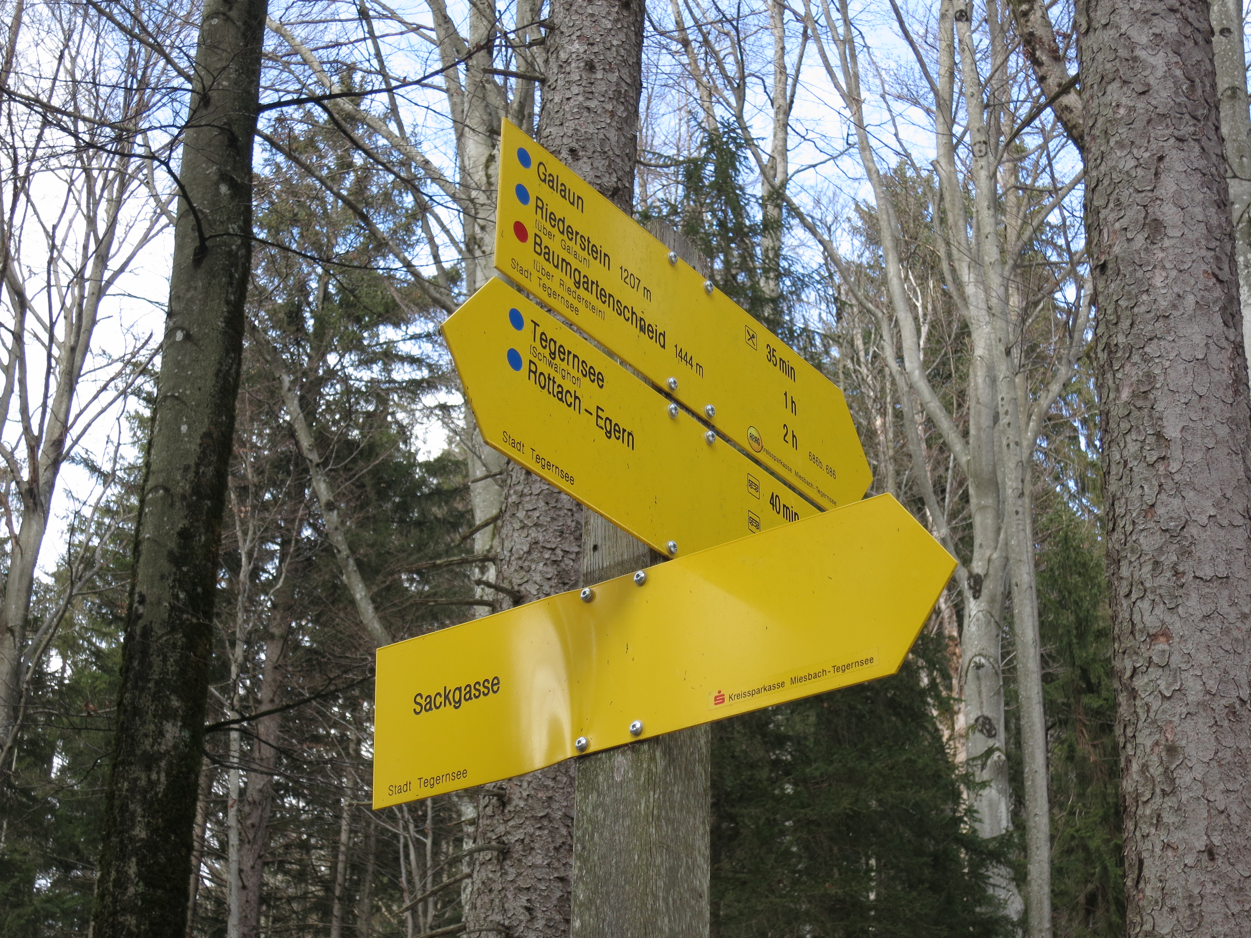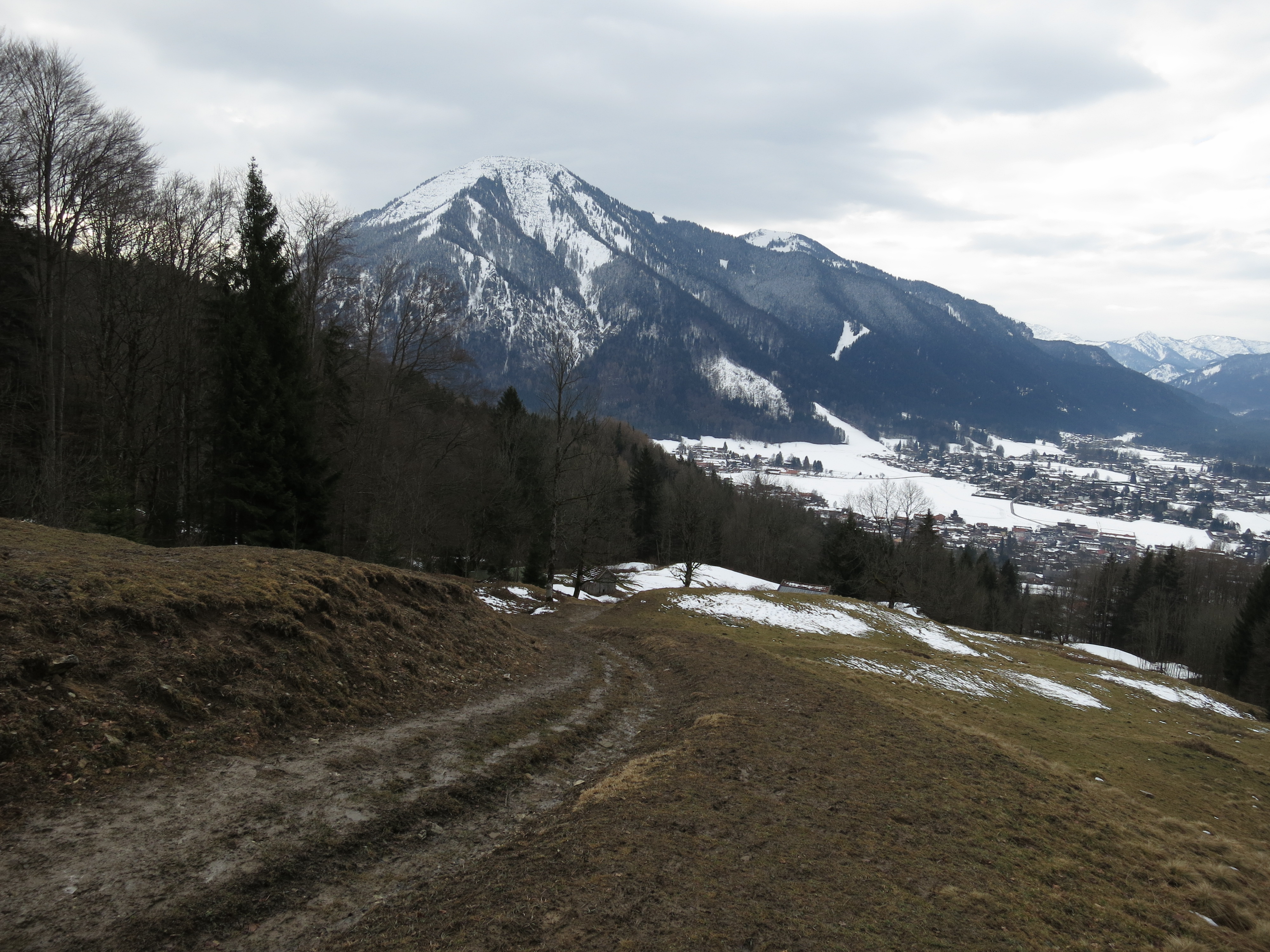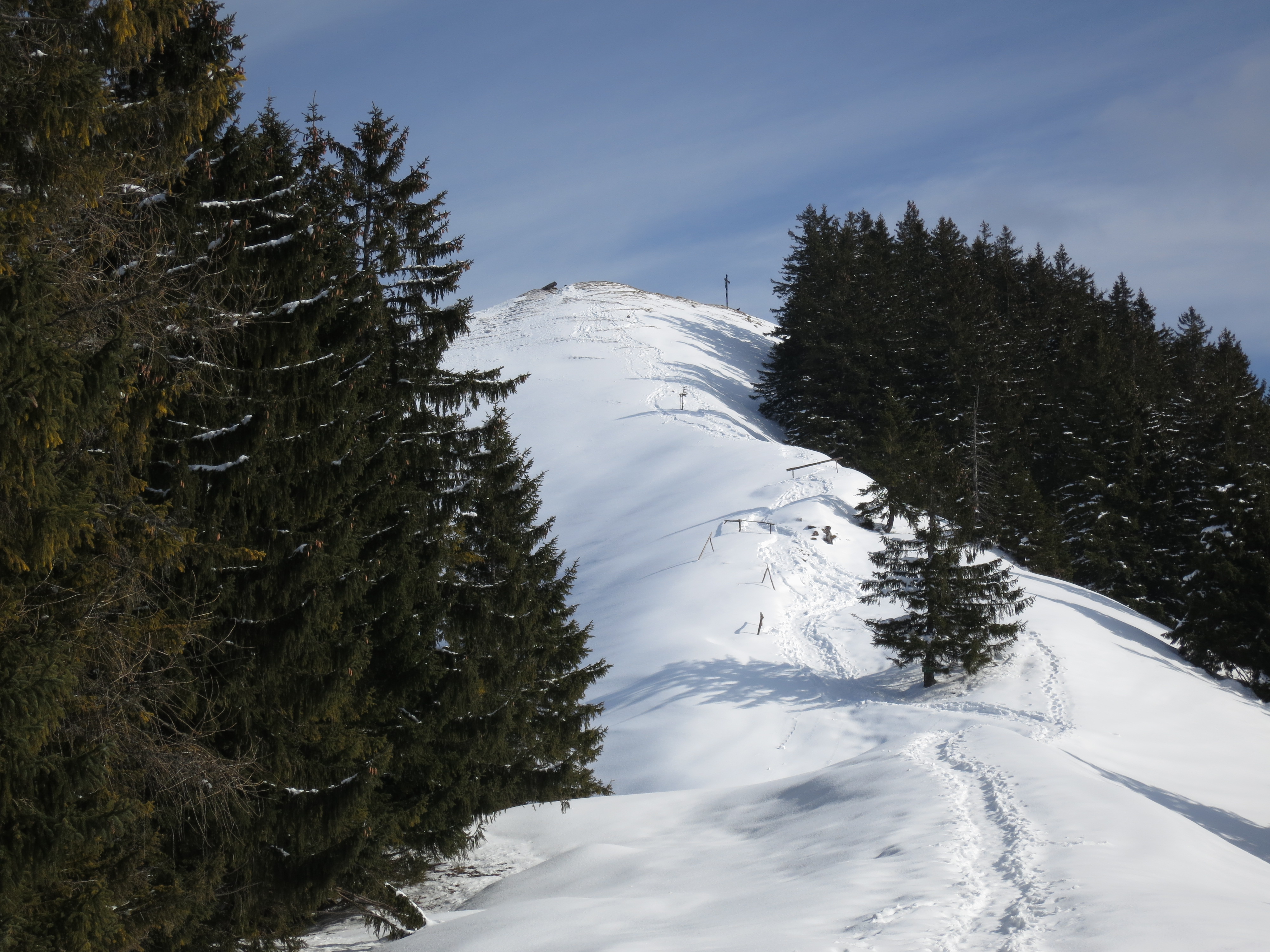 Tourenverhältnisse: Aufstieg über den meist batzigen Waldwirtschaftsweg (Bild 1) zum Gasthof Riederstein, dann weiter über die Riederstein-Kapelle zum Gipfel. Ab Gasthof meist festgetretener Schnee bis zum Gipfel (Gipfelhang Bild 2). Am Gipfel war's heute sehr windig, so dass ich die Gipfelrast eine Etage tiefer verlegt habe. Abstieg bis zu der ebenen Fläche unterhalb des Gipfelhangs, hier dann nach links (Süden) auf unmarkiertem Weg (Spur vorhanden) weiter, bis man die Fahrstraße vom Gasthaus zum Parkplatz erreicht. Ab der Abbiegung nach Süden anfangs durchfeuchteter Schnee, später dann so quasi schneefrei, aber dafür auch etwas batzig (aber besser als der Waldwirtschaftsweg). Grödeln oder Gamaschen waren heute nicht nötig.