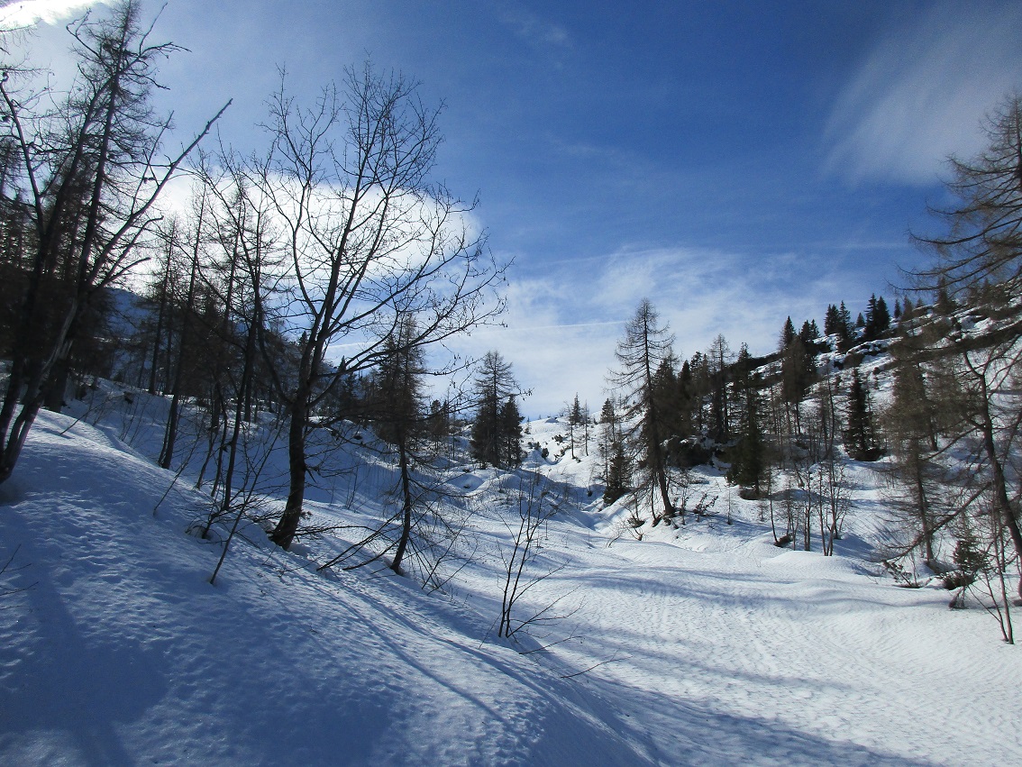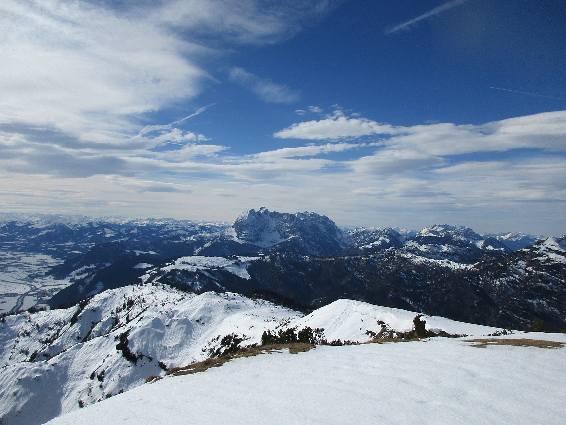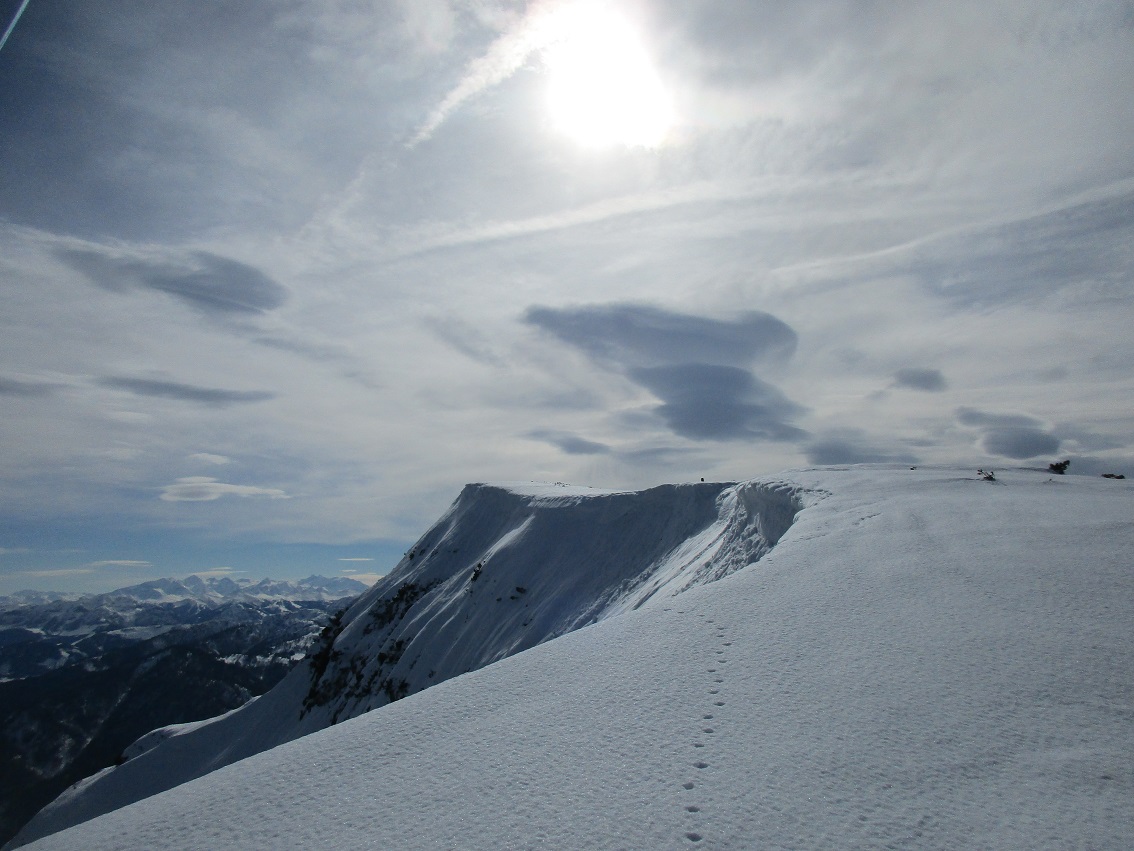 Tourenverhältnisse: Eigentlich ganz gut / genügend Schnee / kein Steinkontakt / im obersten Teil Bruchharsch / sonst sehr sulziger Schnee / tolle Aussichten / keine Leute unterwegs / oben recht stürmischer, aber warmer Wind / Abfahrt von oben ab immer besser werdend
