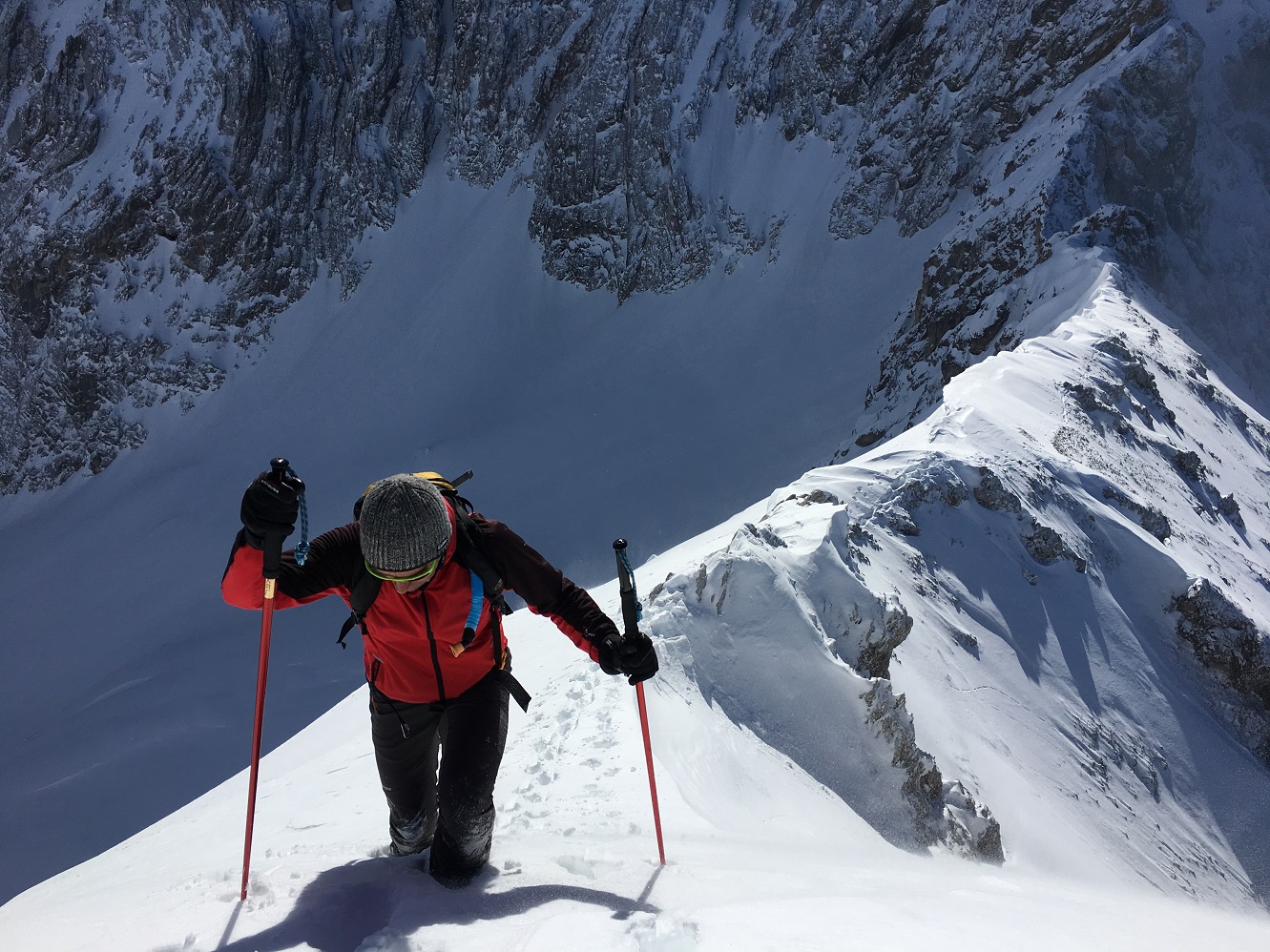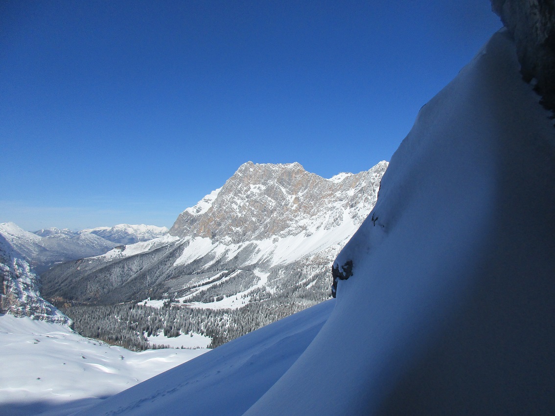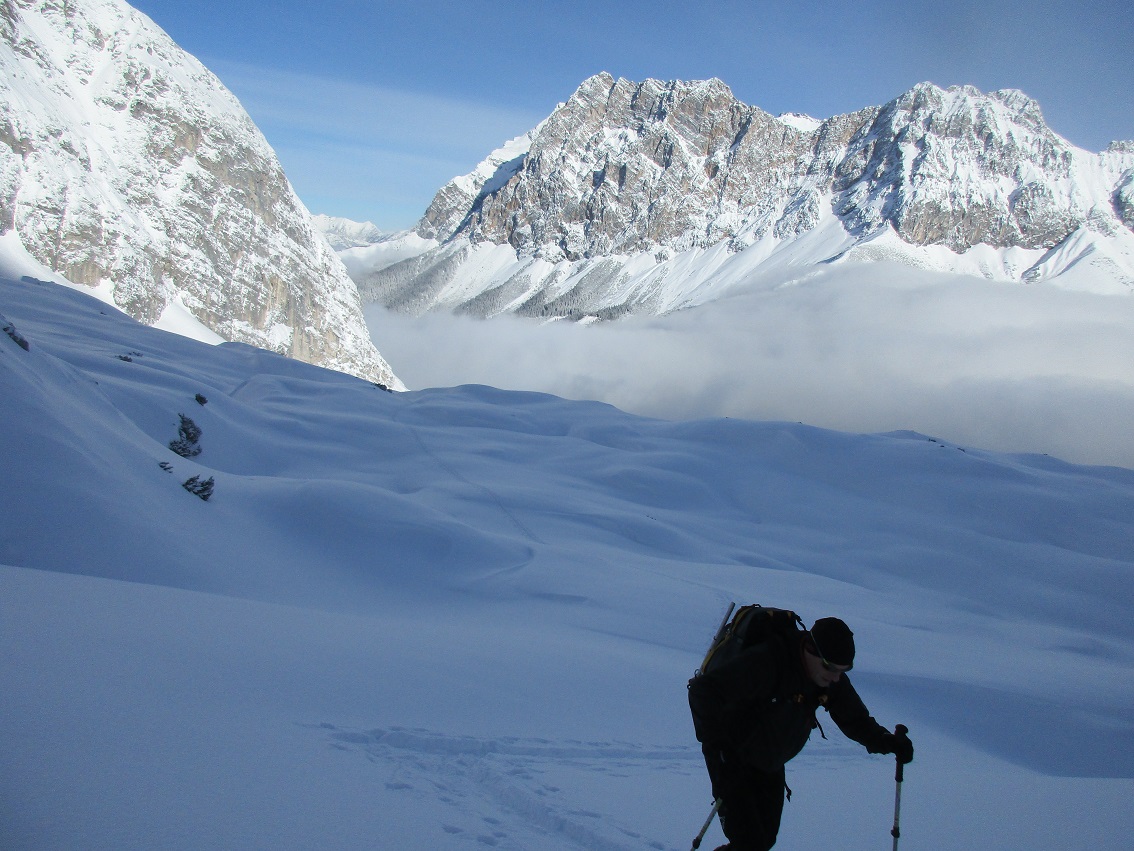 Tourenverhältnisse: Sehr, sehr gut / gute 20 cm trockener Pulver auf tragendem Altschnee / durften spuren / finaler Gipfelanstieg zu Fuß / oben eisige Temperaturen mit kaltem Ostwind / superschöne Abfahrt ... es geht nicht besser / letzter Teil der Abfahrt über Piste