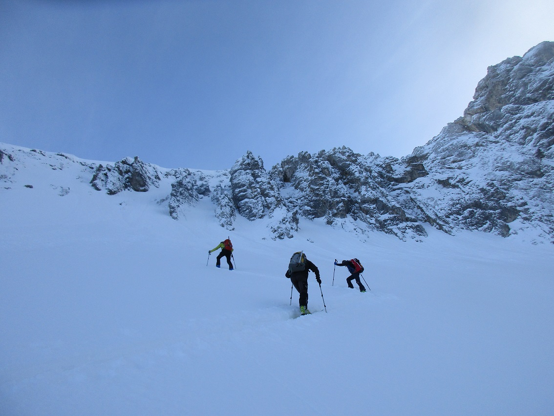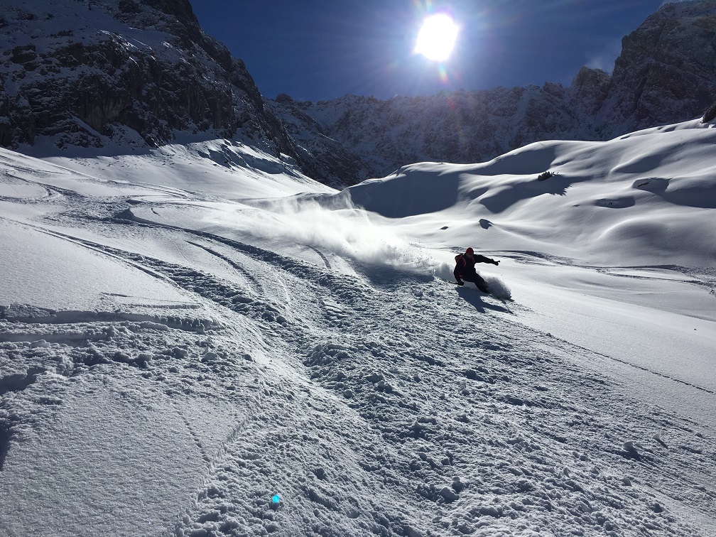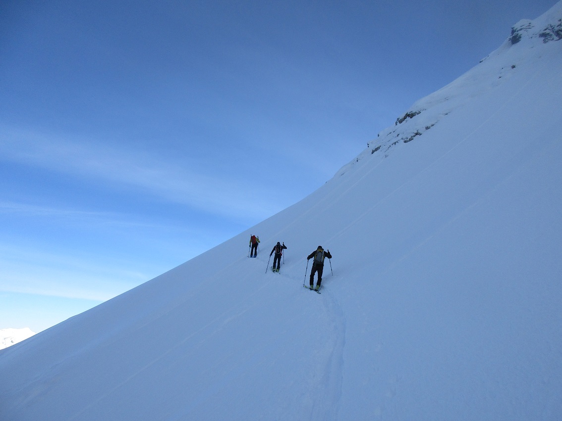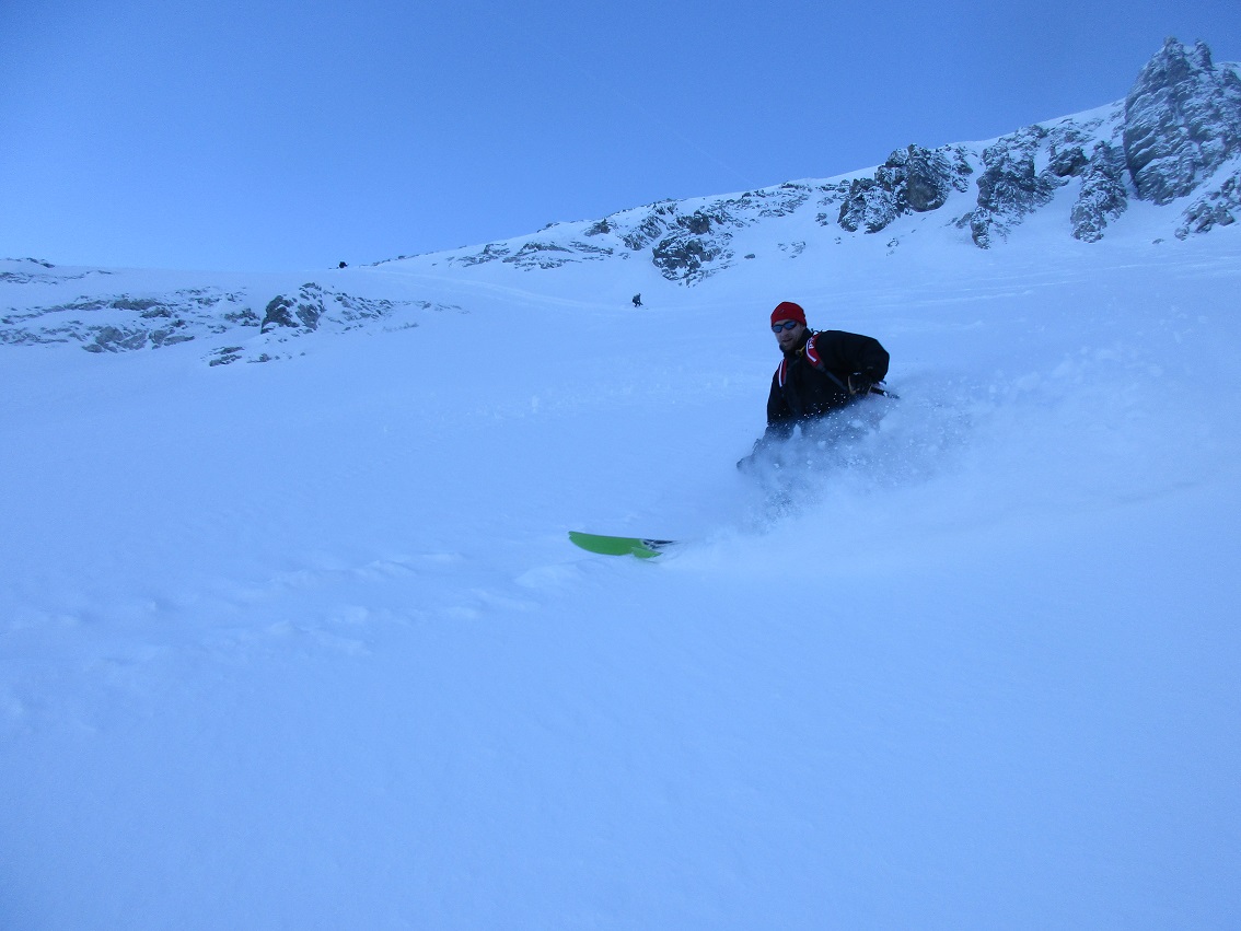 Gefahreneinschätzung: Altschnee liegt gut und sicher / Neuschnee meist gut verbunden ... ein paar unproblematische oberflächliche Neuschneerutschen gab es trotzdem / Abfahrt ohne Feindkontakt / keine Anfängertour !