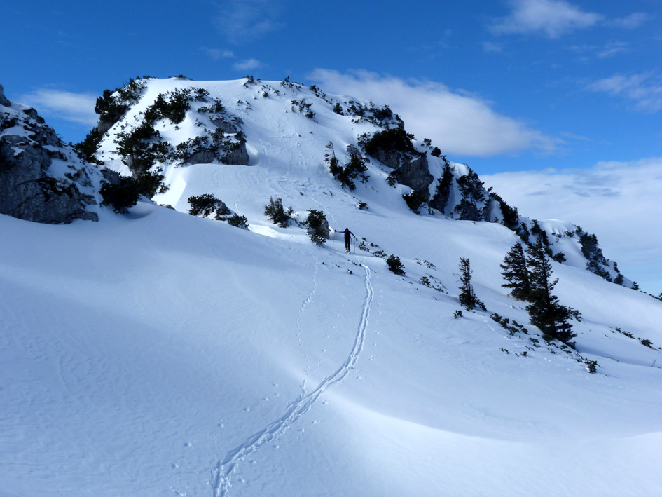 Gefahreneinschätzung: LWS 1, Lawinengefahr weitgehend gering. In den Steilpassagen oberhalb vom Rothörlsattel (wir haben den Klettersteig links umgangen) ist der Neuschnee nur mäßig mit der festen Altschneeunterlage verbunden - dadurch vor allem im Aufstieg Abrutschgefahr in der Nähe von Felsabbrüchen, mehrmals haben wir sicherheitshalber die Skier auf die Rucksäcke geschnallt.