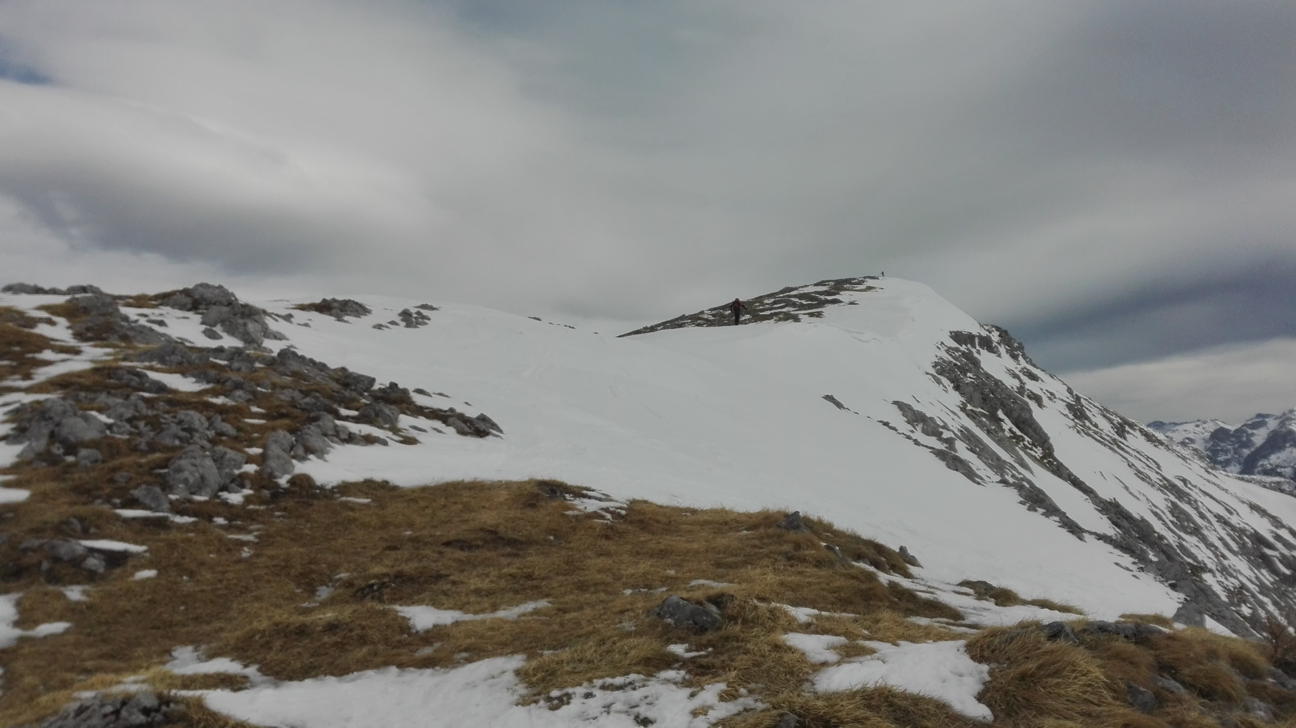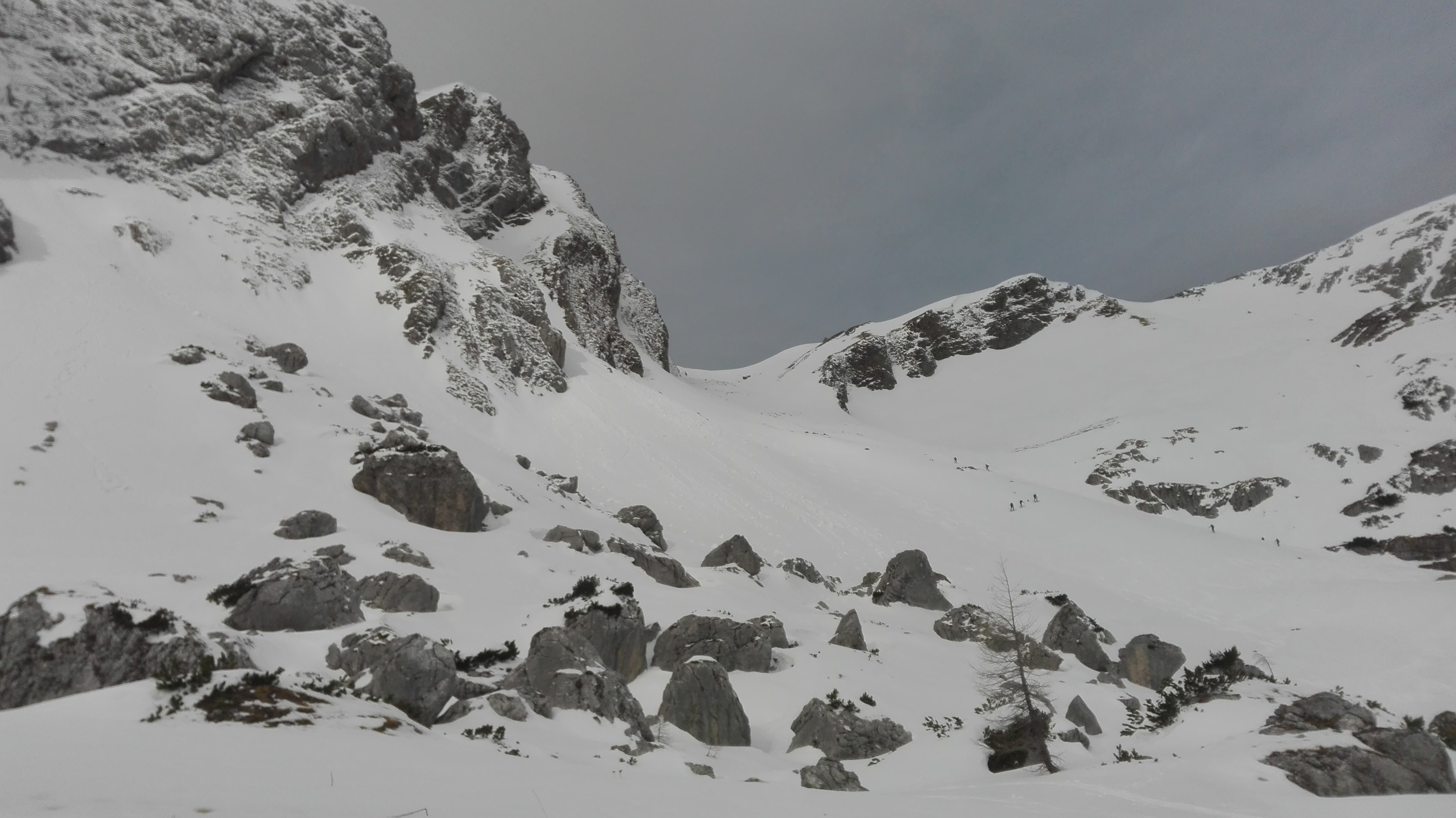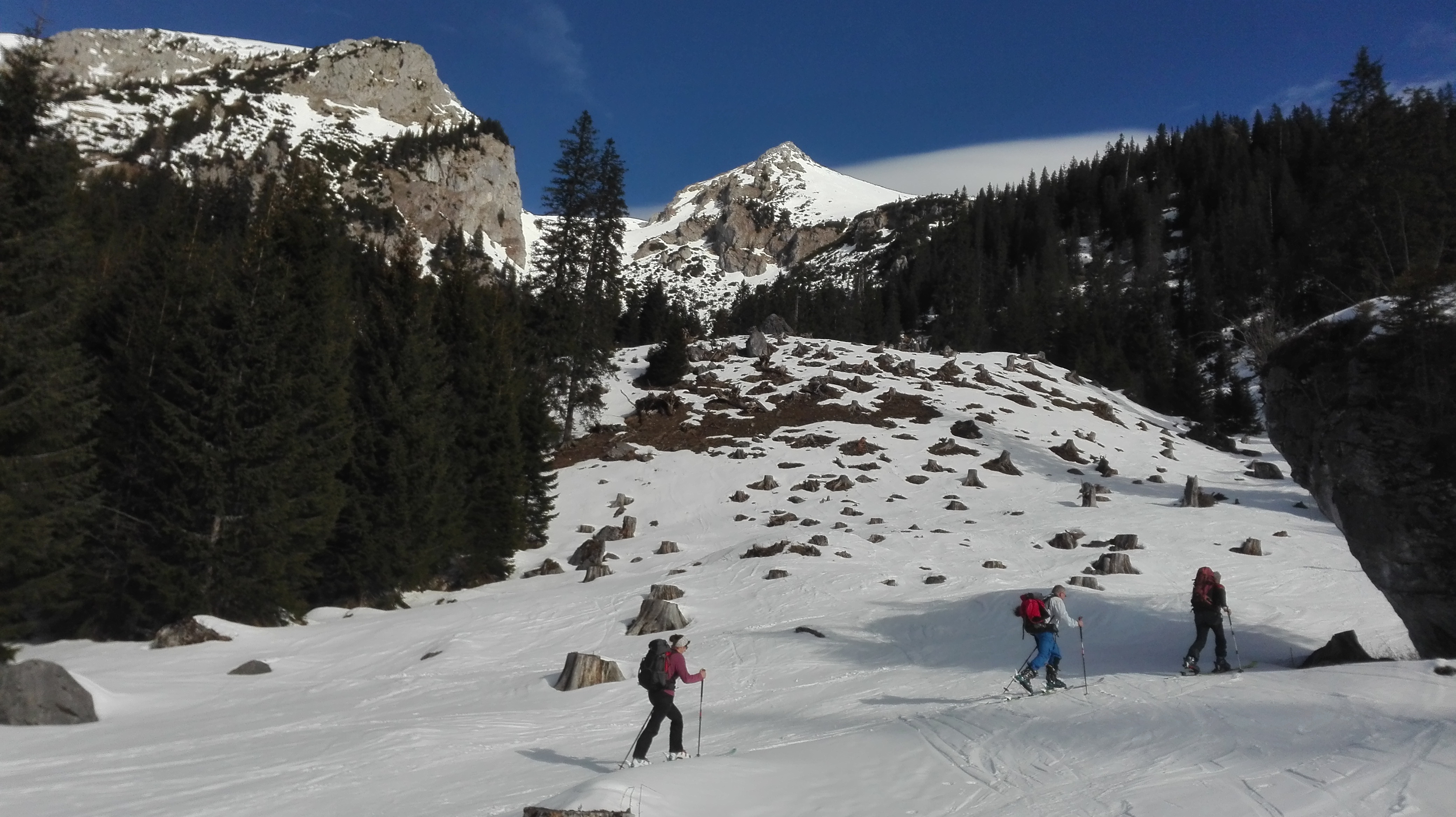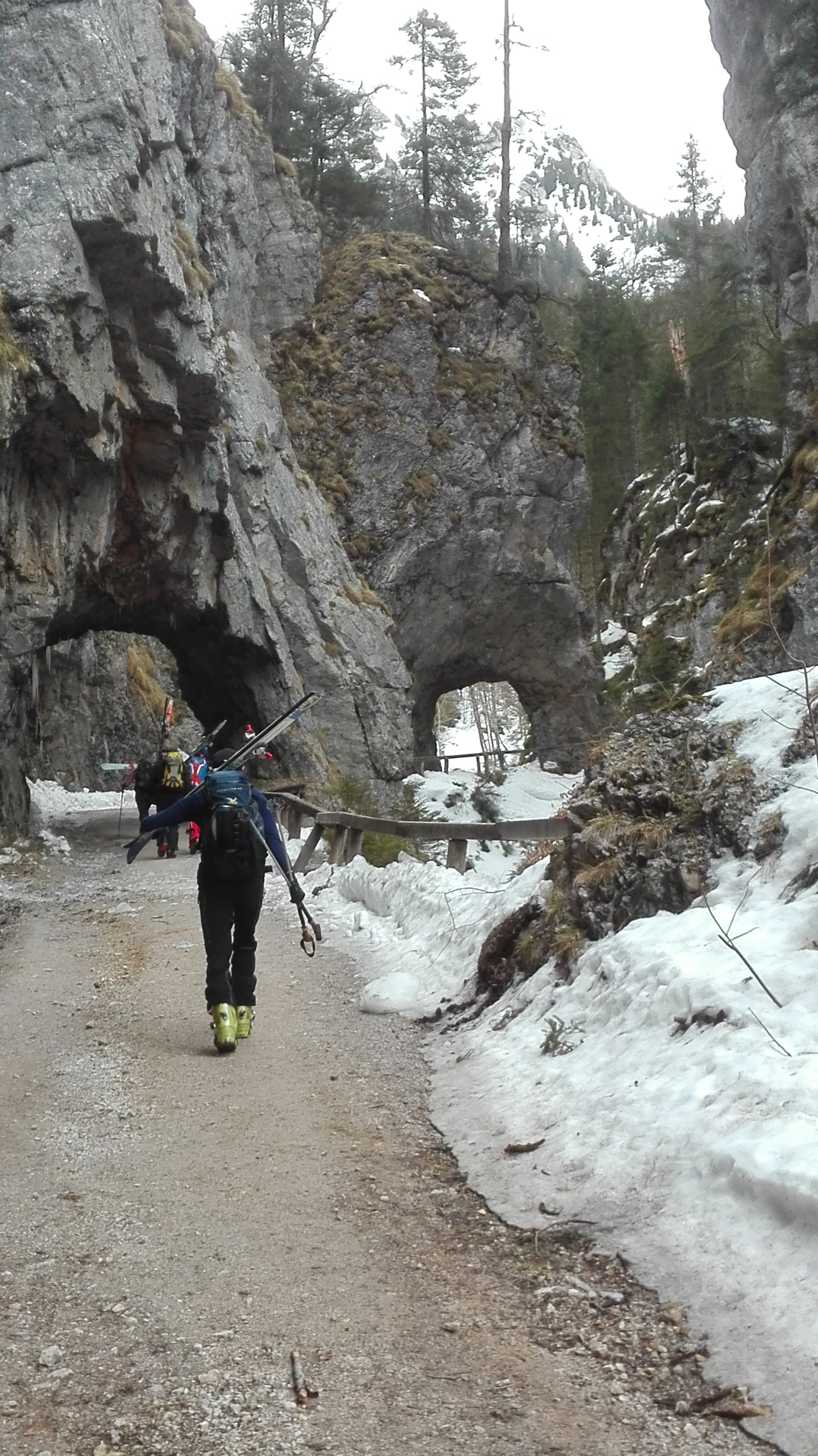 Tourenverhältnisse: Am Beginn etwa 10-15 Minuten durch eine Klamm Ski tragen bis nach zwei kurzen Tunnels. Über Forststraßen und durch Wald zur Pfarralm. Von dort nordwärts durch eine breite Waldschneise und über den folgenden Latschenhang in ein Kar. Im Kar hoch zu einem flachen Boden und oberhalb entweder linkshaltend (nordwestlich) in den Sattel am Beginn des Gipfelgrates der Stadelfeldschneid (so vorallem, wenn man diese mitnehmen will) und nach rechts über den gesamten Grat zum Gipfel oder besser gleich eher rechts haltend direkt nordwärts auf den obersten Gipfelgrat der Gsuchmauer und über diesen nach rechts zum höchsten Punkt. Abfahrt wie Aufstieg. Dank der Südexposition der Hänge "firnähnliche" Schneeverhältnisse.