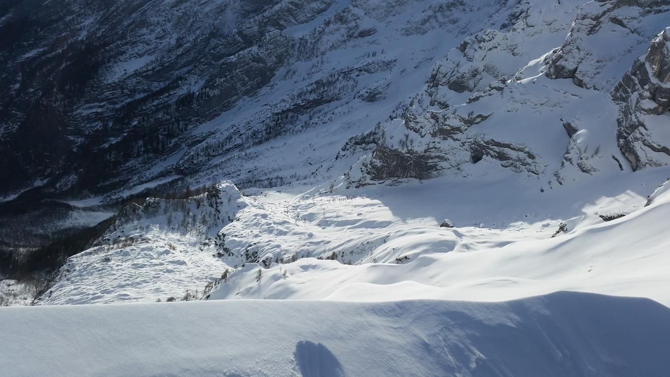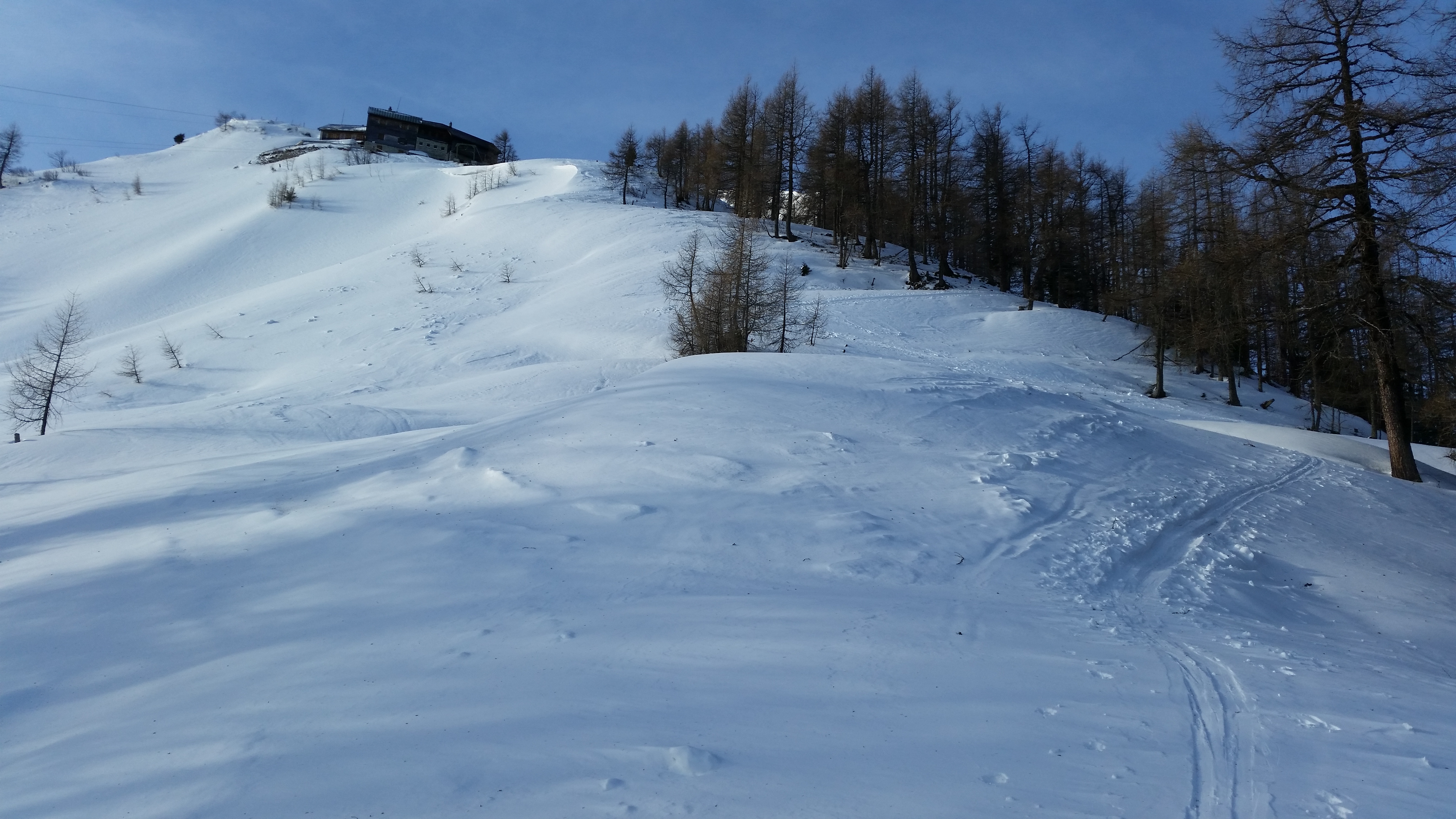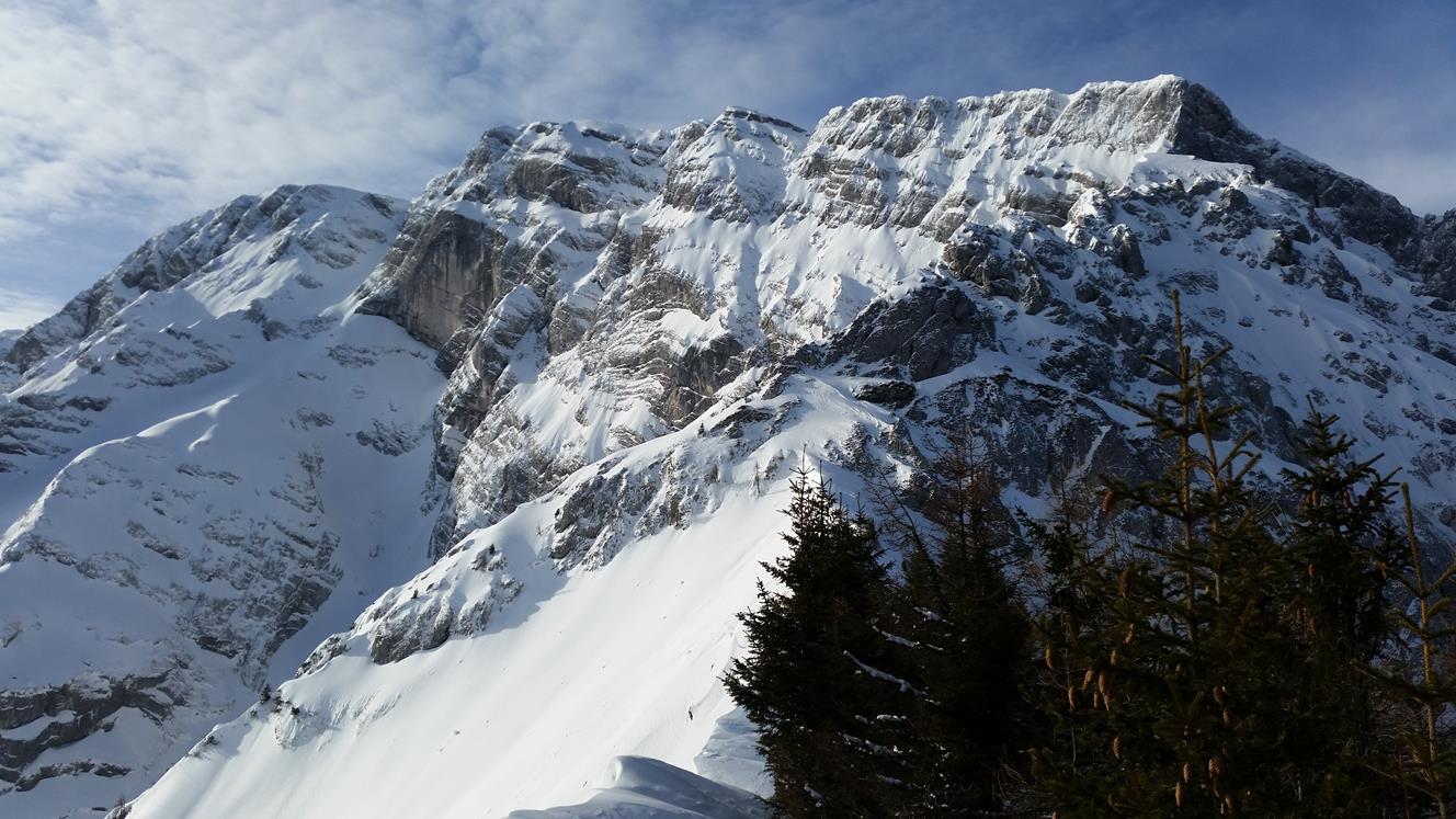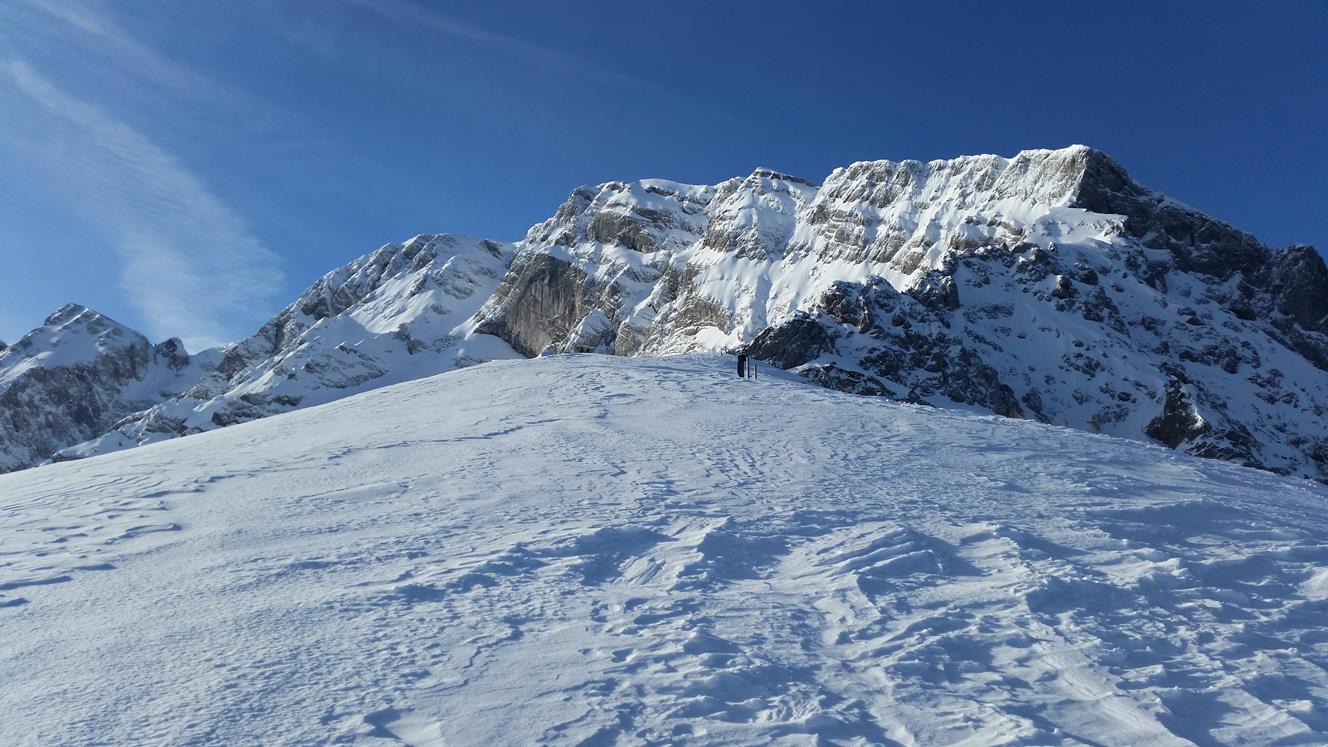 Tourenverhältnisse: Im Aufstieg Rutschig zum gehen. Abfahrt Eisig, Harschdeckel, Windbehandelter Pulver.