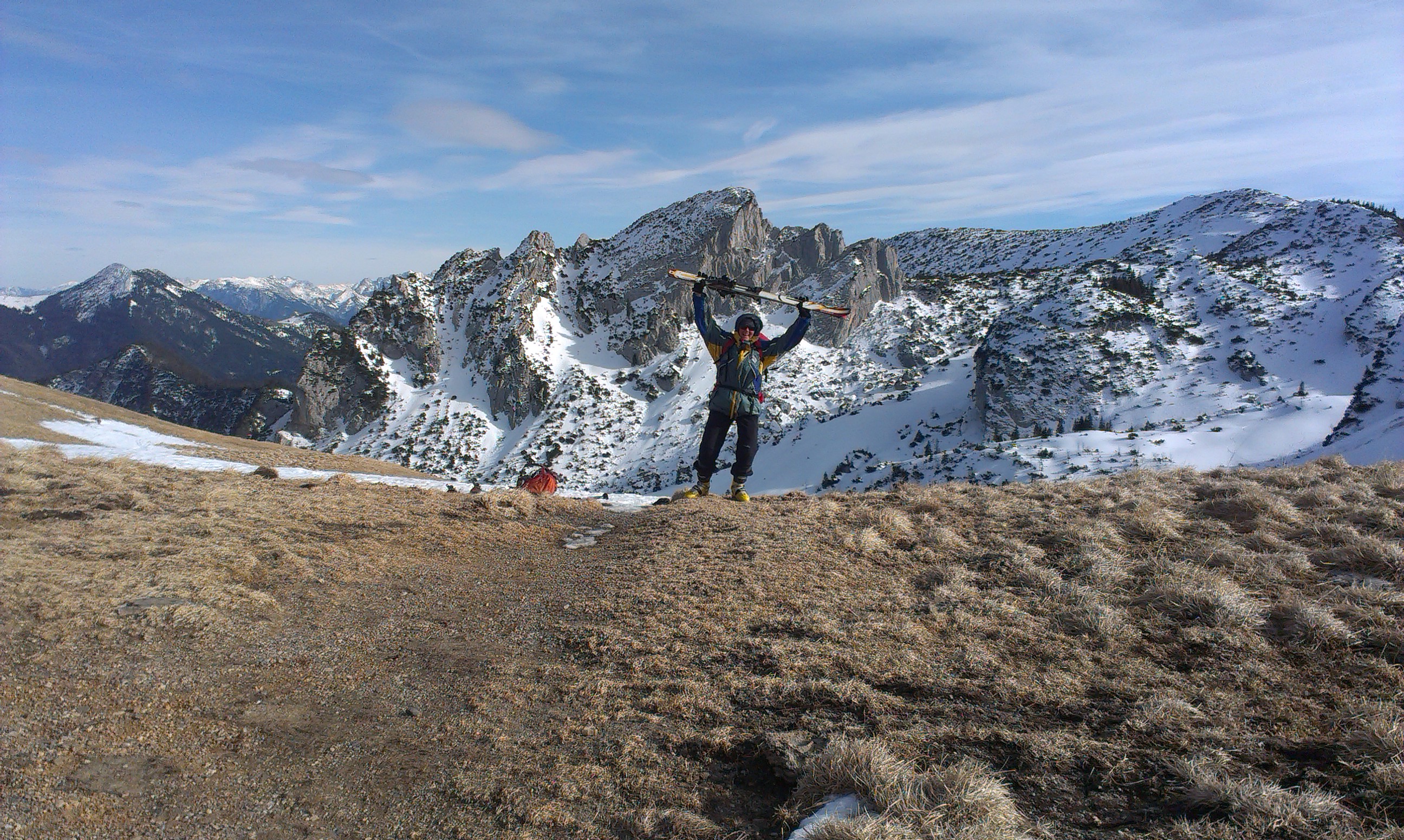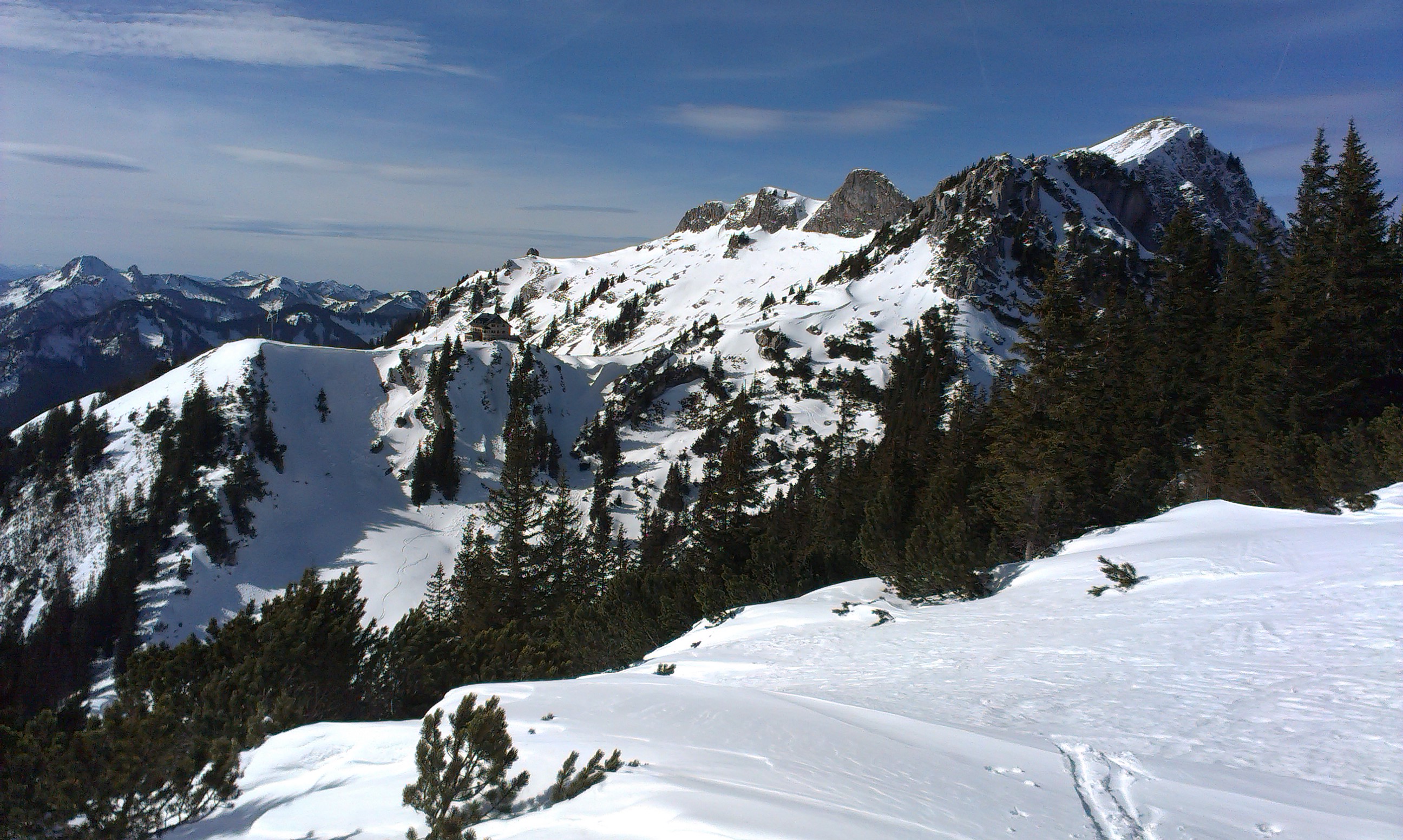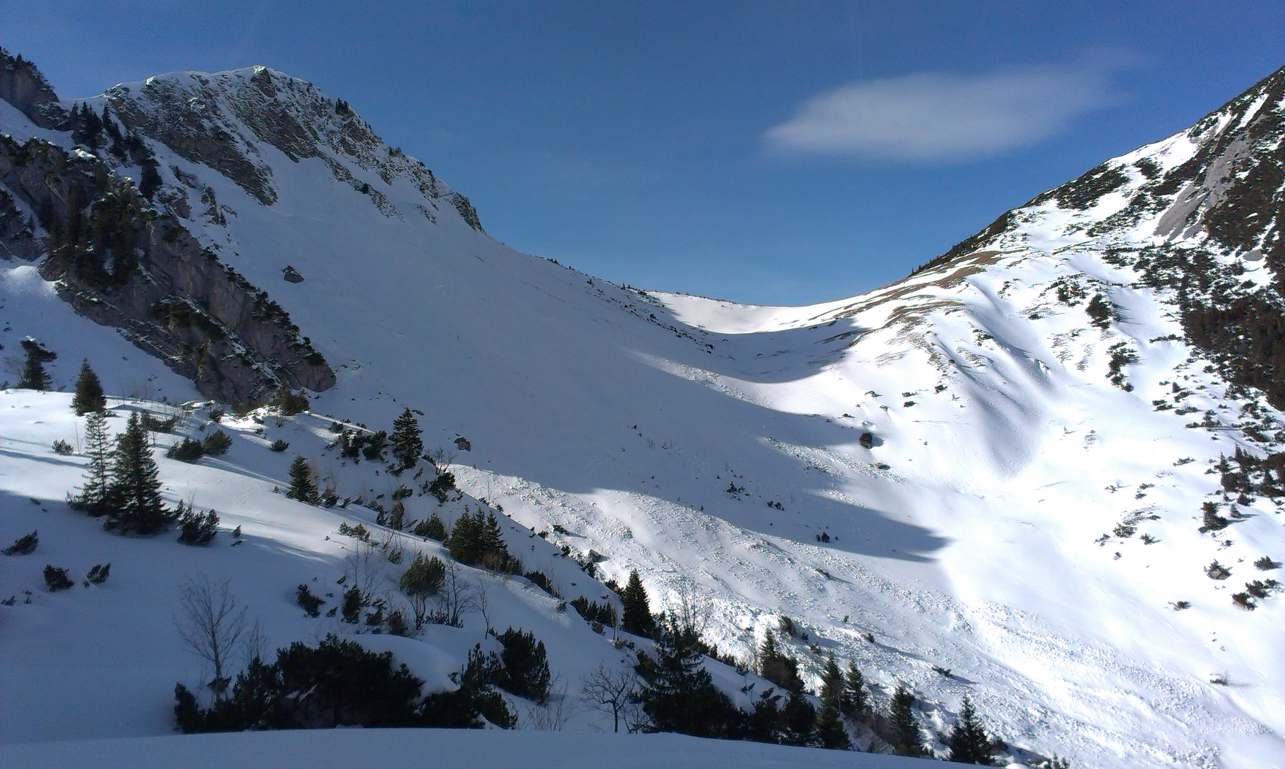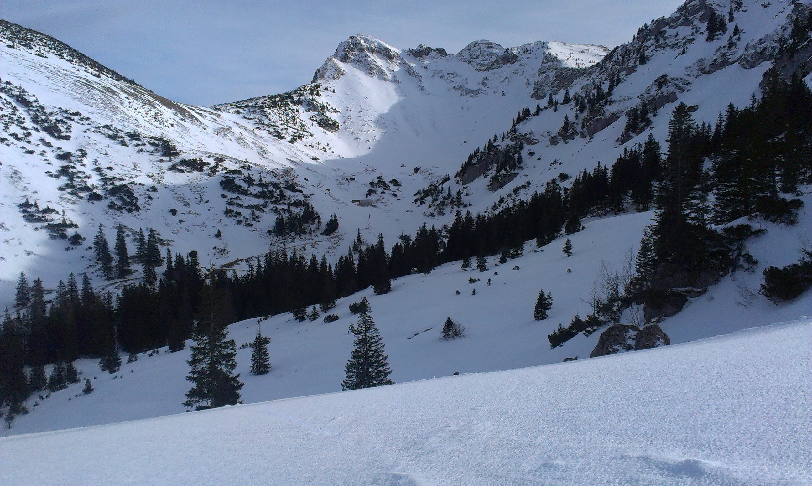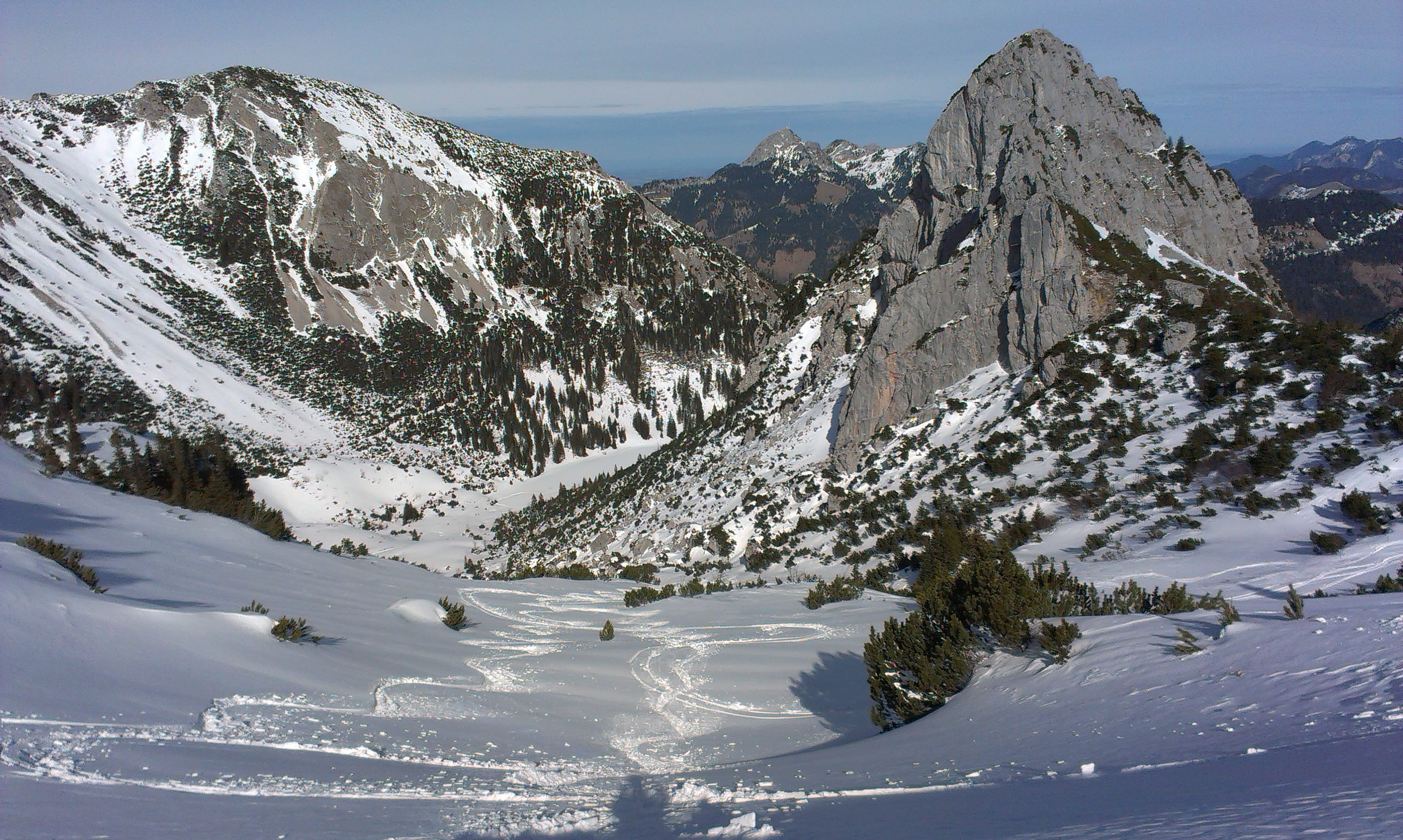 Tourenverhältnisse: bis zur Bergwachthütte muss man die Ski tragen, danach durchgehend Schnee. Alle Schneearten waren heute anzutreffen, von Butterfirn über gesetzten Pulver, Bruchharsch und gefrorenen Abschnitten. Von den Bedingungen her wie eine Spätfrühjahrstour. Die Abfahrt von der Rotwand durch die Ostrinne ist derzeit nicht zu empfehlen, da der gesamte Hang als Lawine abgegangen ist.