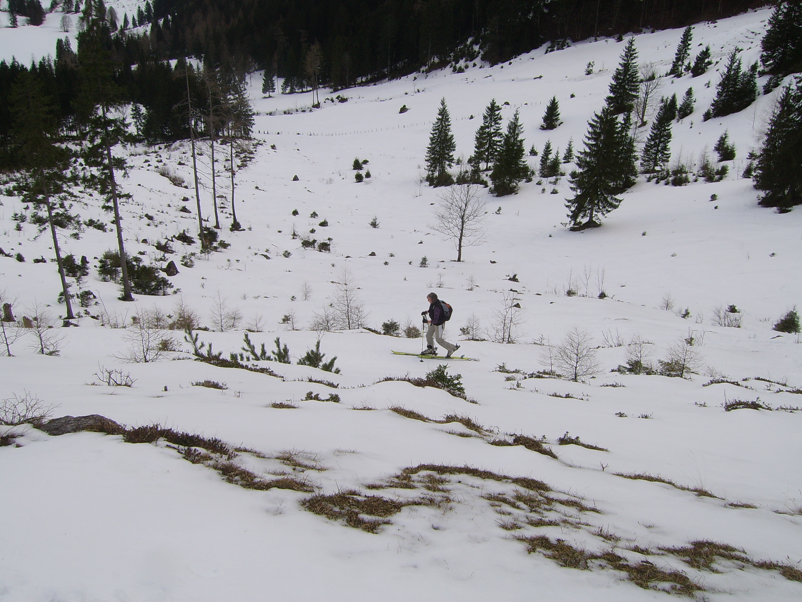 Tourenverhältnisse: vom P weg mit Ski; 2 kurze Unterbrechungsstellen wg Straßenüberquerung; ausreichend Schnee auf der Tour (am 1. Steilaufschwung wirds allerdings etwas knapp); im Grunde 3 verschiedene Schneearten: unten harte Harschunterlage, Mittelteil Bruchharsch, 'Gipfel'-Hang weicher Pappschnee auf harter, harschiger Unterlage. Entsprechend war die Abfahrt um 10:30 Uhr: -oben sehr schön, -im Mittelteil na ja, -unten leicht angefirnt. Aus den, von der Sonne erreichten, Süd- und SO-seitigen Felsen und Rinnen kamen etliches an Schneeboller runter. Kaum Wind spürbar im Kar. Bei der Heimfahrt im Inntal 20°