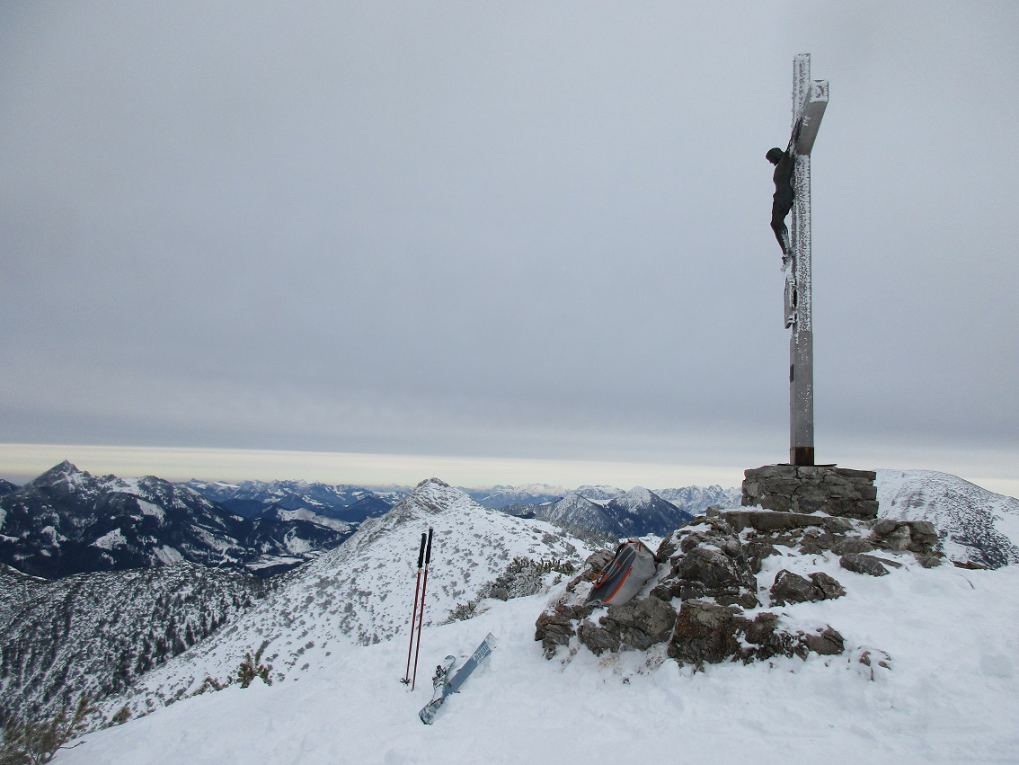 Tourenverhältnisse: Gut / Neuschnee 20 - 30 cm / Pulver - unten teils mit Stich / Droben kalter, starker Südwind / man findet für die Abfahrt noch unberührte Abschnitte
