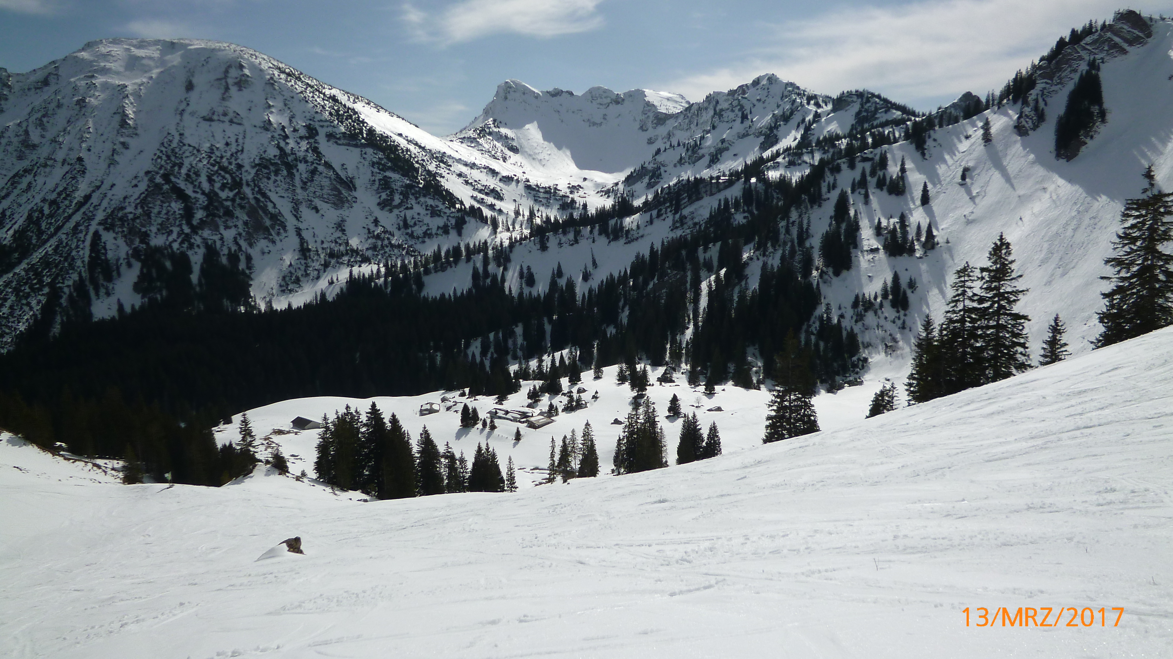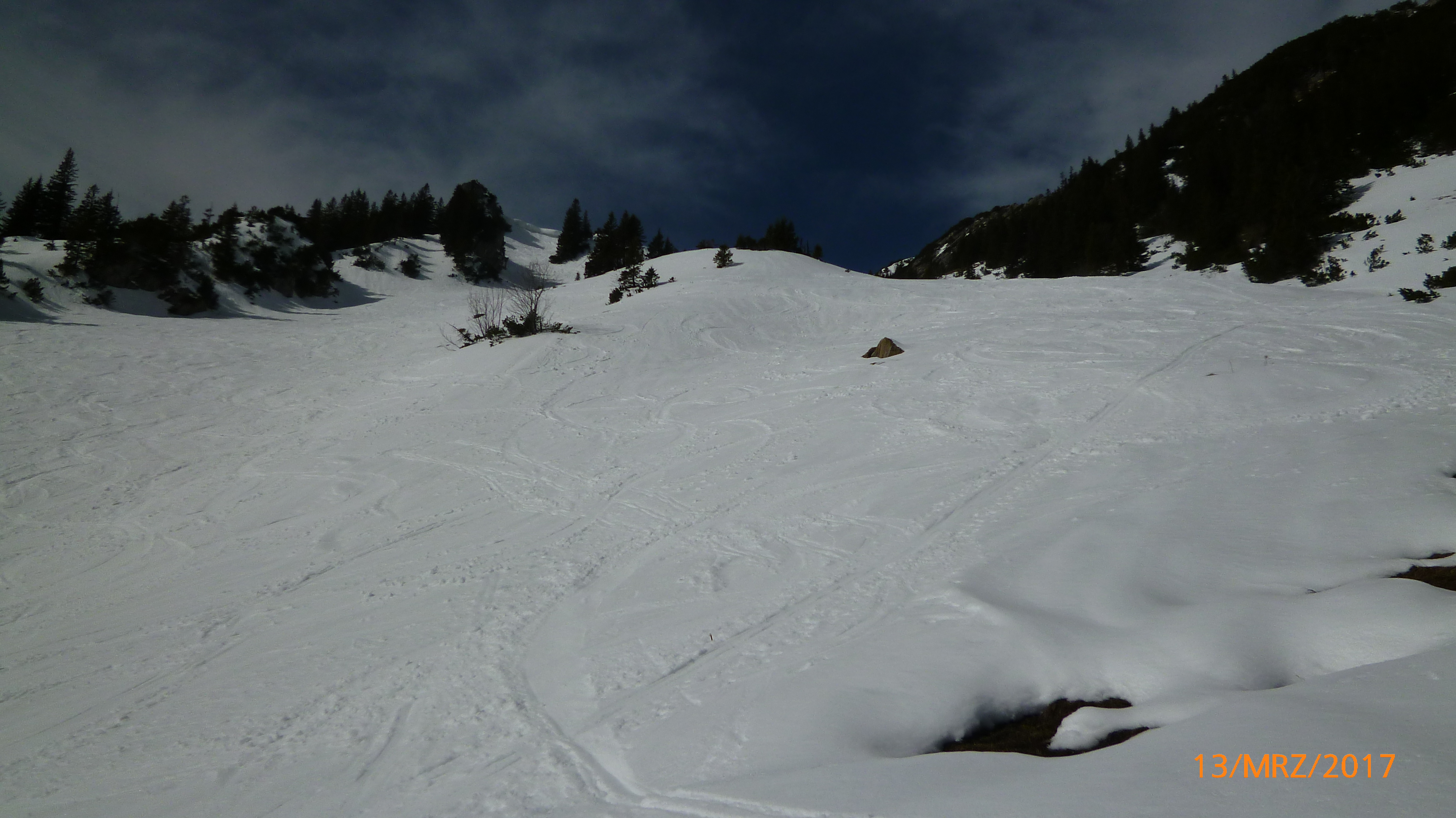 Gegen 14.oo Uhr Abfahrt über Lochgraben, rechts haltend, schön firnig. Buckelpiste unten kaum Sonneneinstrahlung, ziemlich boanig.