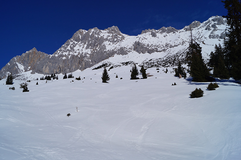 Tourenverhältnisse: Am Morgen überraschenderweise eine sehr starke Bewölkung angetroffen, daher hat es auch nicht so richtig durchgefroren. Insgesamt war es sehr warm, um ca. 9:30 Uhr hat es dann aufgerissen und die Sonne war dann sehr stechend und unangenehm heiß. Während des gesamten Aufstiegs war die Schneedecke bereits weich. Abfahrt um 10:30 Uhr dann aber im perfekten Butterfirn (gerade noch rechtzeitig) über die Feldern Alm bis ins Gaistal hinunter. Anschließend Gegenanstieg zur Pestkapelle hinauf und Abfahrt über die total aufgezulzte Piste ins Tal.