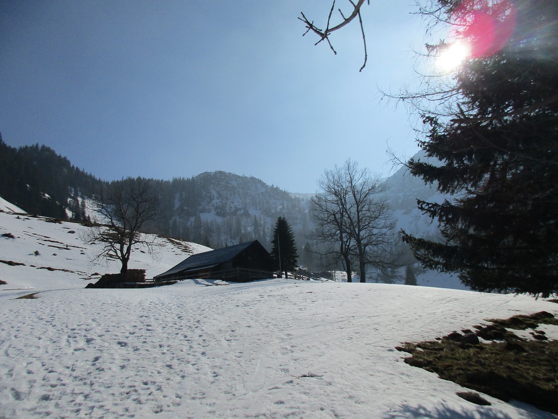 Tourenverhältnisse: Frühlingshafte Temperaturen / windstill / keinen Menschen gesehen oder getroffen / genug Schnee / wo die Sonne wirkt leicht sulzig sonst eher hart : tragender fester Harschdeckel / Abfahrten im oberen Teil sehr hart ... die Oberschenkelmuskulatur wird gefordert !