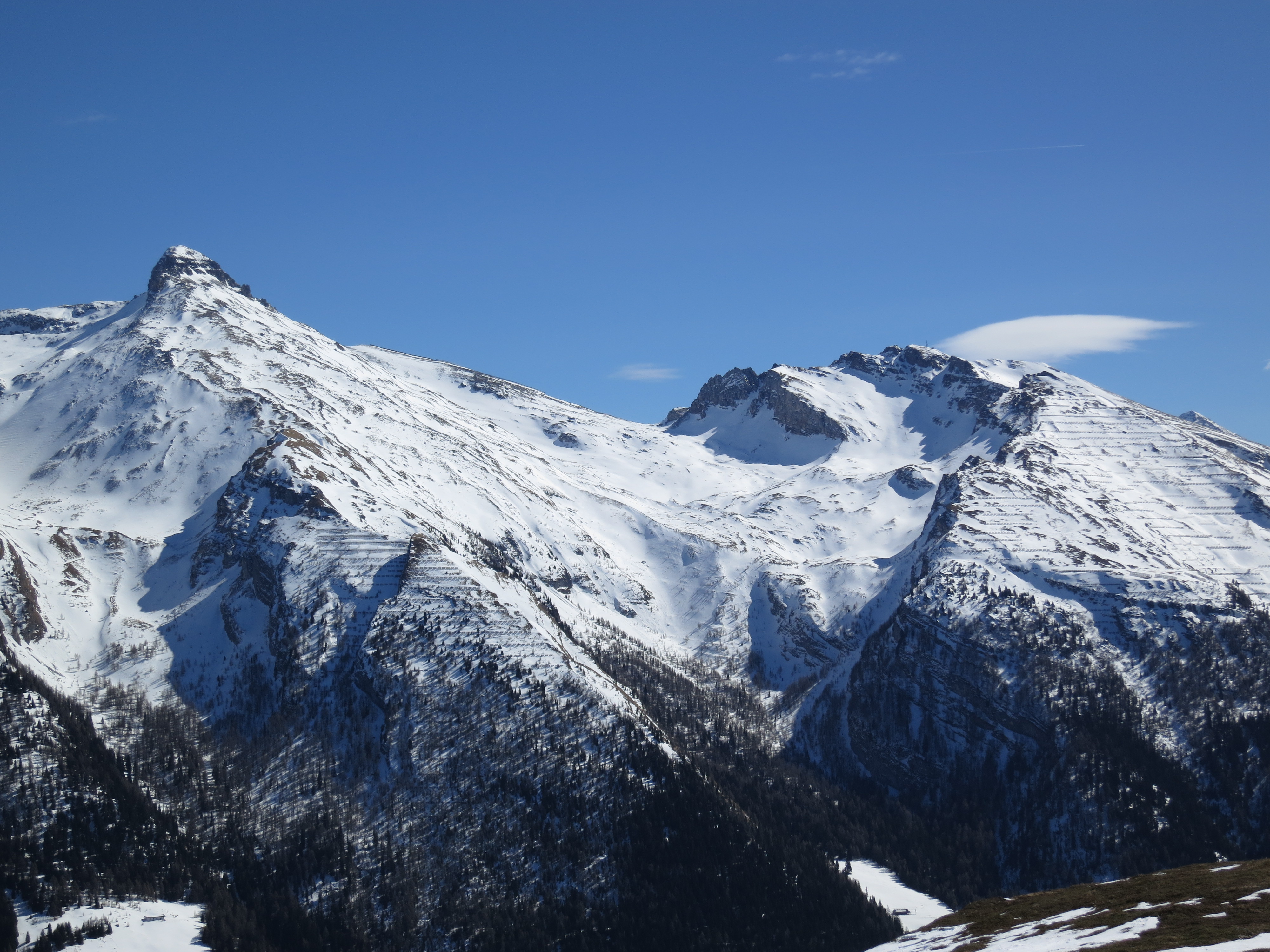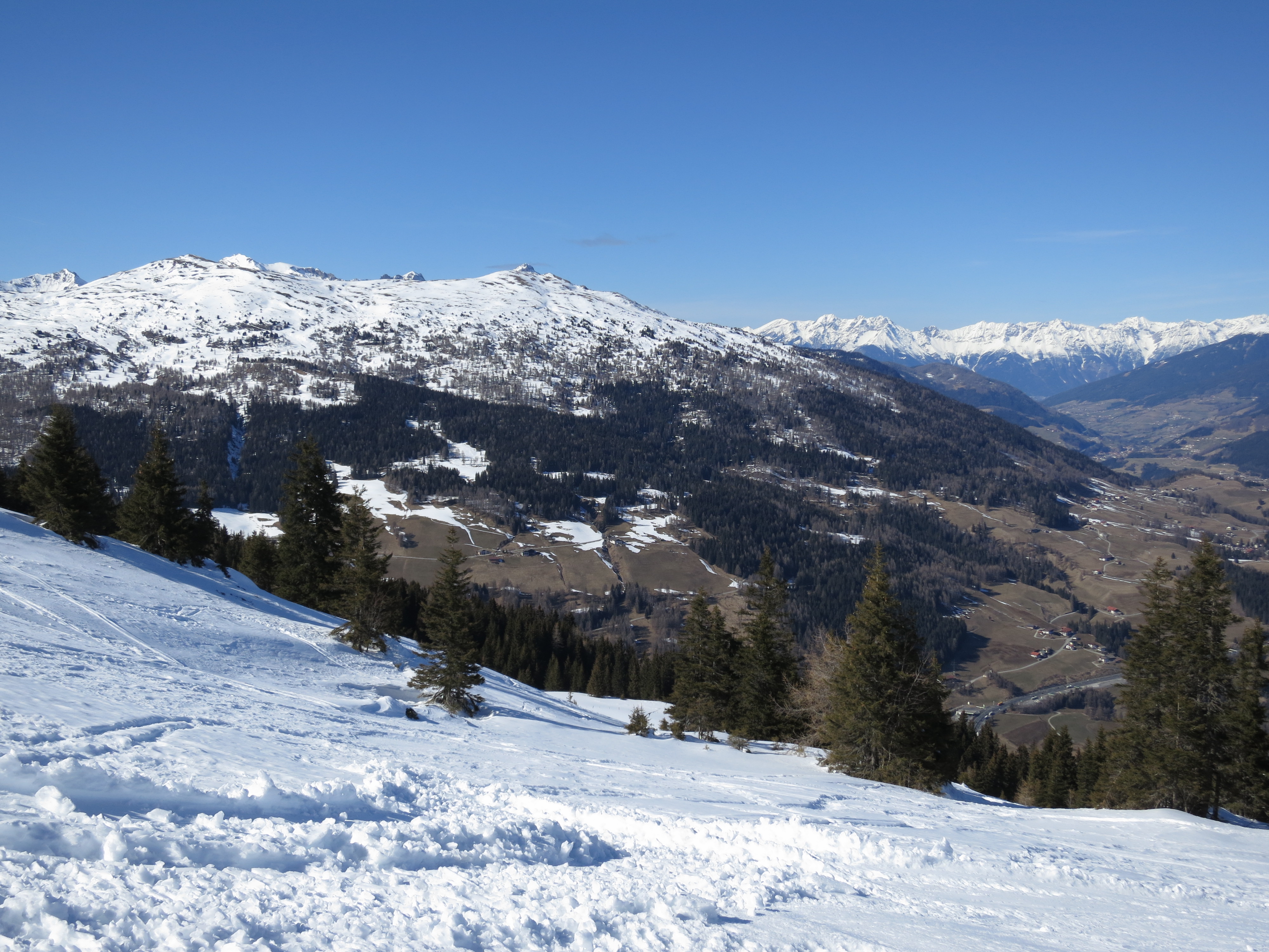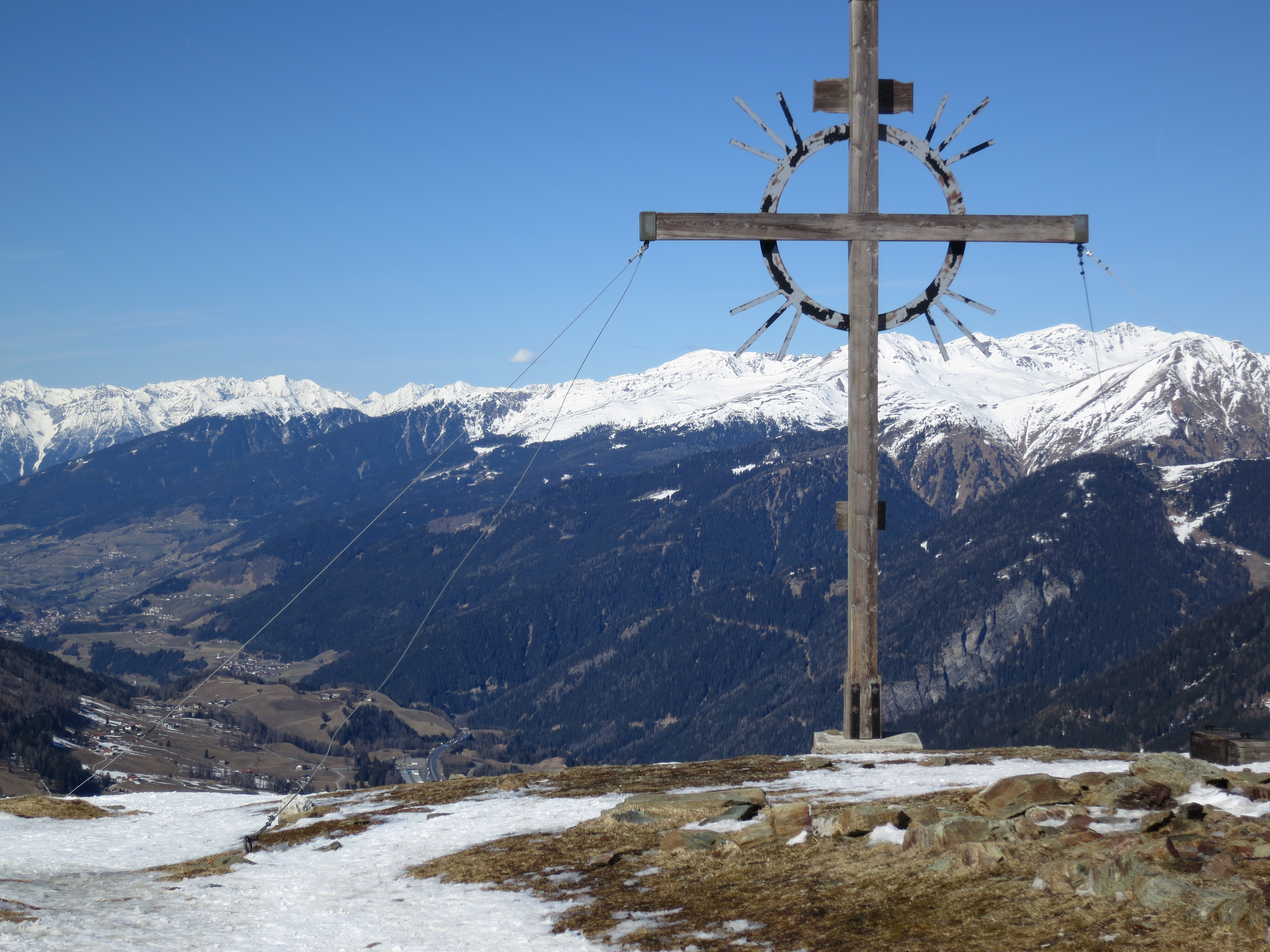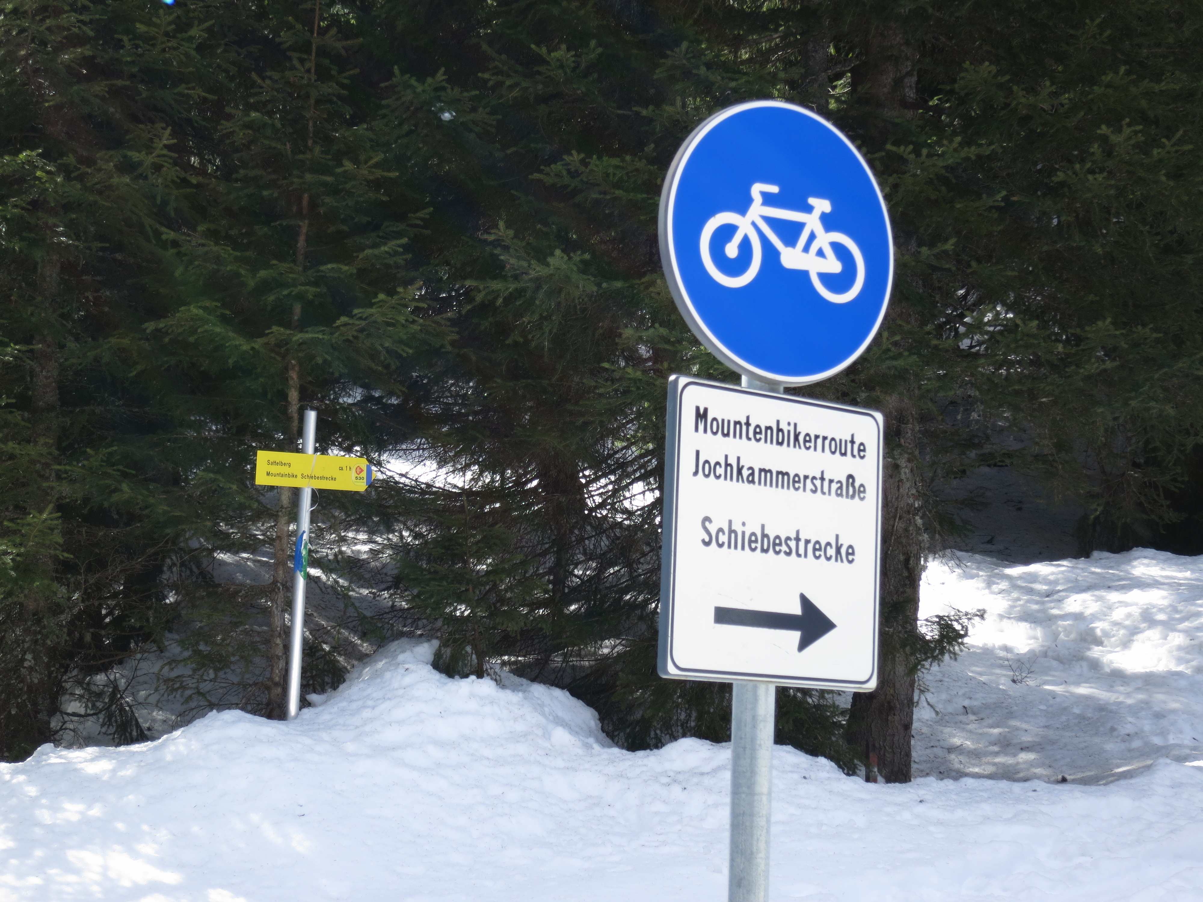 Tourenverhältnisse: Aufstieg auf der (ehemaligen) Piste bis zur Sattelbergalm. Von der Sattelbergalm dann auf einem Ziehweg eben ein Stück Richtung Süden, bis man an dem Sattelberg-Wegweiser/Mountainbike-Schild (Bild 1) nach rechts abbiegt. Weiter auf guter Spur bis knapp unterhalb des Gipfels auf der Südseite. Heute war's zwar wolkenlos, aber am Gipfel doch etwas windig. Im Schutz einer Kriegsstellung auf Südtiroler Seite war eine angenehme "Gipfelrast" möglich. Abfahrt dann auf der NO-Seite auf windgepresstem Schnee und im weiteren Verlauf auf einer Art Piste (aber sehr ruppig, kein Firn (obwohl ich relativ spät um 14 Uhr abgefahren bin) bis zur Sattebergalm. Dann weiter mit einigen Firnabschnitten bis oberhalb des Bauernhofs. Ab hier Ski tragend bis zum Parkplatz.