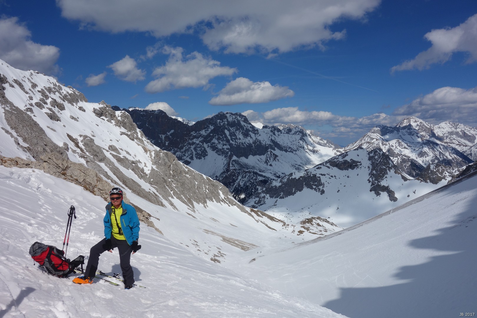 Butterfirn-Abfahrt in die Hölle. Dann über die Höllreise sehr warm bis in die Grünstein-Scharte. Im Firn konnte man die Steilheit des Anstiegs sehr gut selbst bestimmen. Kurze, steile Abfahrt nach N, sehr griffig und Querfahrt zur Rippe, die zum Tajatörl hinaufzieht. Zum Tajatörl muss nochmals angefellt werden, aber nur 10 Min Anstieg. Schöne Firnabfahrt durchs obere Brendlkar, die Osthänge unter den Tajaköpfen waren schon sehr weich. Je mehr die N-Hänge im unteren Teil befahren werden, desto besser war die Abfahrt; weicher Schnee, aber sehr tragfähig. Über die Langlaufloipe mit Gegenanstiegen zur Ehrwalder Alm, von dort über die sulzigen Pisten zur Talstation. Der Skibus fährt um 15:20 Uhr zurück nach Biberwier.