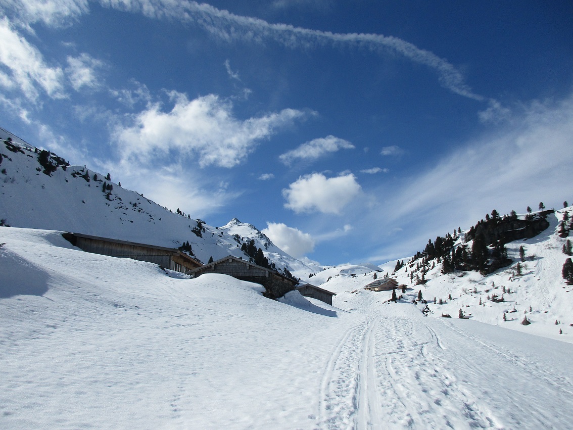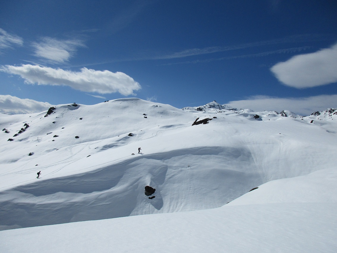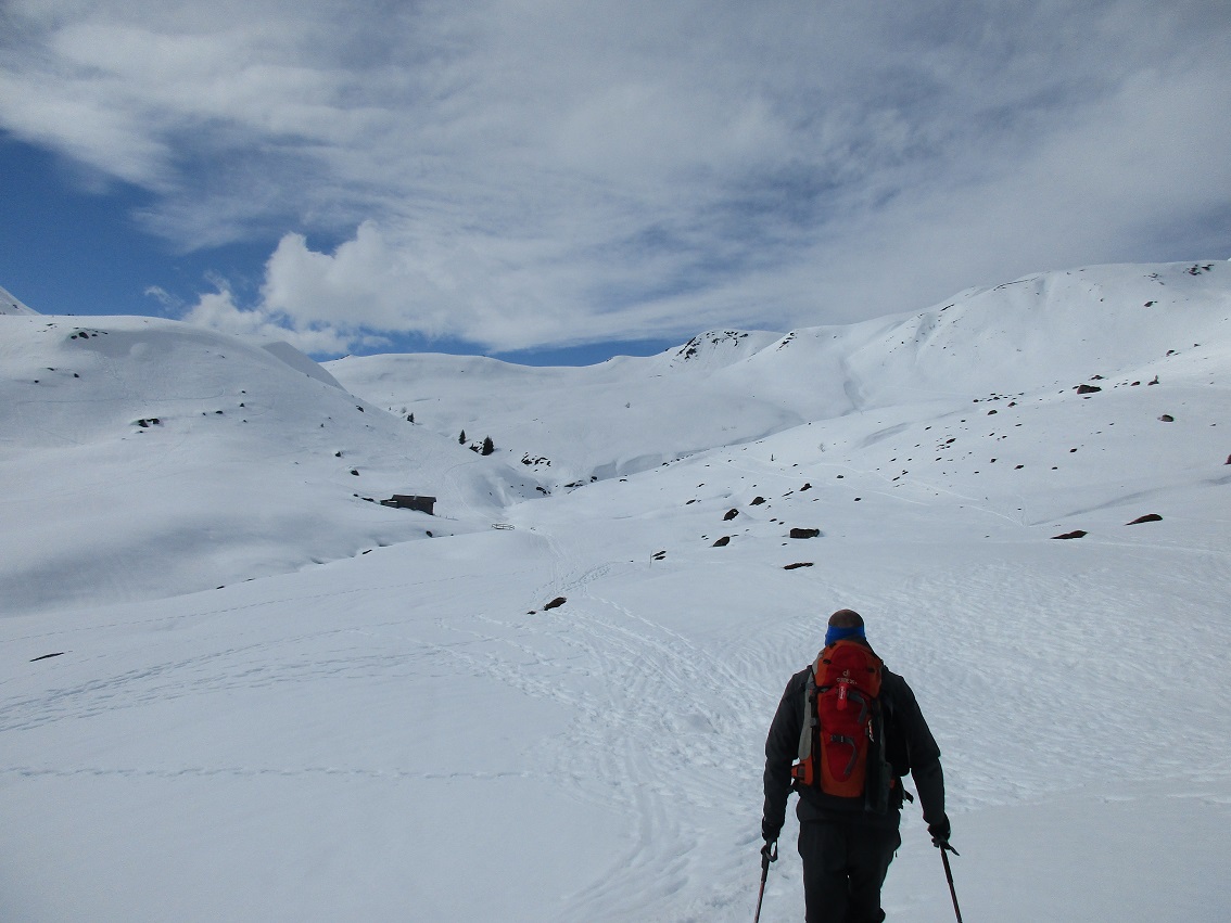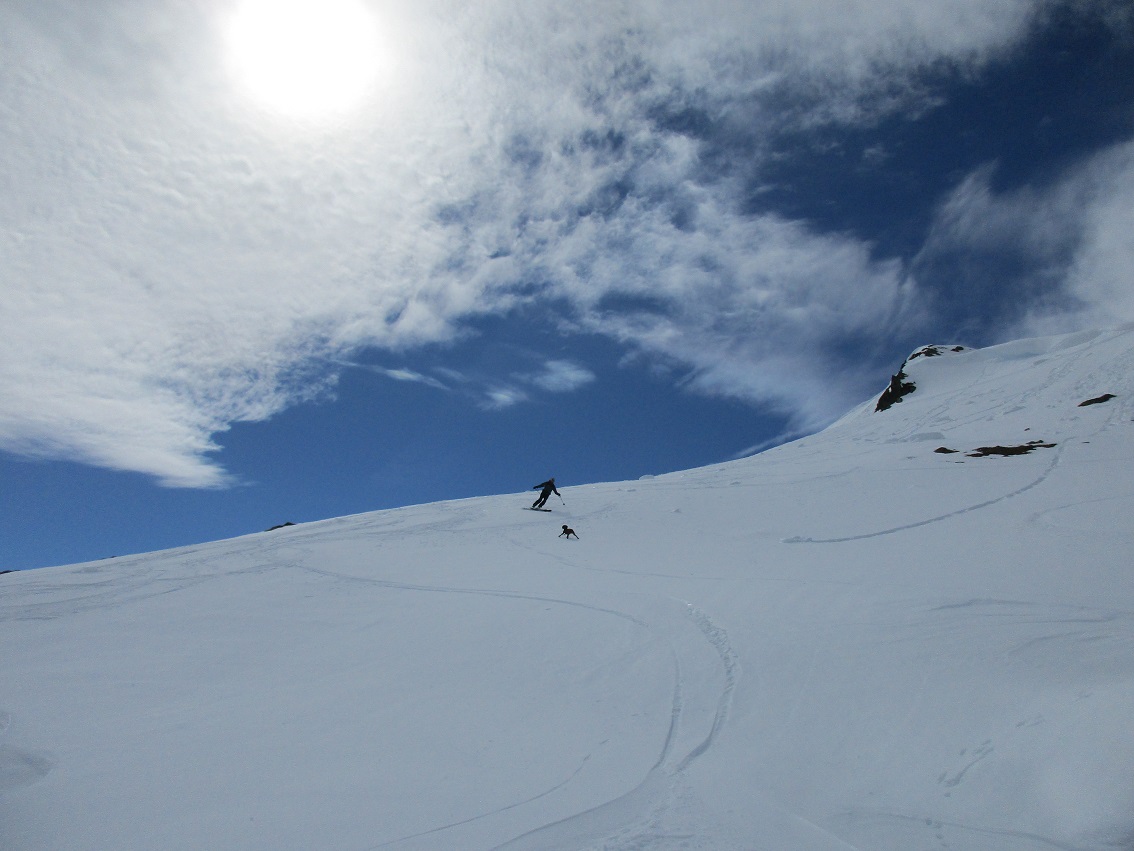 Tourenverhältnisse: Eigentlich ganz gut / unten werds scho langsam eng ( am Winterweg besser ) / droben noch genug Schnee / wegen Sonne ist der Tristkopf dort droben wohl die beste Wahl / Osthänge früh sulzig / am Tristkopf fest + hart / schöne Abfahrt / wegen unlohnender Hüttenabfahrt ... nochmaliger Anstieg Richtung Schwebenkopf, von dort zügige Abfahrt zur Hütte