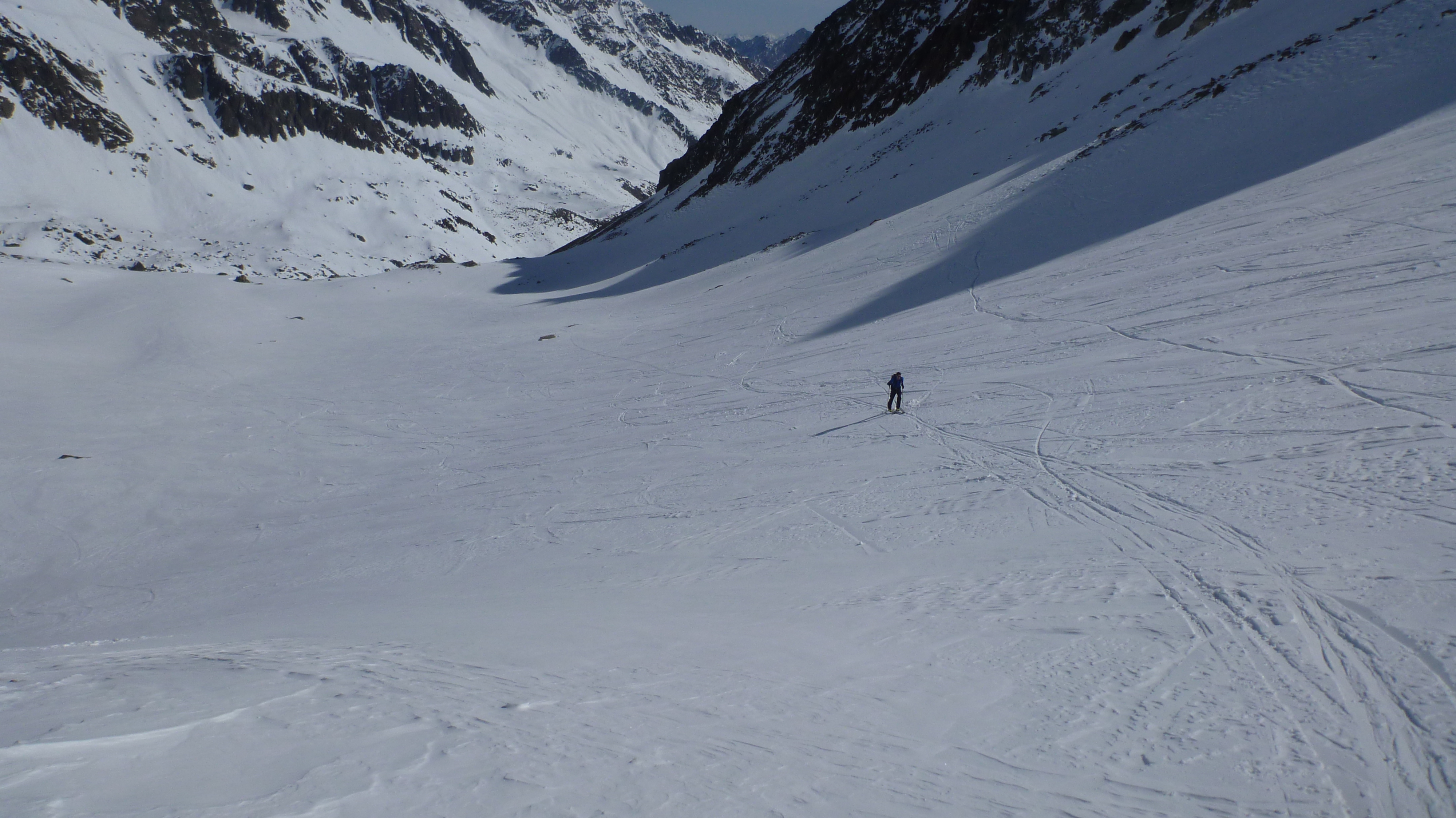 Tourenverhältnisse: beste Bedingungen, oben gepresster Pulverschnee, gut zu fahren, übergangslos zu Firn, in der Wilden Grube weich und bucklig