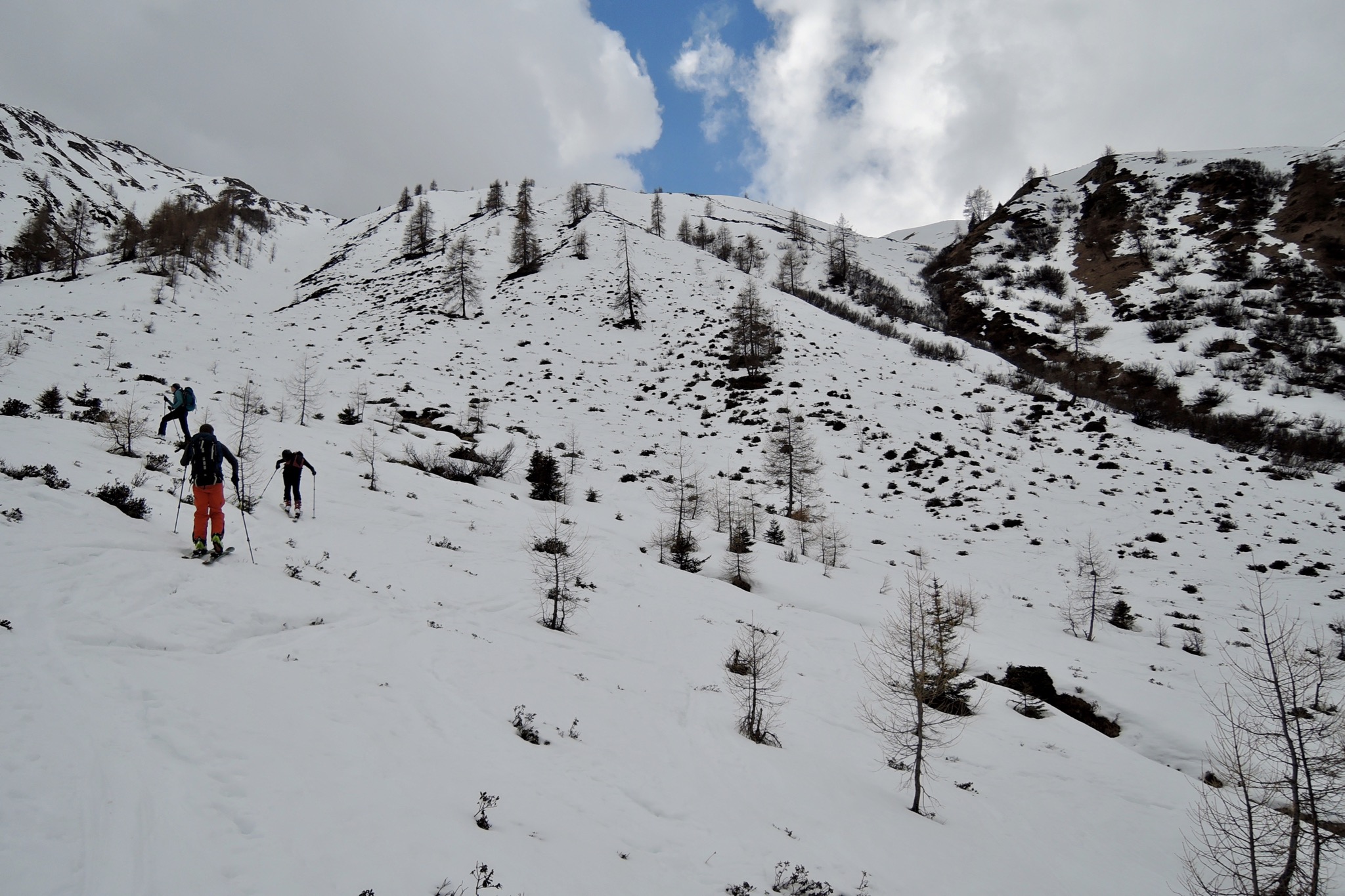 Sonstiges: Nachdem die Tour am Mittwoch Nachmittag oberhalb der Steilstufe im knietiefen Sulz ein vorzeitiges Ende fand, heute früher von der Alfenalm (1700m) den Alfenbach entlang talein, am Bankerl rechts haltend zur Ruschlethütte (1915m). Von dort Richtung SW über die linke Rinne steil hinauf über die Steilstufe aufs Pfannhorn (2663m) zu. Oben Richtung NW über Almböden über den etwas steileren Gipfelsüdosthang zum Gaishörndl (2615m) hinauf.