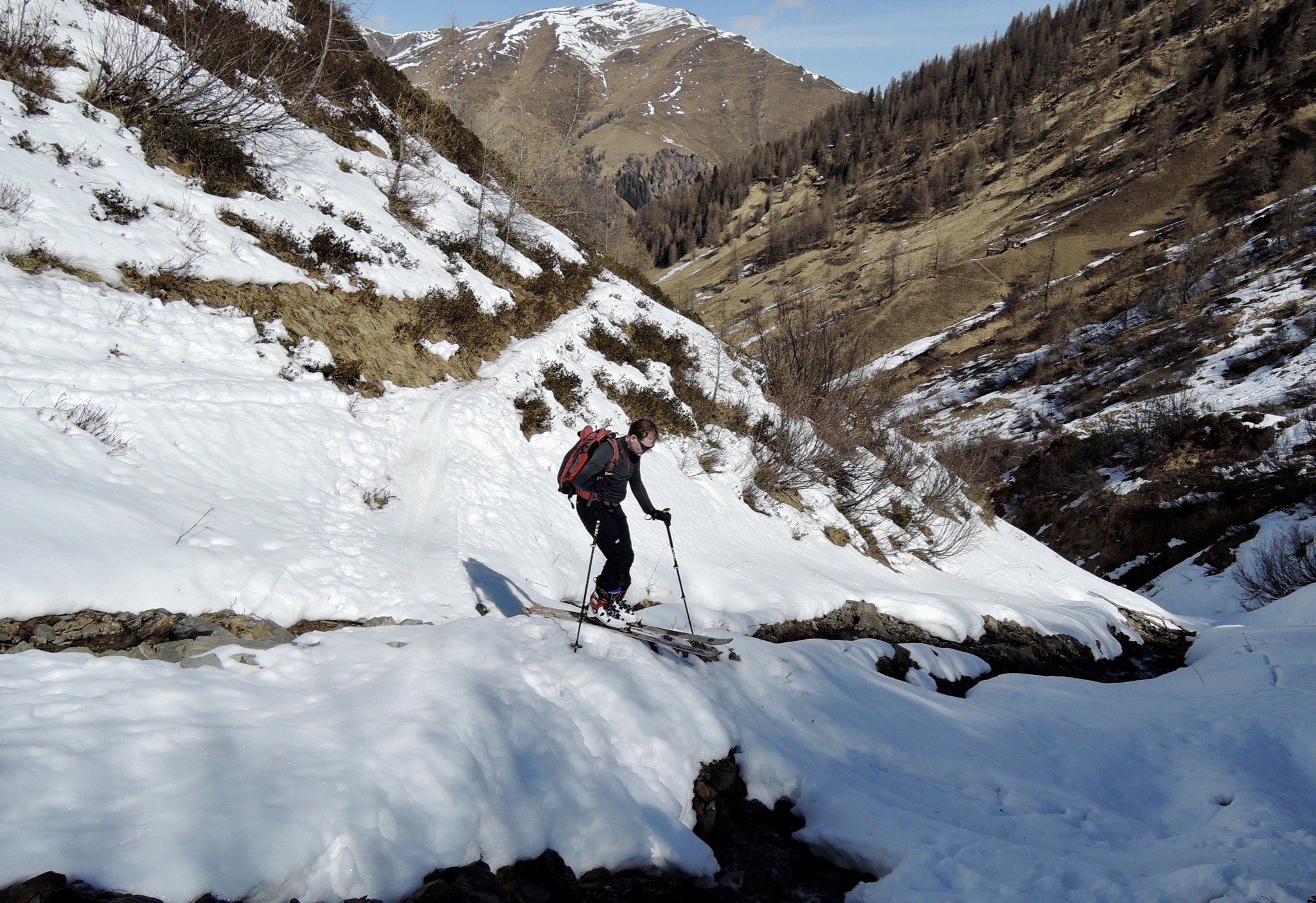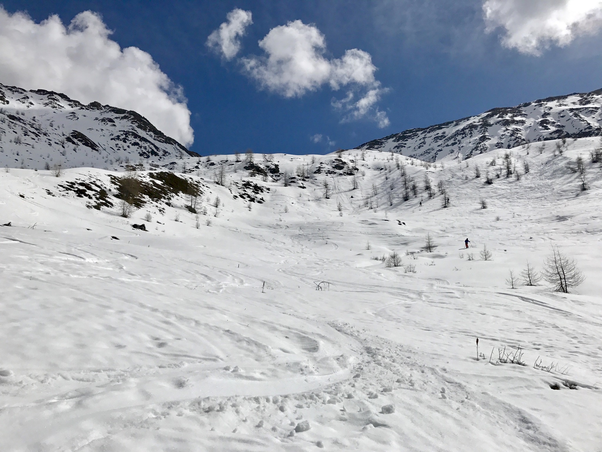 Runter entlang der Aufstiegsspur im schon leicht sulzigen Firn, unterhalb des Gissertörls dann direkt Richtung NW im Butterfirn über traumhaft kupiertes Skigelände, zuletzt entlang der Aufstiegsspur.