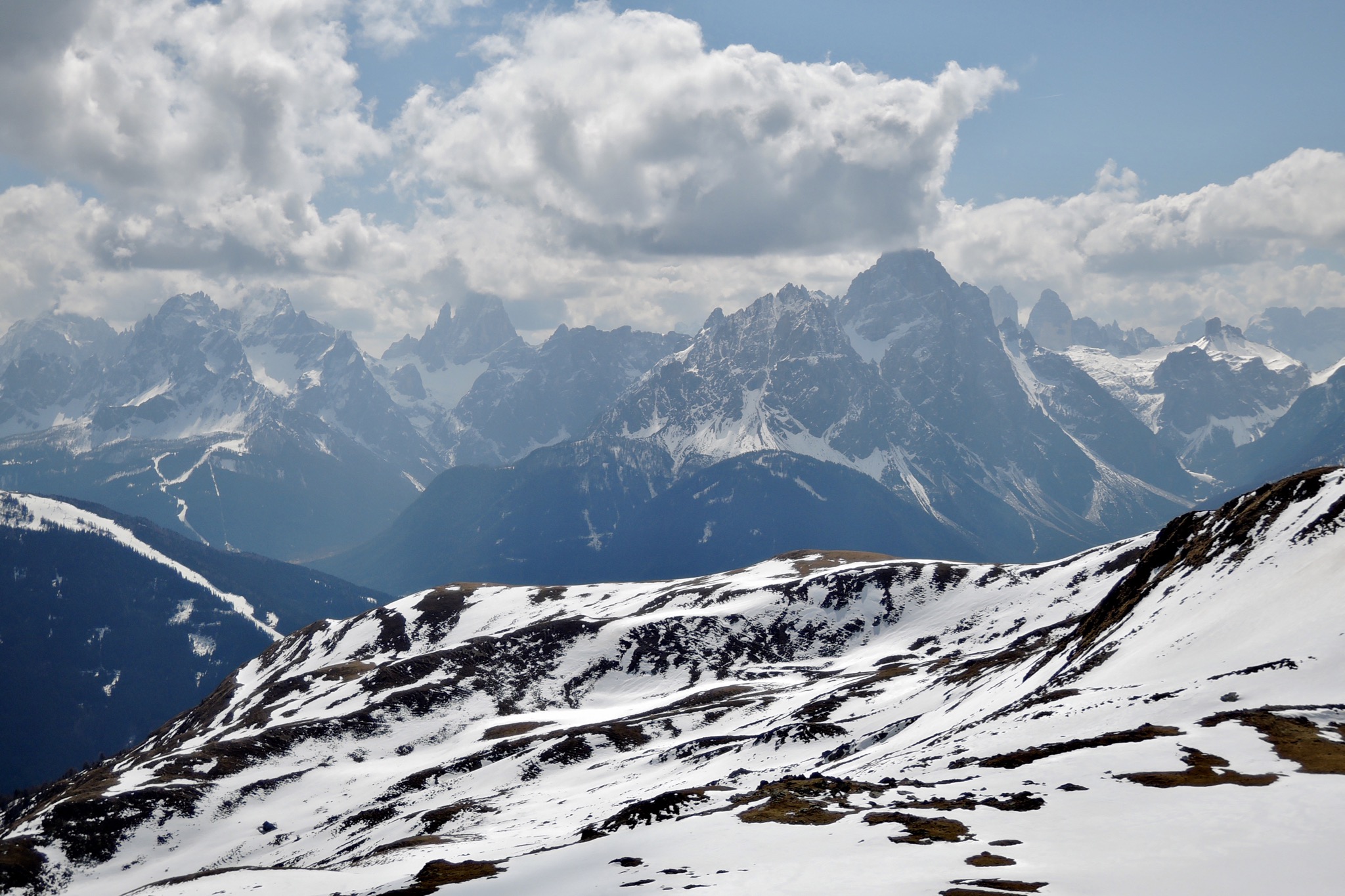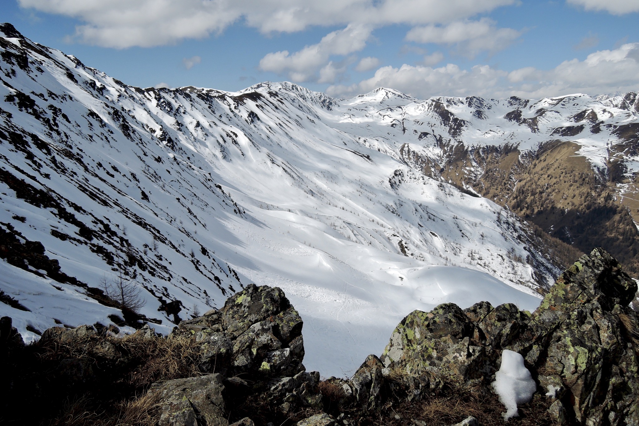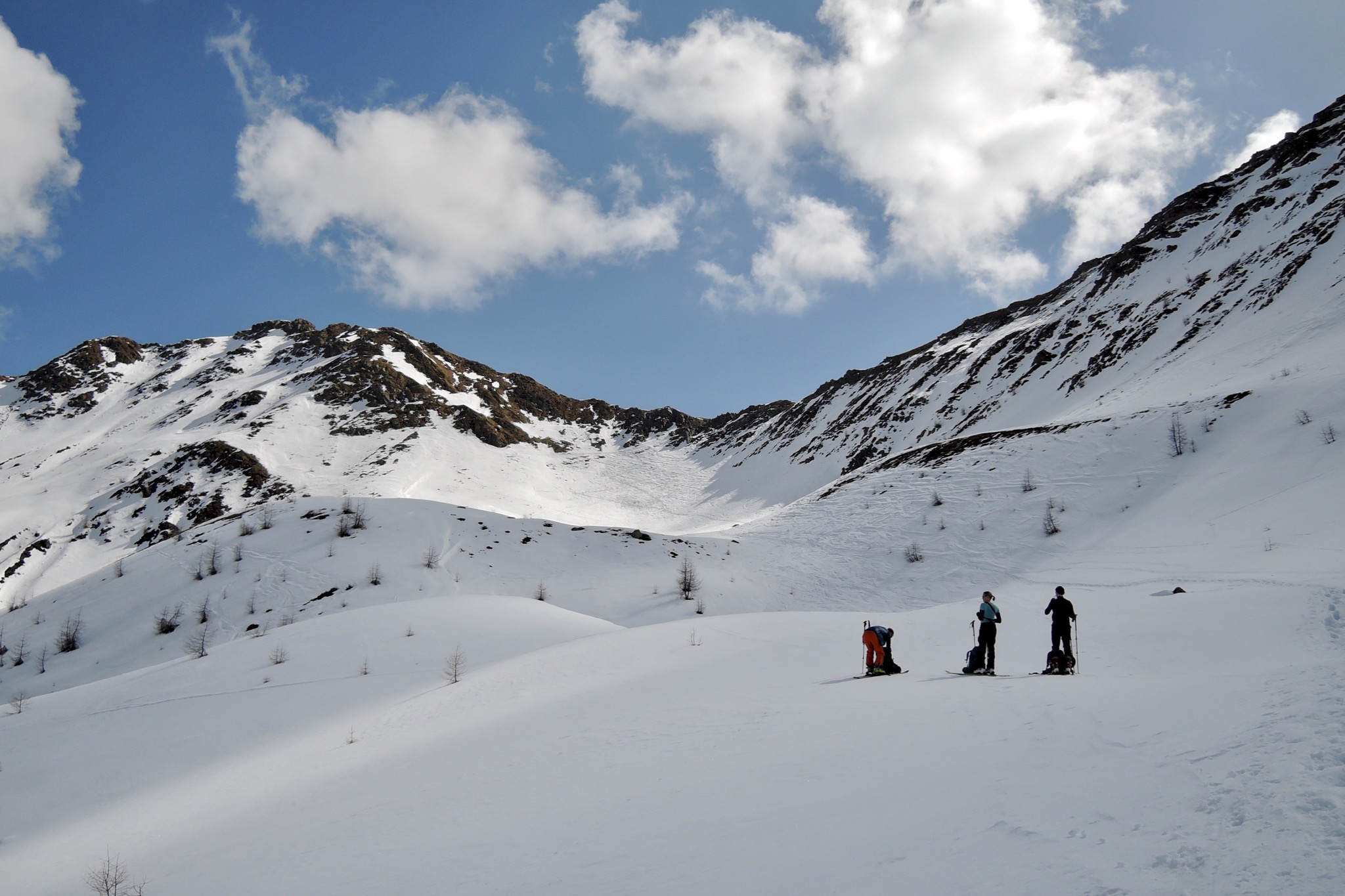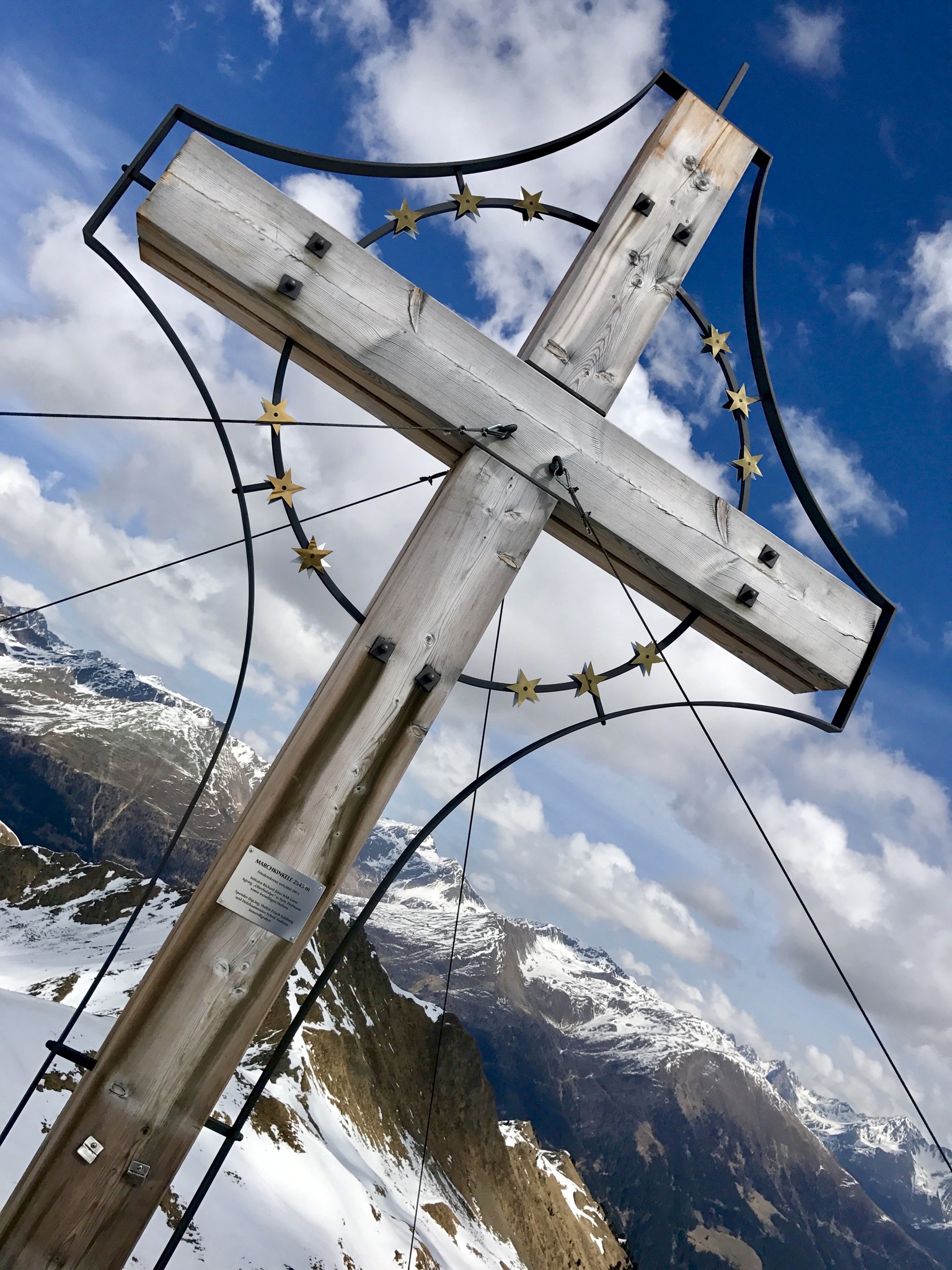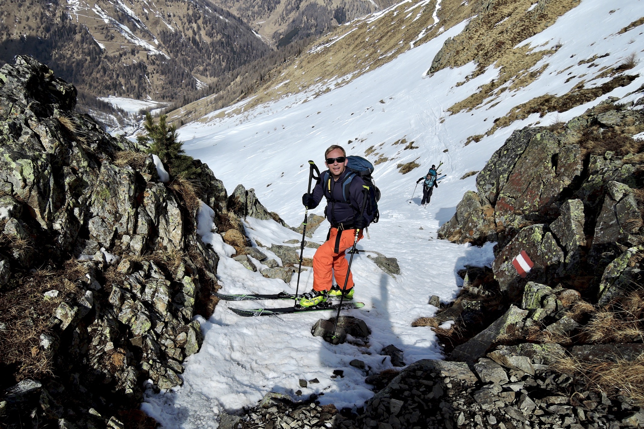 Sonstiges: Von der Alfenalm (1700m) in südlicher Richtung entlang des Alfenbachs, am Bankerl dann Richtung SO durchs sonnseitig apere Marchental bis unter die Marchenwand. Sodann Richtung O zum Gissertörl (2390m) hinüber gequert. Aus dem Schartl kommen ganze Horden, es muss wohl gut sein. Dort sehr steil hinauf, zuletzt Skier am Rucksack. Anschließend unschwierig dem Gratverlauf Richtung SW in einem weiten Linksbogen folgend zum neuen Gipfelkreuz des Marchkinkele (Cornetto di Confine, 2545m). Die Einheimischen haben ihr Bier dabei...