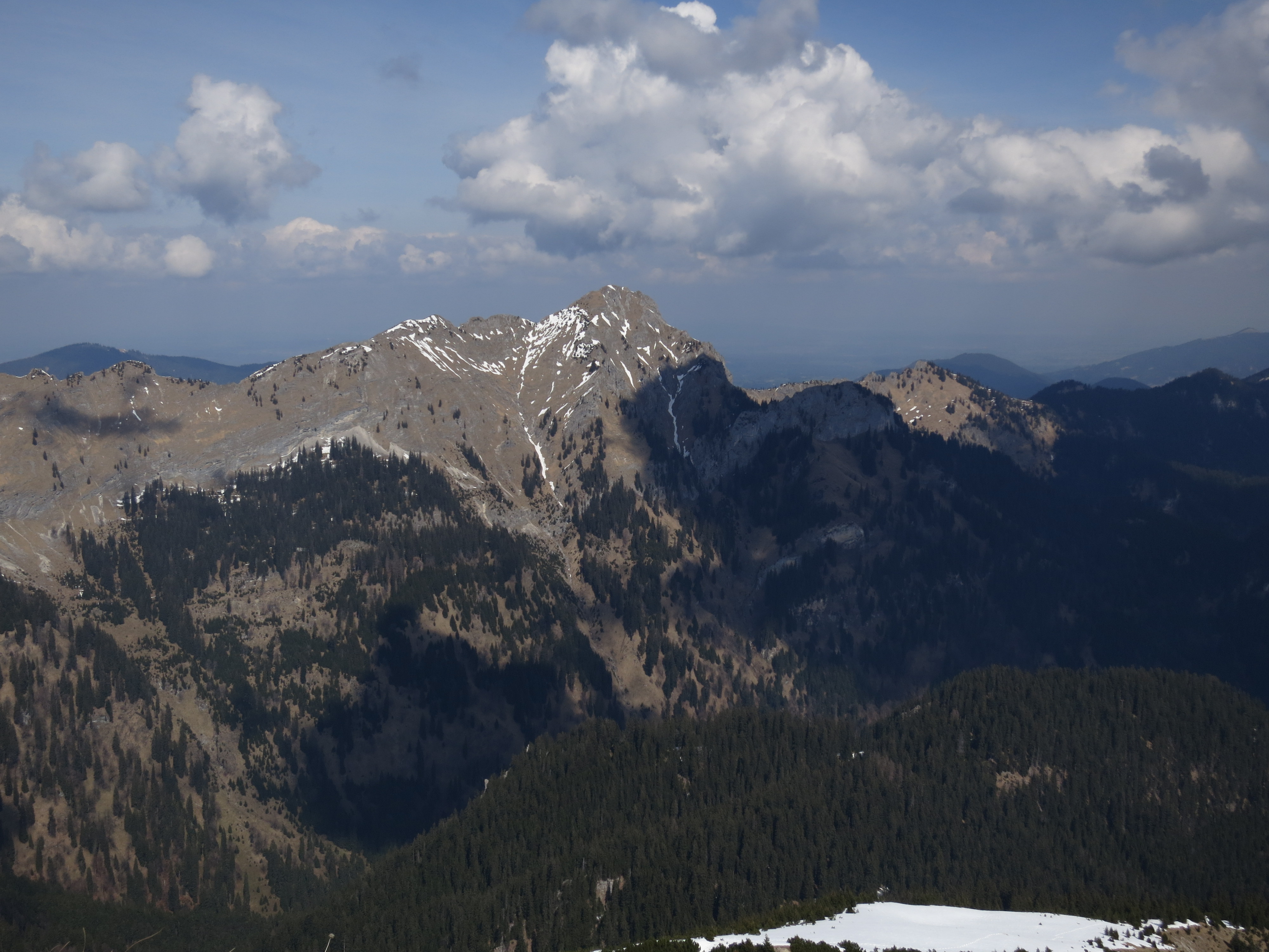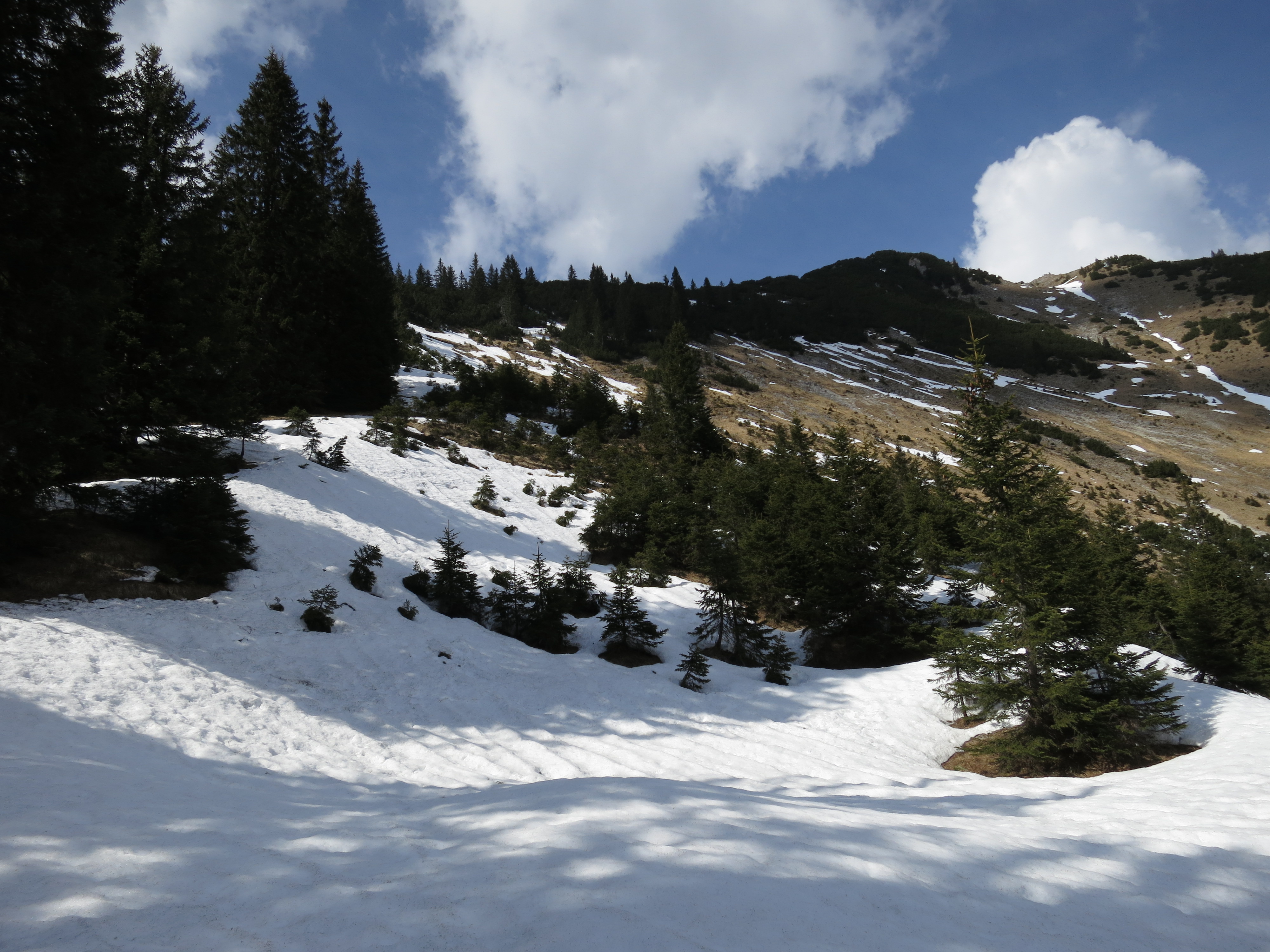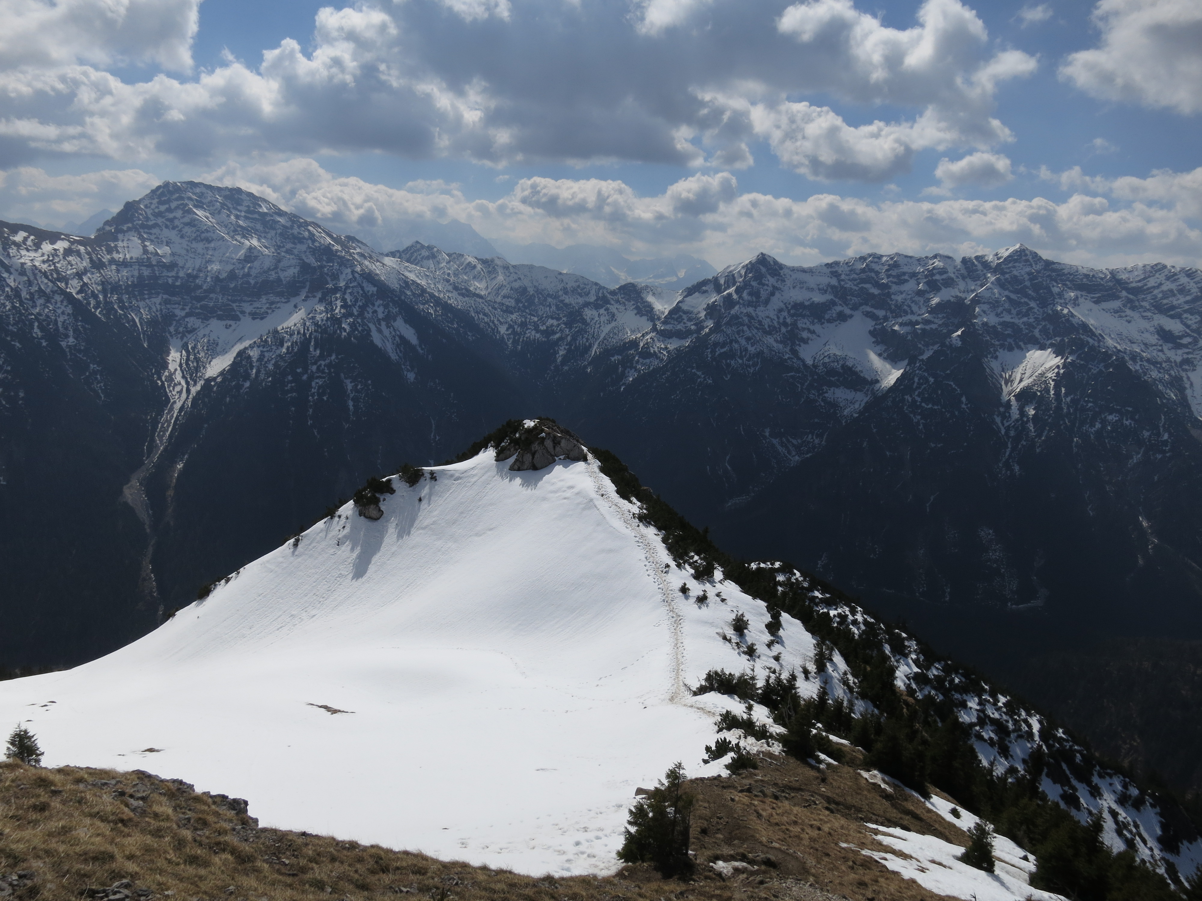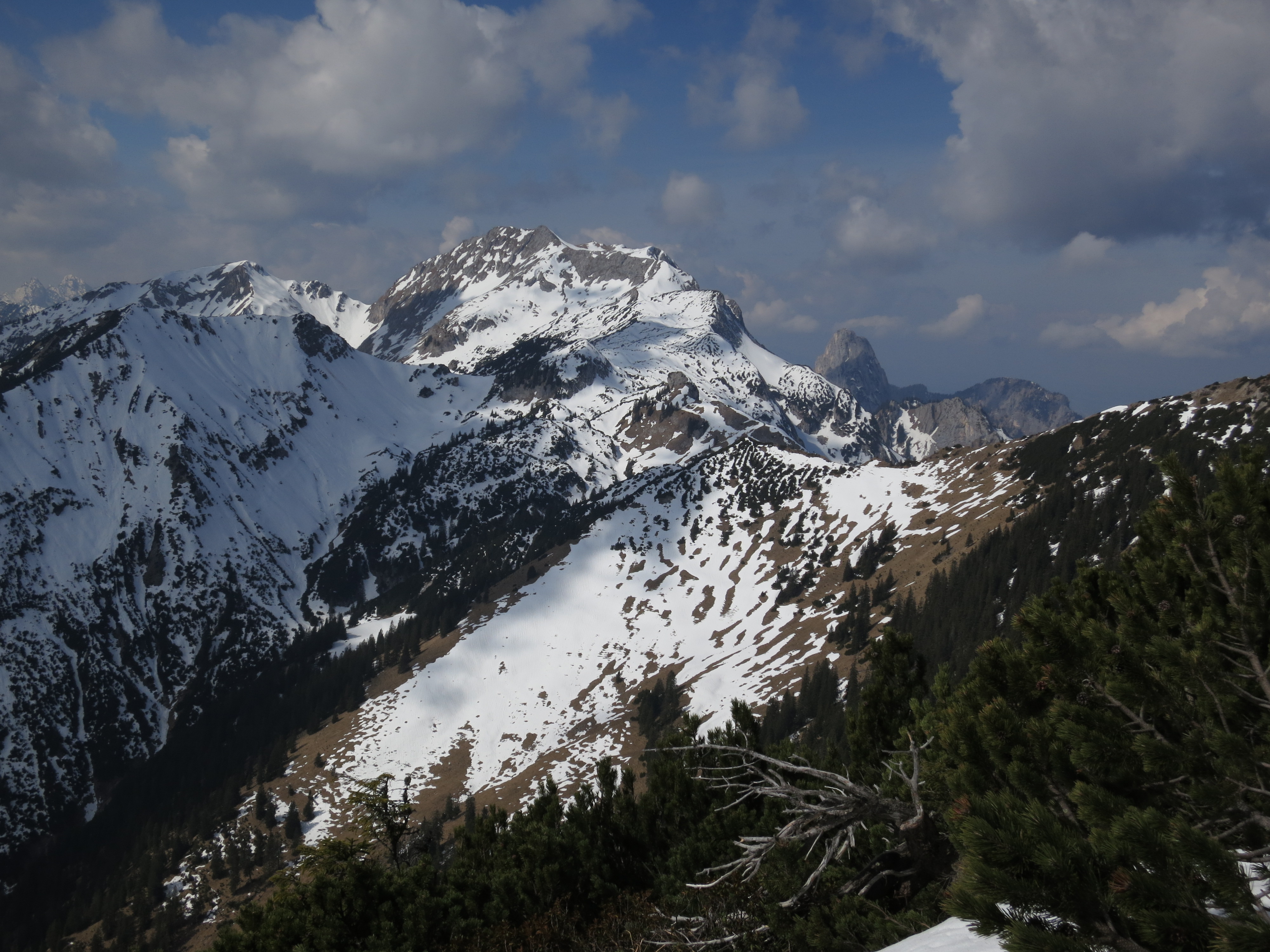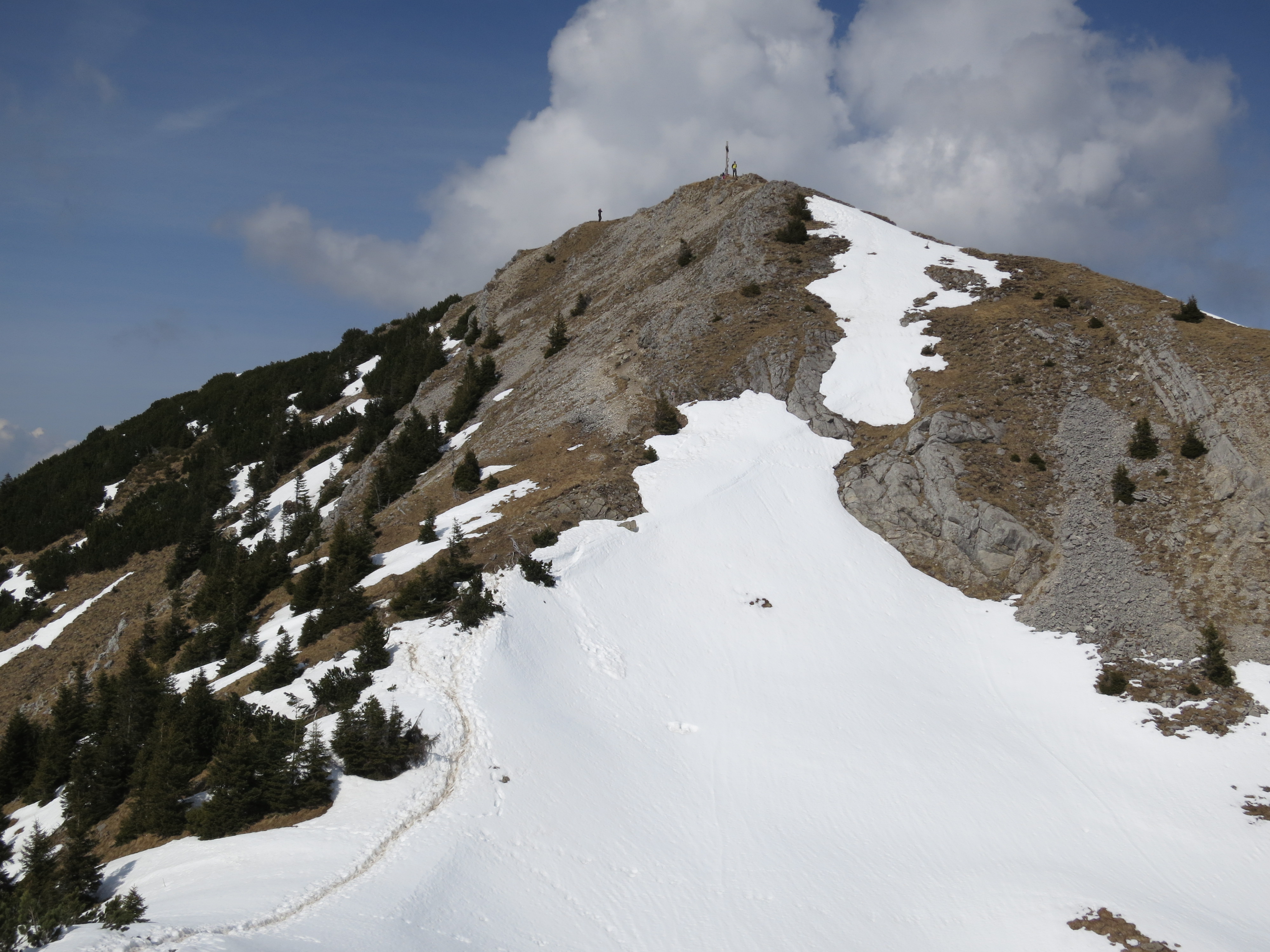 Tourenverhältnisse: Wege bis zu der Stelle, an der die Latschen beginnen (Vorgipfel wird sichtbar; ca. 1600 m; Bild 2) aper und trocken. Von da an bis zum Vorgipfel und in der Senke danach noch Einiges an Schnee mit Unterbrechungen (Spur vorhanden). Der Gipfelaufbau selbst war dann wieder schneefrei zu begehen. Derzeit keine Grödeln usw. nötig, da der Schnee durchfeuchtet ist.