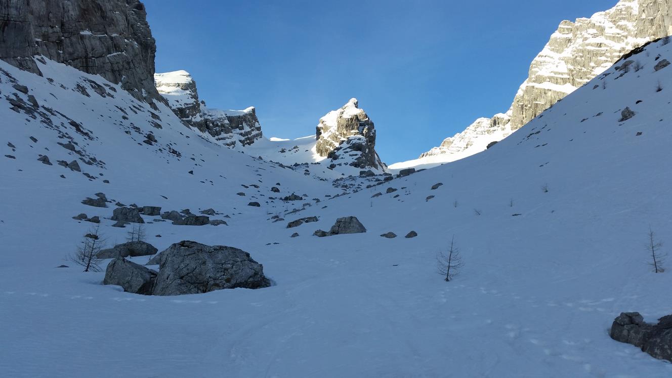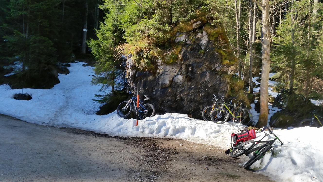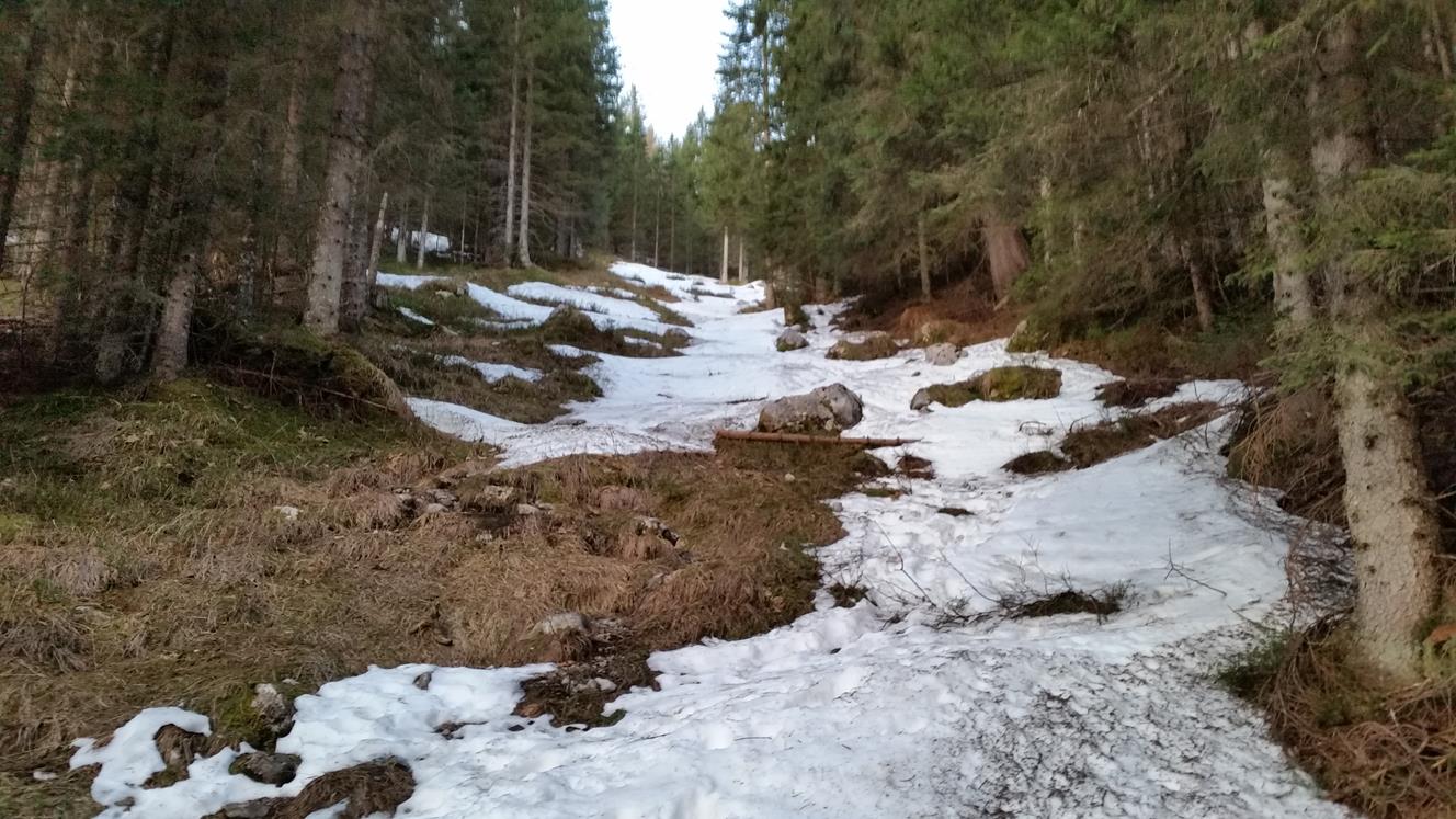 Tourenverhältnisse: Mit dem Radl zur Benzinkurve (1200m). Schnee beginnt am Anfang der Waldschneise (1300m). Aufstieg im Waldgürtel gut zu gehen (nicht eisig) . Im Kar pickelhart gefroren und rutschig zu gehen. Auf der Skischarte windstill und sehr warm. Abfahrt im oberen teil Firn. Im unteren teil vom Kar eisig. Waldgürtel mit zurückhaltender fahrweise noch gut fahrbar (Kein Sulz). Es kommen aber immer mehr Steine raus.