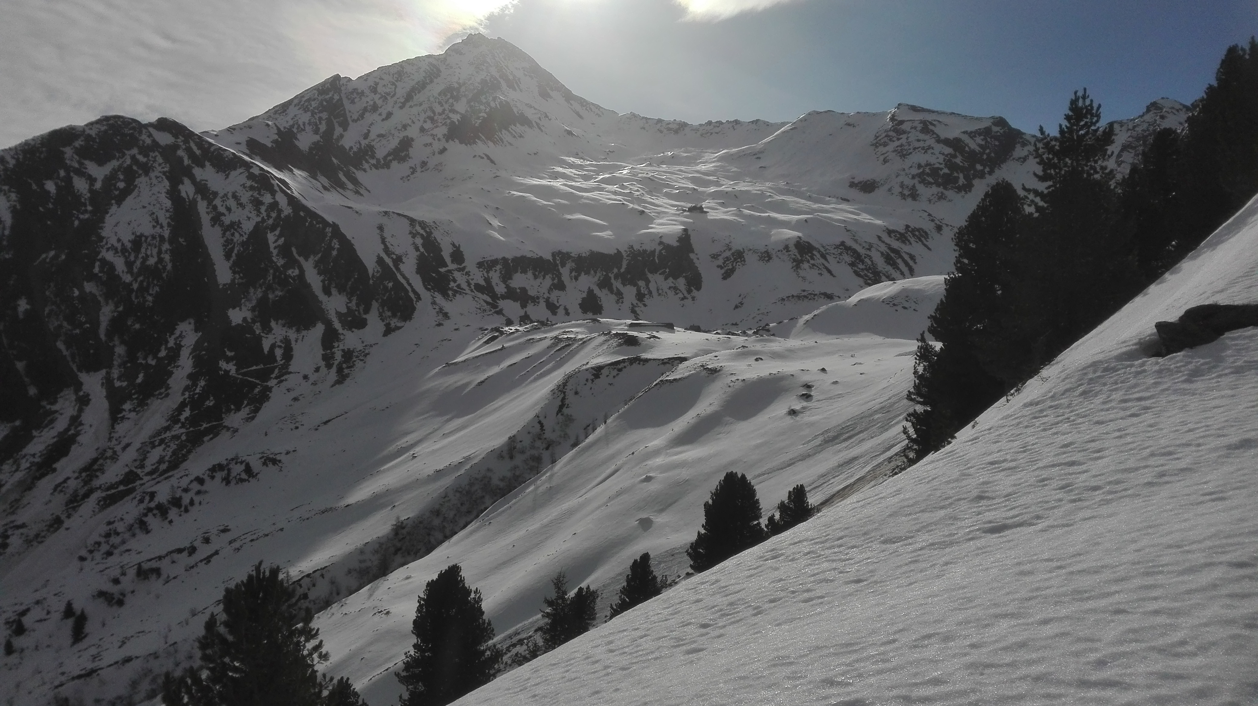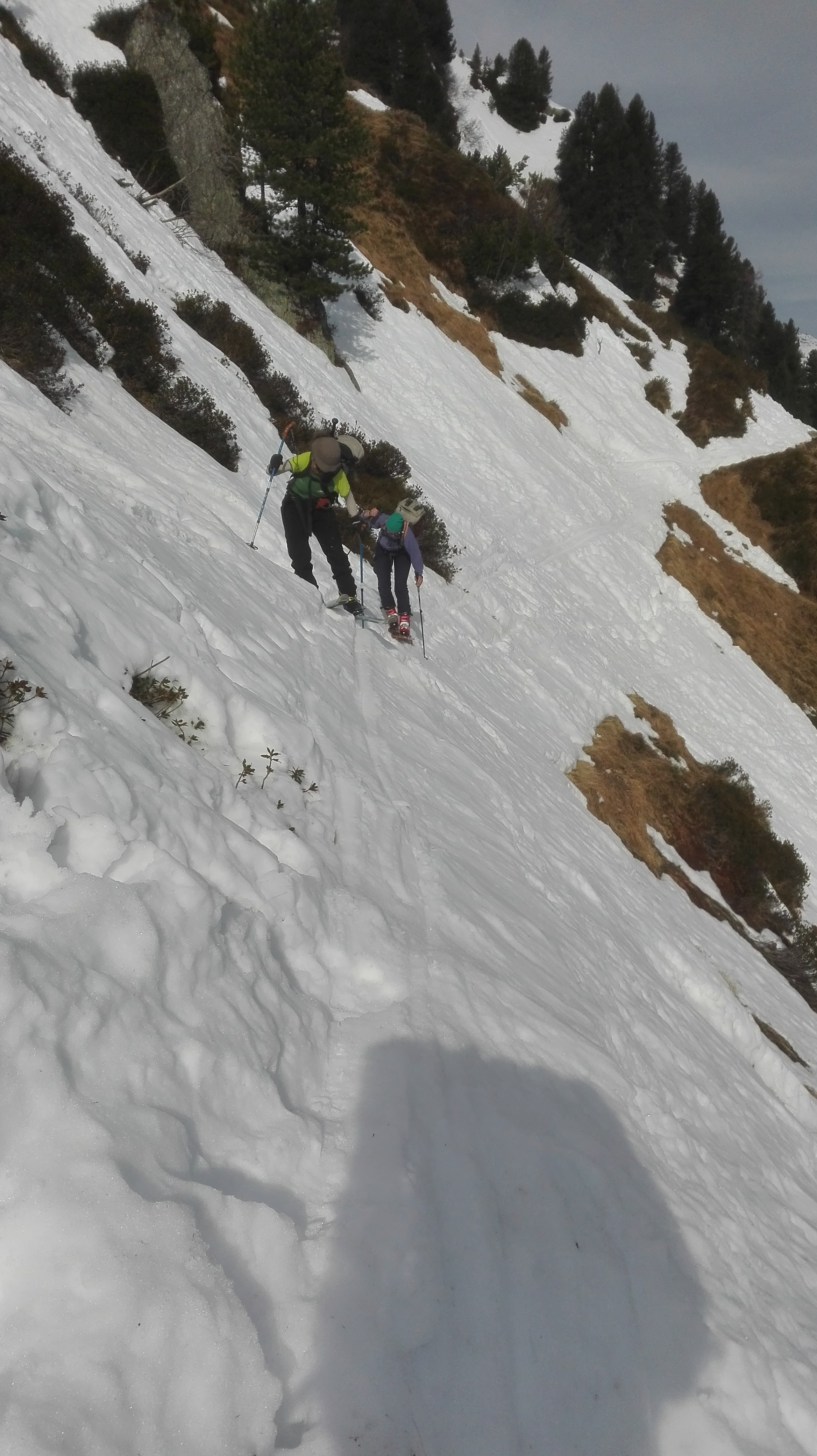 Abfahrt dann bei teils harschigem, überwiegend firnigen Schnee mit anschließender (nun harmlosen) Querung zurück zur Bergstation. Weiter über überwiegend sulzige, weiter unten auch harte/eisige Pisten bis an den Ortsrand von Mayrhofen!! Die Talabfahrt ist gesperrt, aber bis unterhalb des Wiesenhof (1000m) gut fahrbar, dann wird es immer schlechter. Wer will, kann aber mit zwei, drei kurzen Tragestücken noch bis auf 700m bzw. 5 Minuten vor den Parkplatz rutschen. Das sind dann satte 2000Hm.