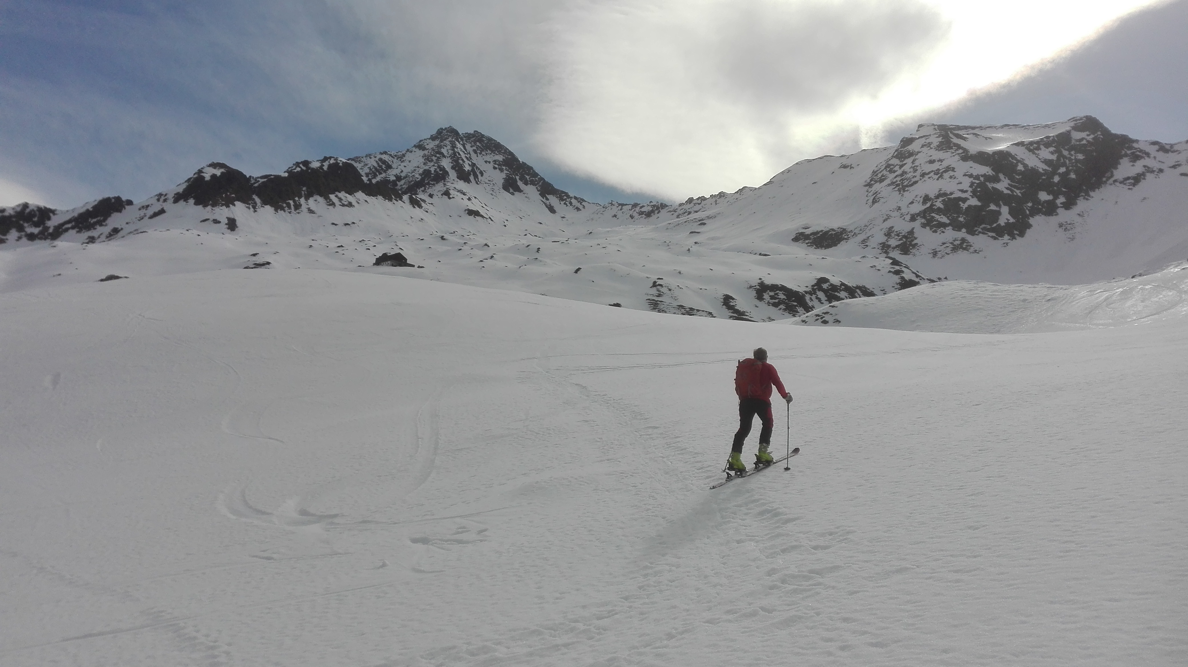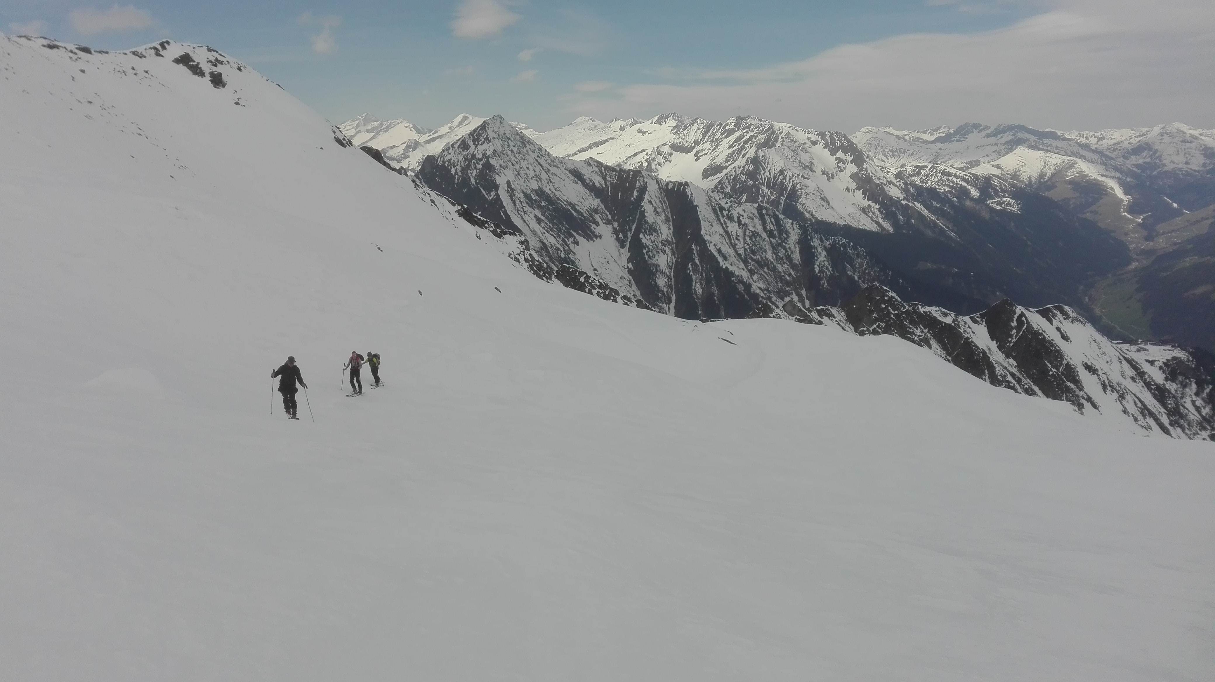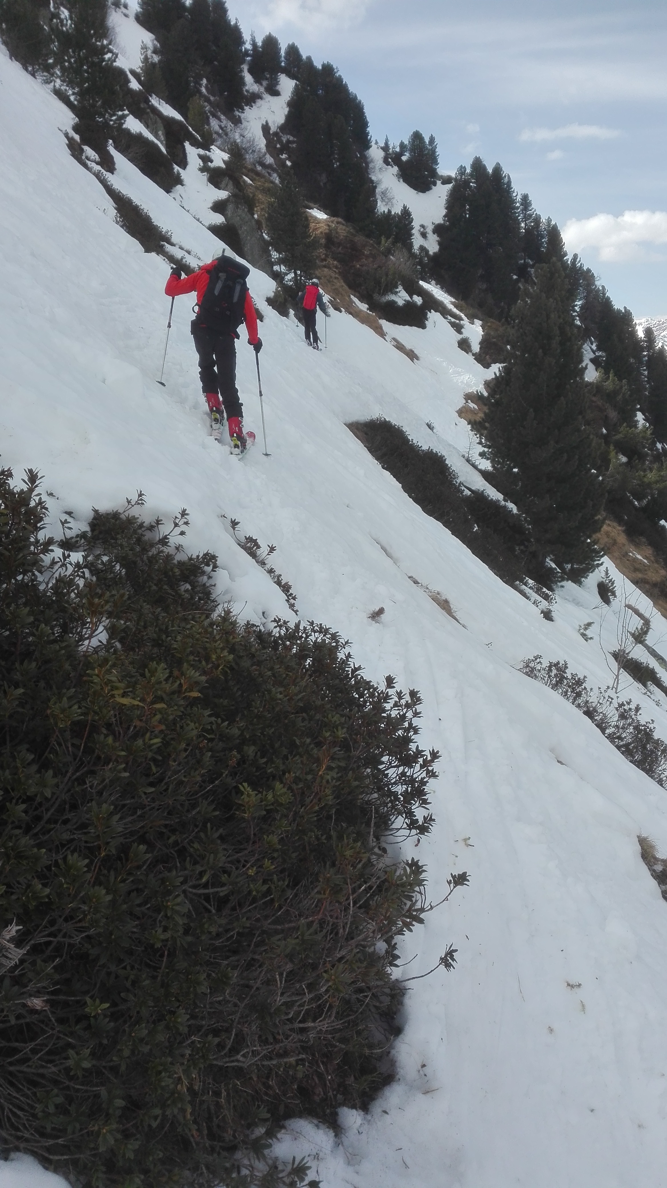 Tourenverhältnisse: Wegen der ansonsten langen Tragestrecken nochmals eine Tour mit Liftunterstützung. Von der Bergstation entweder auf den Filzenkogel (2228m) und von dort durch eine steile Rinne ca. 200Hm ins Föllenbergkar abfahren oder aber das Filzenkarl etwas oberhalb der Bergstation queren und dann sehr steile Osthänge querend mehr oder weniger waagrecht in das Föllenbergkar hinein. Obwohl die Querung morgens um 10.00 in der Sonne lag, war der Schnee dort noch bockhart und die Querung ziemlich unangenehm. Empfehlenswerter ist daher die Variante über den Filzenkogel, wenn auch ca. 300Hm mehr. Anschließend immer am rechten Rand des Kars in idealem Gelände aufsteigen, bis man auf ca. 2700m einen Schneesattel im Westgrat (Popbergschneide) der Ahornspitze erreicht. Über den Grat knapp 300Hm zu Fuß hoch, teilweise im Schnee, überwiegend in einfachem Felsgelände (auch Markierungen). Der Weg zum (niedriger gelegenen) Kreuz dauert 5-10 Minuten einfach und ist anspruchsvoller (Querung in hartem, steilen Schnee, Trittspuren vorhanden, es hängt streckenweise ein Stahlseil drin).