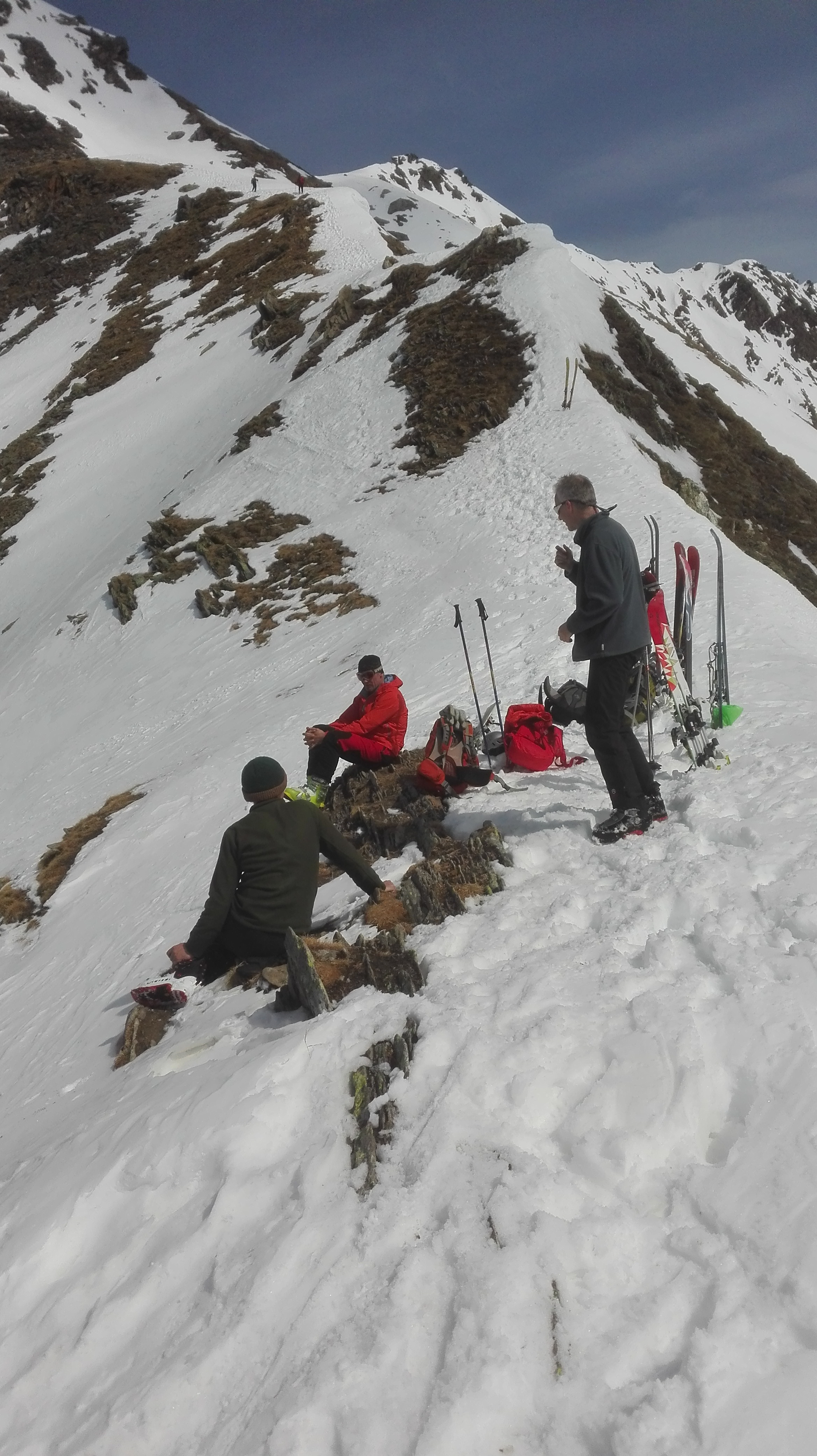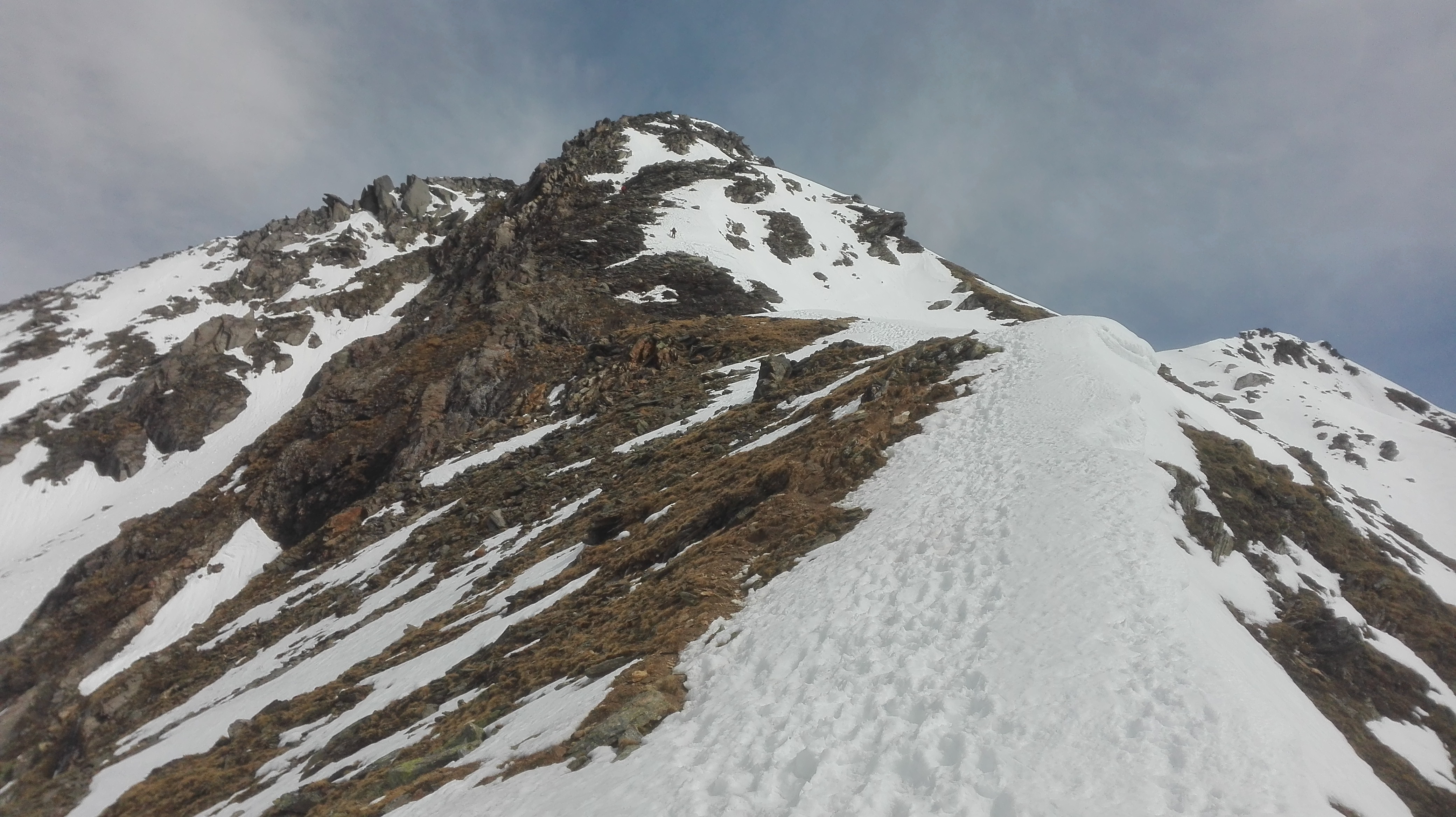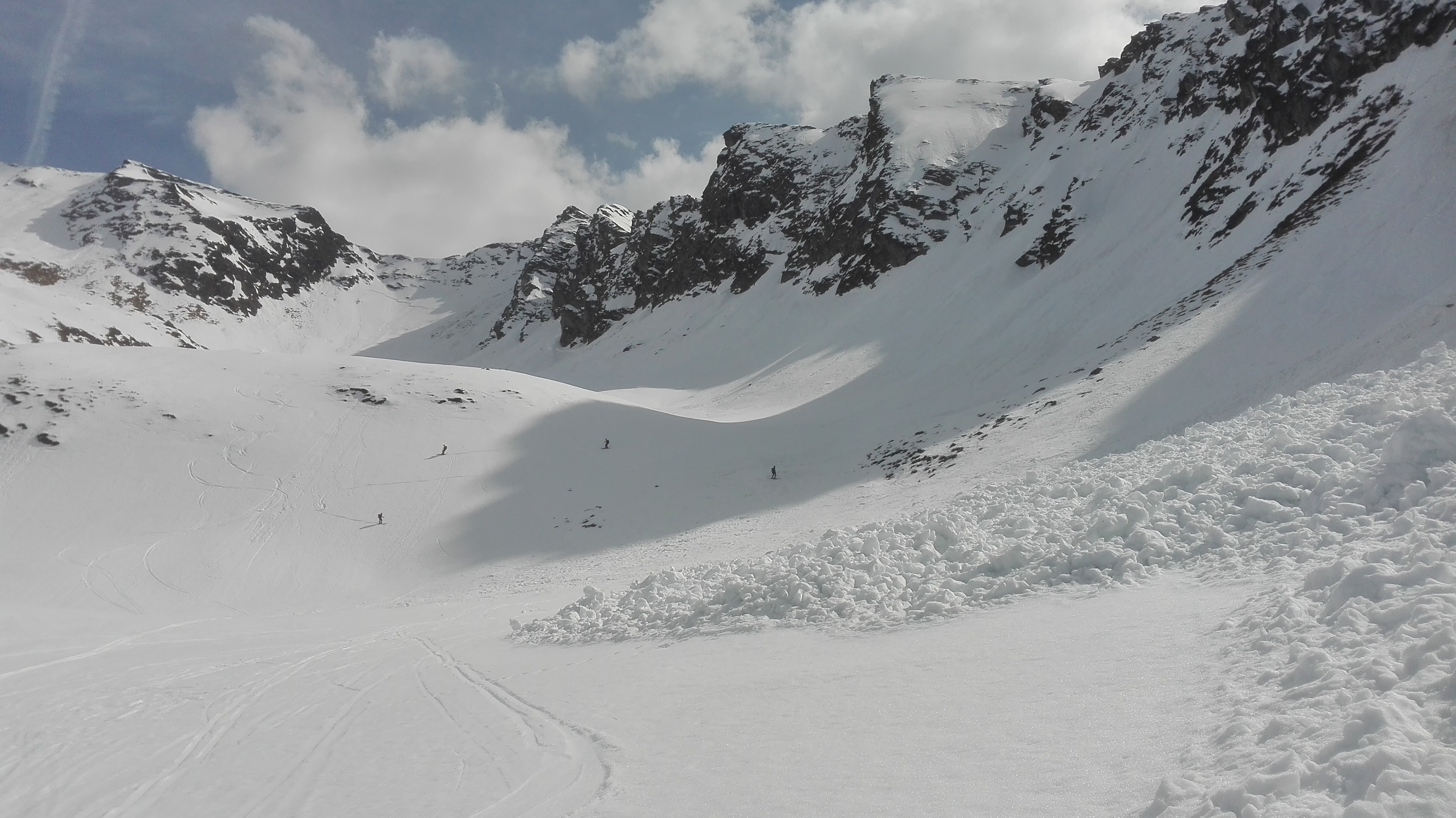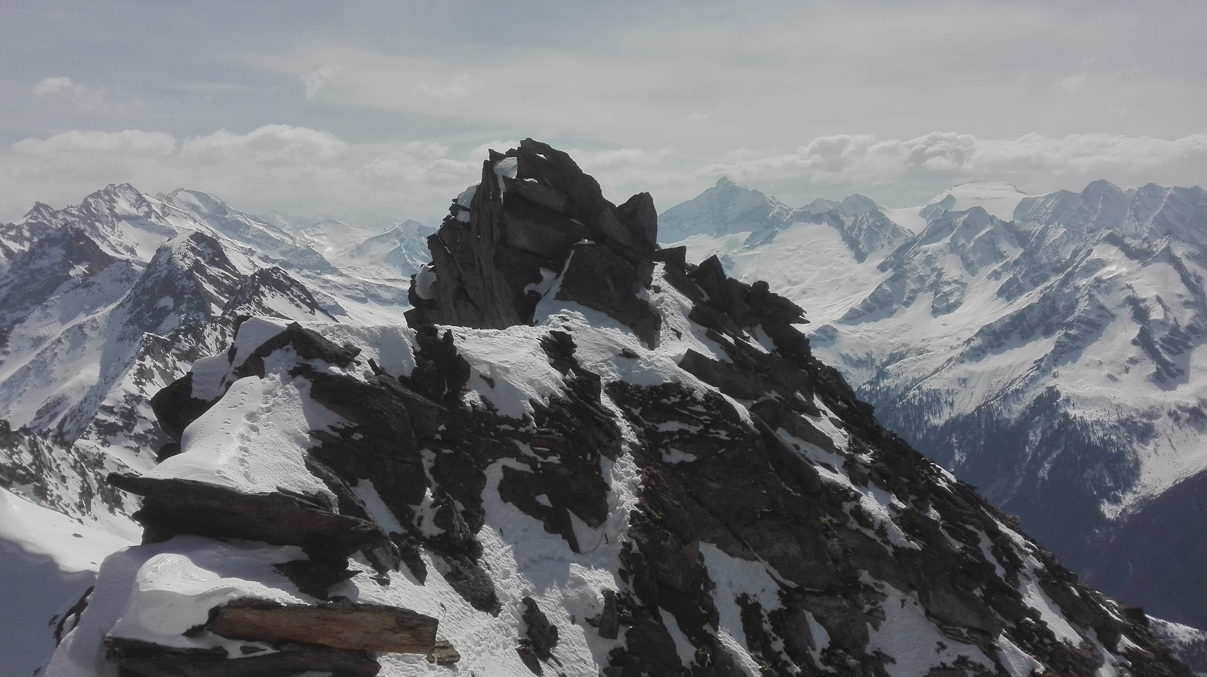 Tourenverhältnisse: Wegen der ansonsten langen Tragestrecken nochmals eine Tour mit Liftunterstützung. Von der Bergstation entweder auf den Filzenkogel (2228m) und von dort durch eine steile Rinne ca. 200Hm ins Föllenbergkar abfahren oder aber das Filzenkarl etwas oberhalb der Bergstation queren und dann sehr steile Osthänge querend mehr oder weniger waagrecht in das Föllenbergkar hinein. Obwohl die Querung morgens um 10.00 in der Sonne lag, war der Schnee dort noch bockhart und die Querung ziemlich unangenehm. Empfehlenswerter ist daher die Variante über den Filzenkogel, wenn auch ca. 300Hm mehr. Anschließend immer am rechten Rand des Kars in idealem Gelände aufsteigen, bis man auf ca. 2700m einen Schneesattel im Westgrat (Popbergschneide) der Ahornspitze erreicht. Über den Grat knapp 300Hm zu Fuß hoch, teilweise im Schnee, überwiegend in einfachem Felsgelände (auch Markierungen). Der Weg zum (niedriger gelegenen) Kreuz dauert 5-10 Minuten einfach und ist anspruchsvoller (Querung in hartem, steilen Schnee, Trittspuren vorhanden, es hängt streckenweise ein Stahlseil drin).