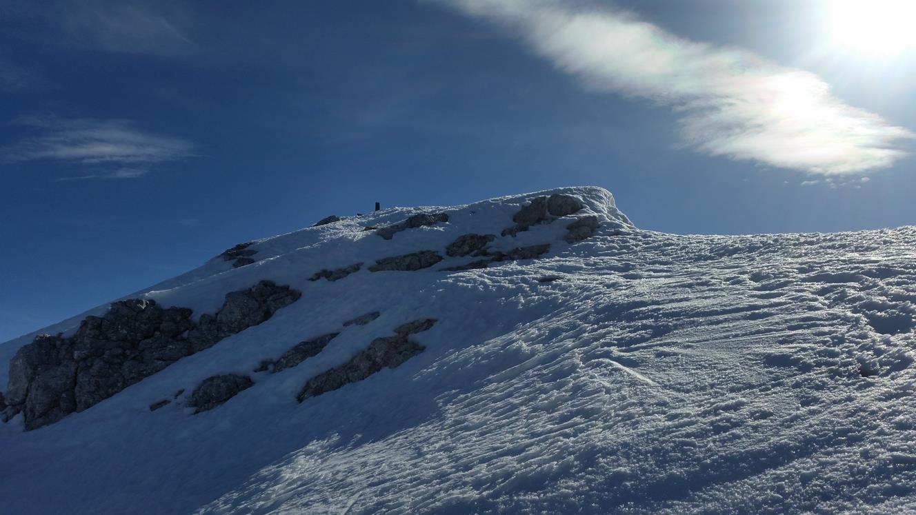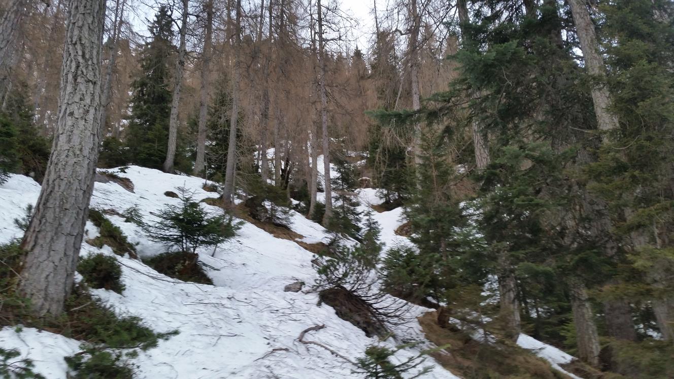 Abfahrt: Gipfelflanke um 11 Uhr noch pickelhart. Auch der Kamm unterhalb vom Karlkopf noch pickelhart. Leider die Steilrinne im Wald bei der Mooswand nicht tragend und sehr schwer zu fahren (Bruchharsch, Sulz, Lawinenknollen). Bis zur Mittereisalm dann wechselnd Bruchharsch und Sulz. Ab der Mittereisalm dann entspannt mit dem Radl ausrollend bis zum Hintersee.