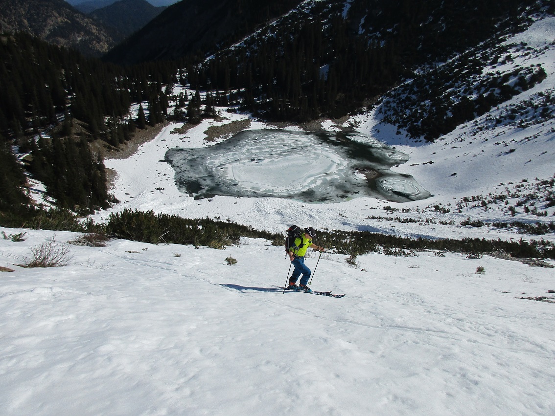 Tourenverhältnisse: Weg frei bis zur Materialseilbahn 9 Km / zu Fuß weiter bis hinauf zu den Seen / ab hier genügend Schnee / Firn + Sulzschnee bei der Abfahrt