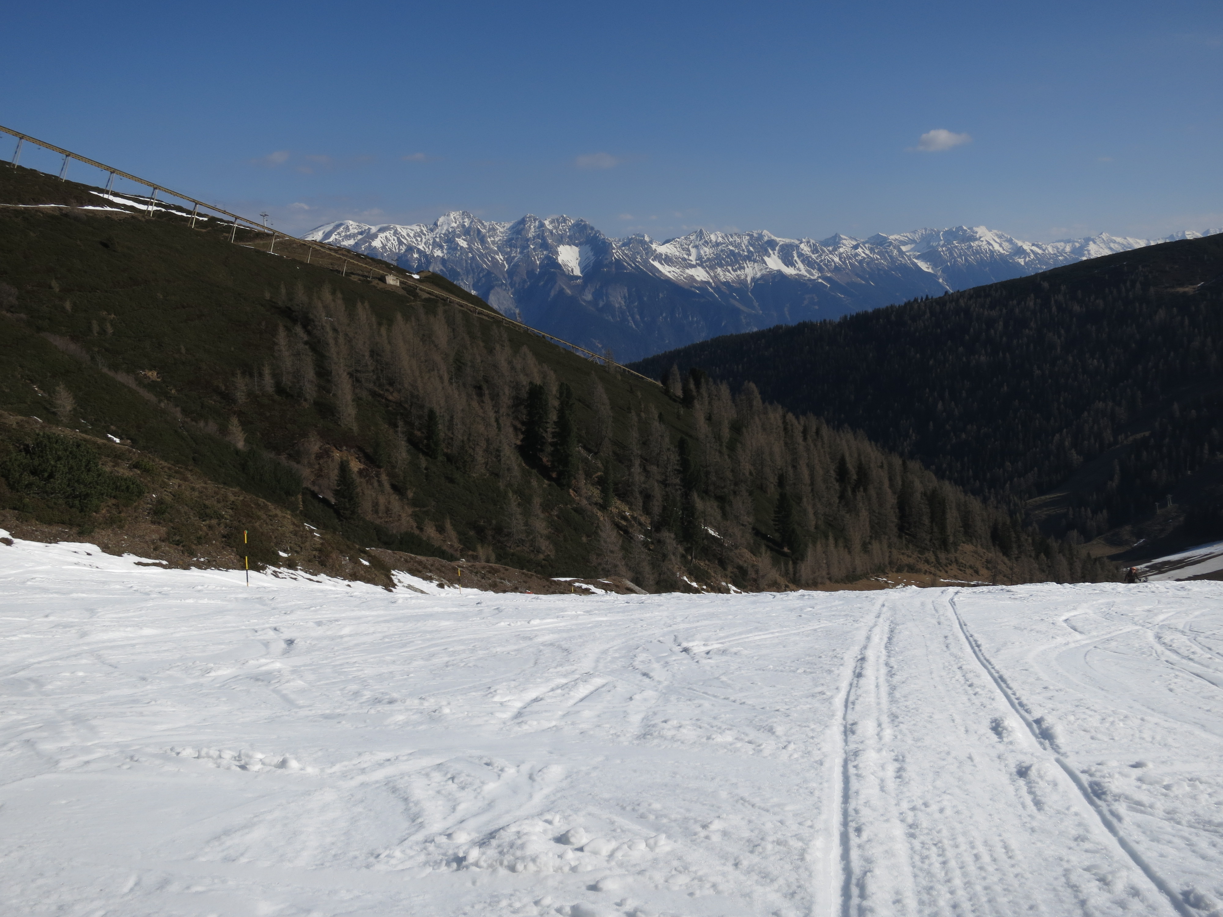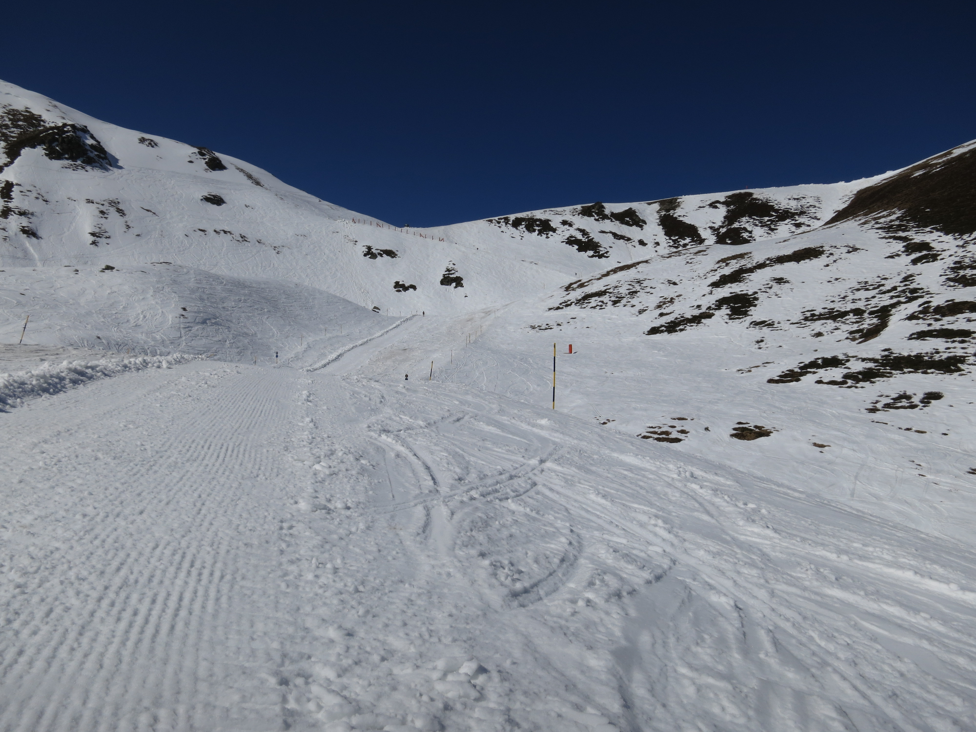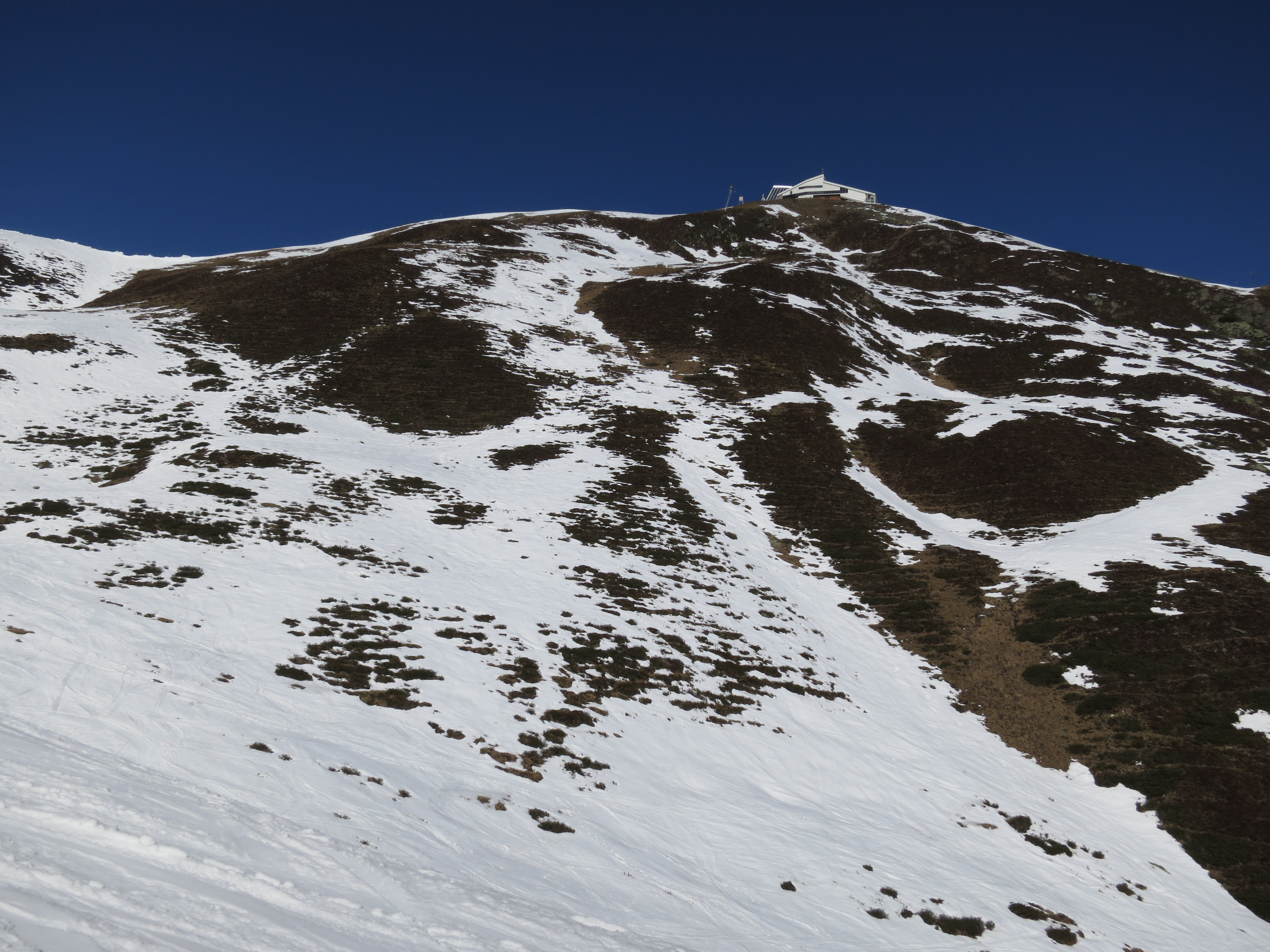 Tourenverhältnisse: Aufstieg und Abfahrt habe ich über die Damenabfahrt gemacht (Piste Nr. 1). Beim Aufstieg war's abschnittsweise (dort wo die Sonne noch nicht wirken konnte) harschig. Der Pistenzustand ist noch einigermaßen gut. Abgefahren bin ich heute um 12 Uhr zwischen wenig Firn und meist sulzigem Schnee (war wohl doch ein Kick zu spät - aber am Gipfel war's sonnig und windstaad, da konnte ich nicht gleich weiter). Die Pistenraupen hatten inzwischen schon angefangen, ihr Unwesen zu treiben (Bild 7), aber bei dem sulzigen Schnee ist das nicht so tragisch.