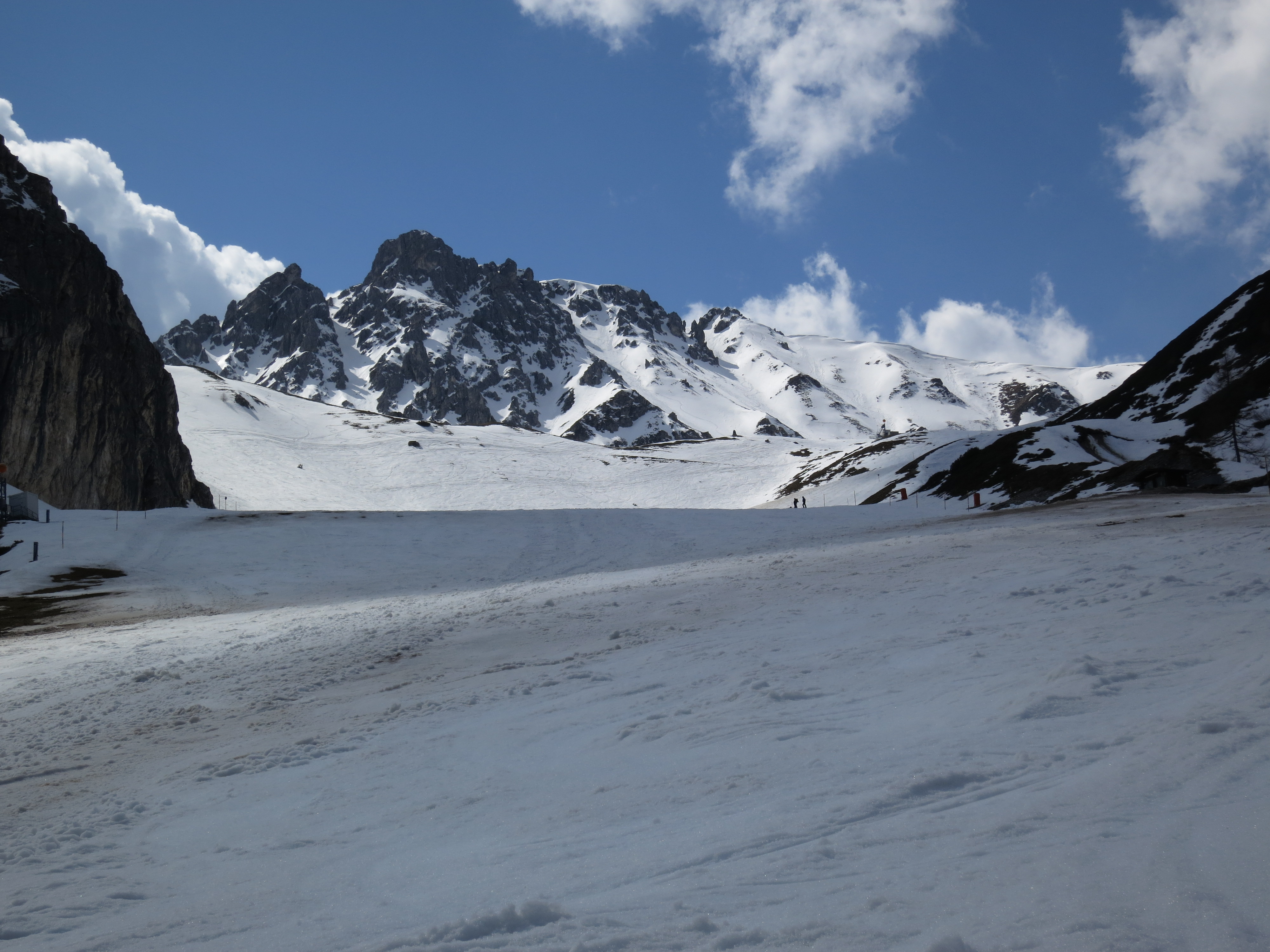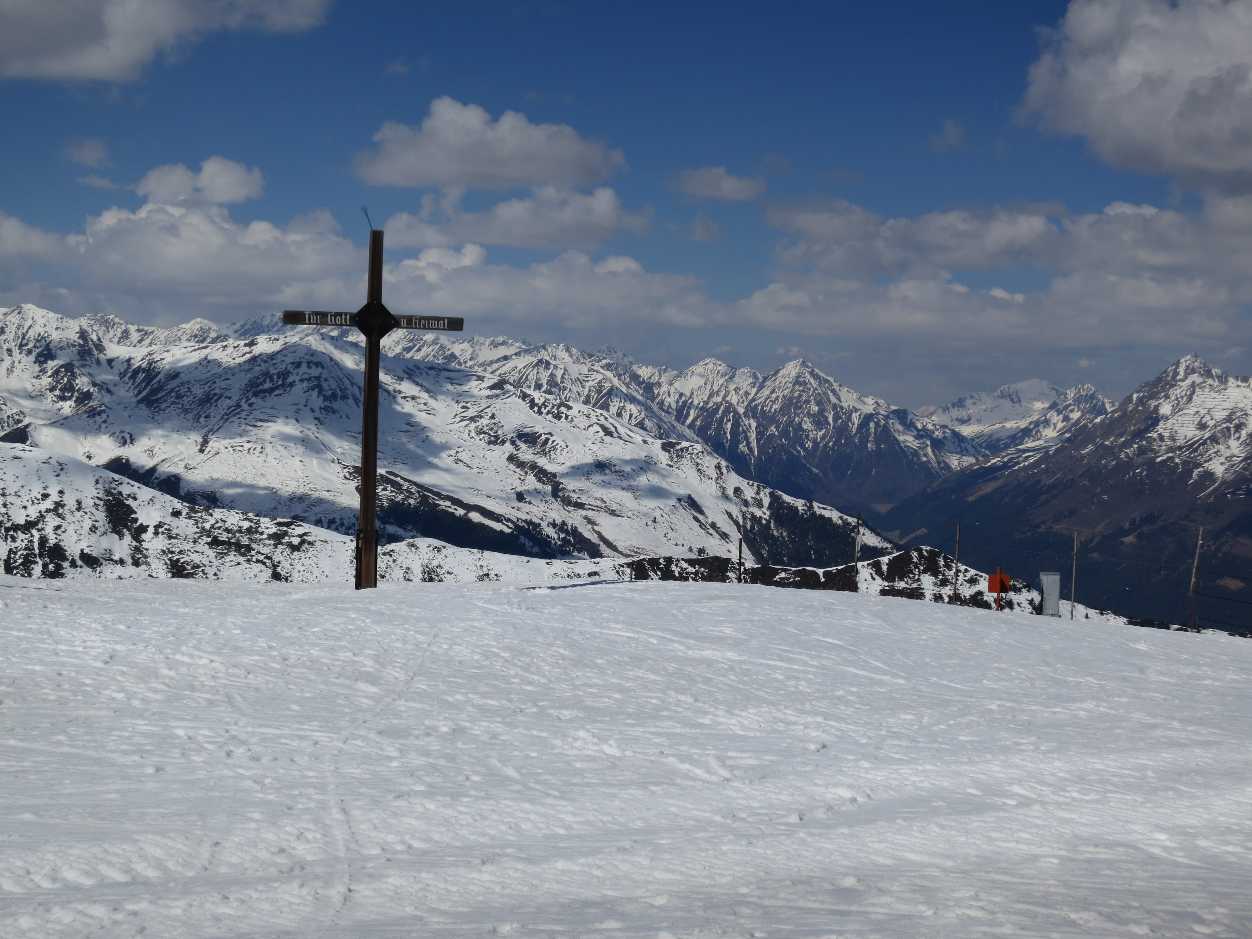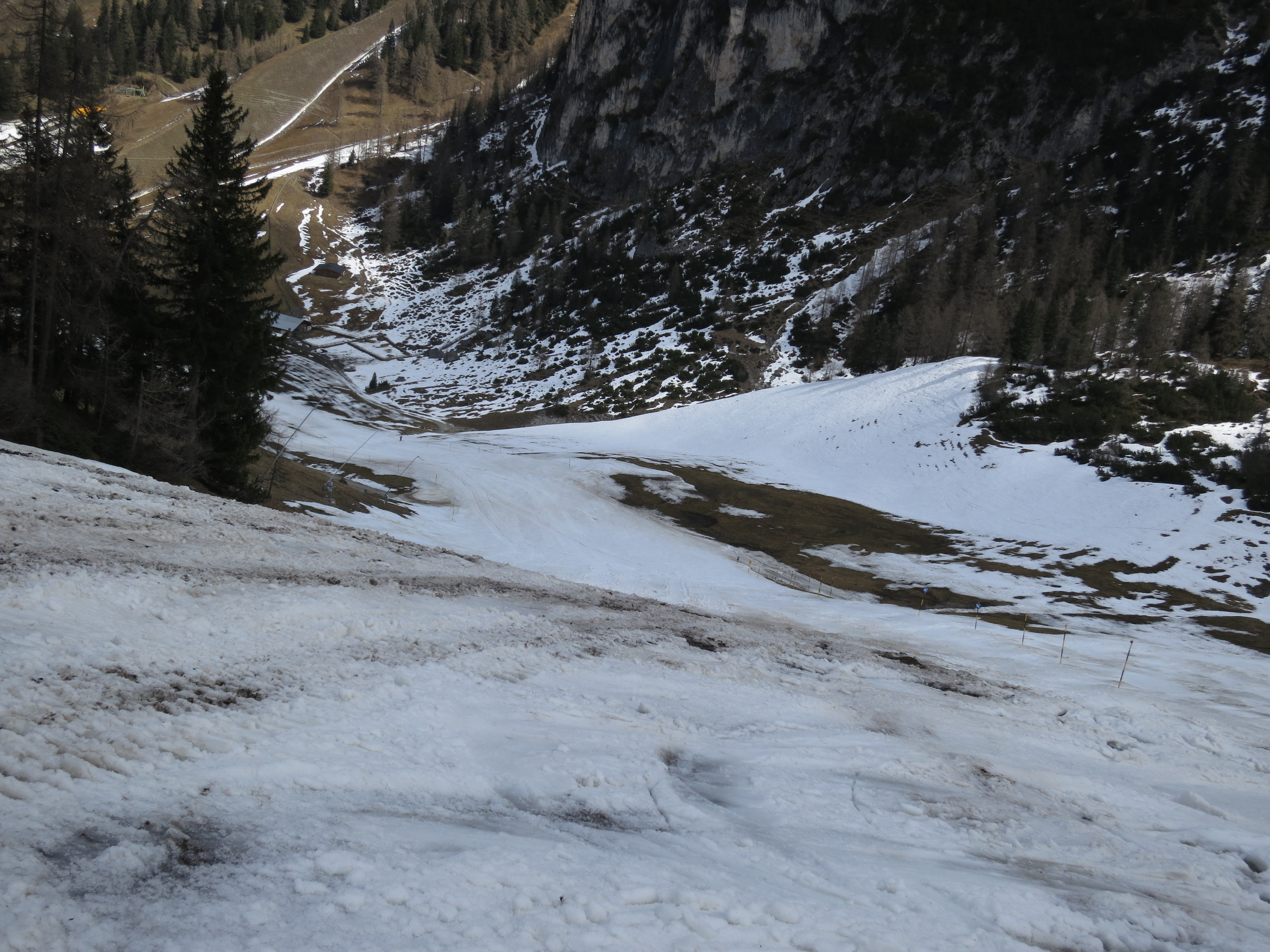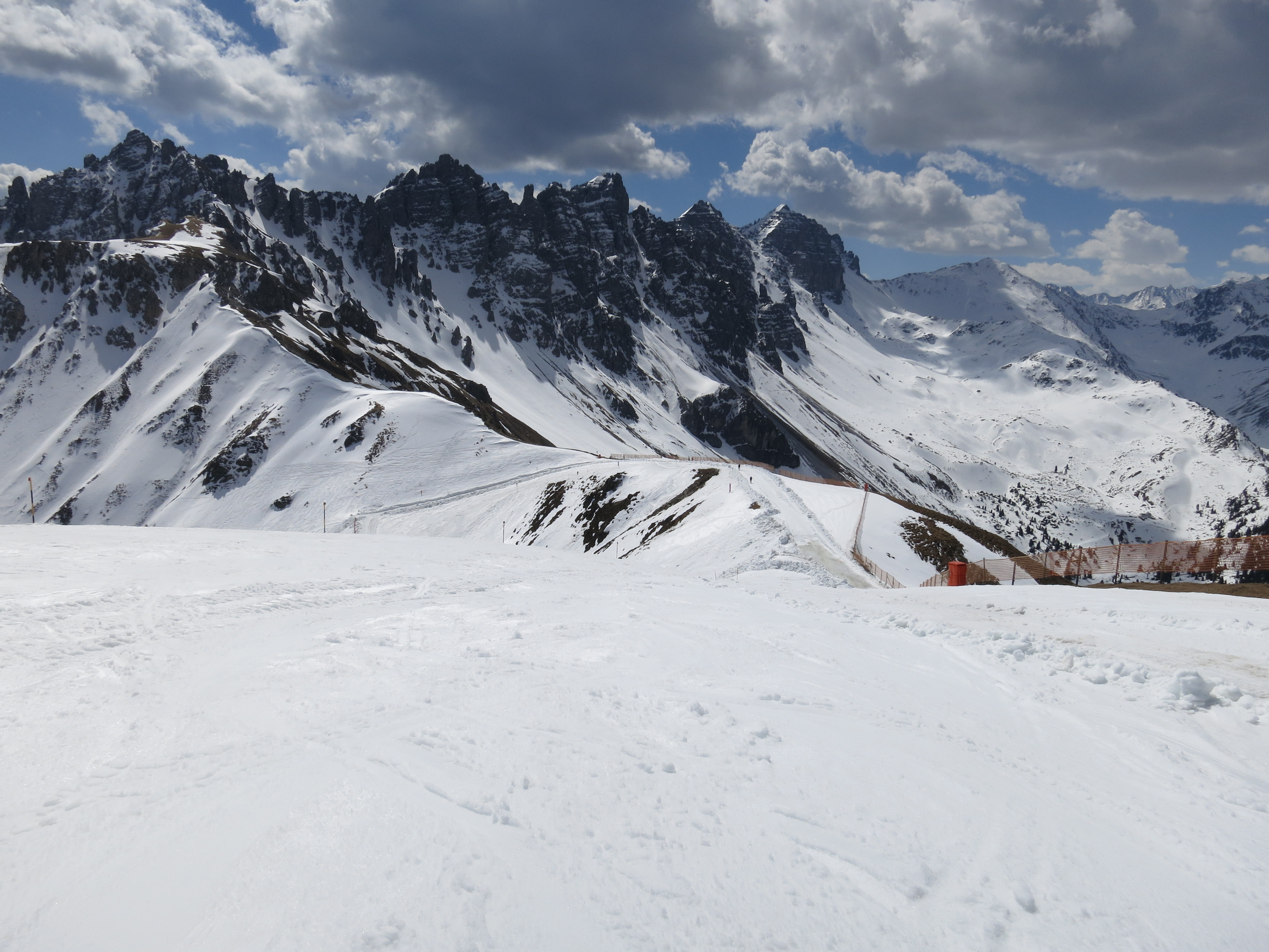 Tourenverhältnisse: Aufstieg und Abfahrt habe ich über die Damenabfahrt gemacht (Piste Nr. 1). Beim Aufstieg war's abschnittsweise (dort wo die Sonne noch nicht wirken konnte) harschig. Der Pistenzustand ist noch einigermaßen gut. Abgefahren bin ich heute um 12 Uhr zwischen wenig Firn und meist sulzigem Schnee (war wohl doch ein Kick zu spät - aber am Gipfel war's sonnig und windstaad, da konnte ich nicht gleich weiter). Die Pistenraupen hatten inzwischen schon angefangen, ihr Unwesen zu treiben (Bild 7), aber bei dem sulzigen Schnee ist das nicht so tragisch.