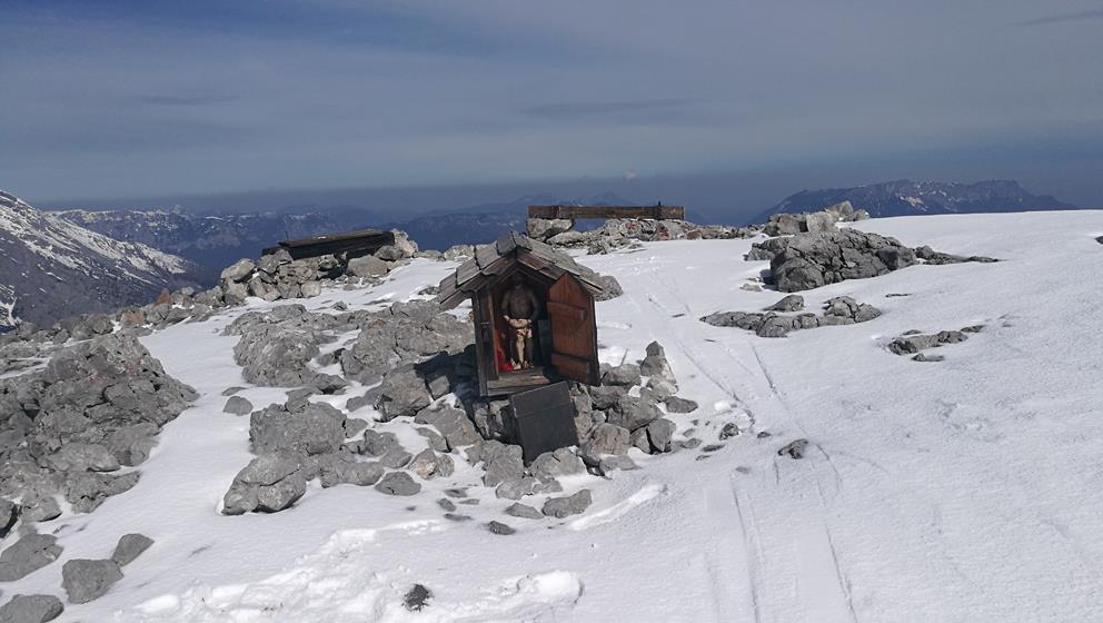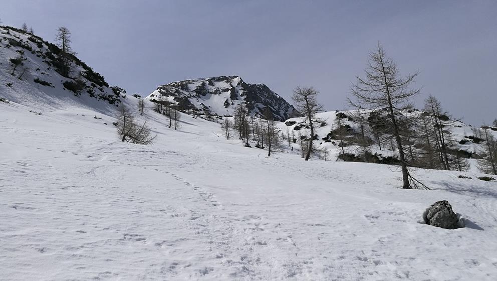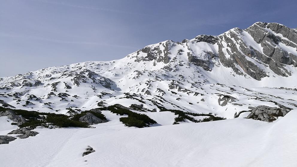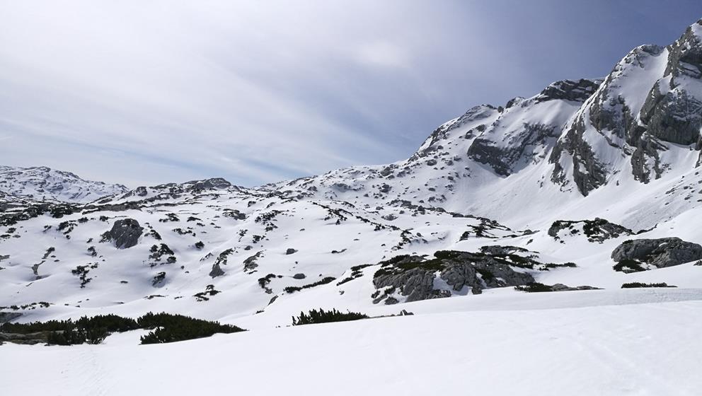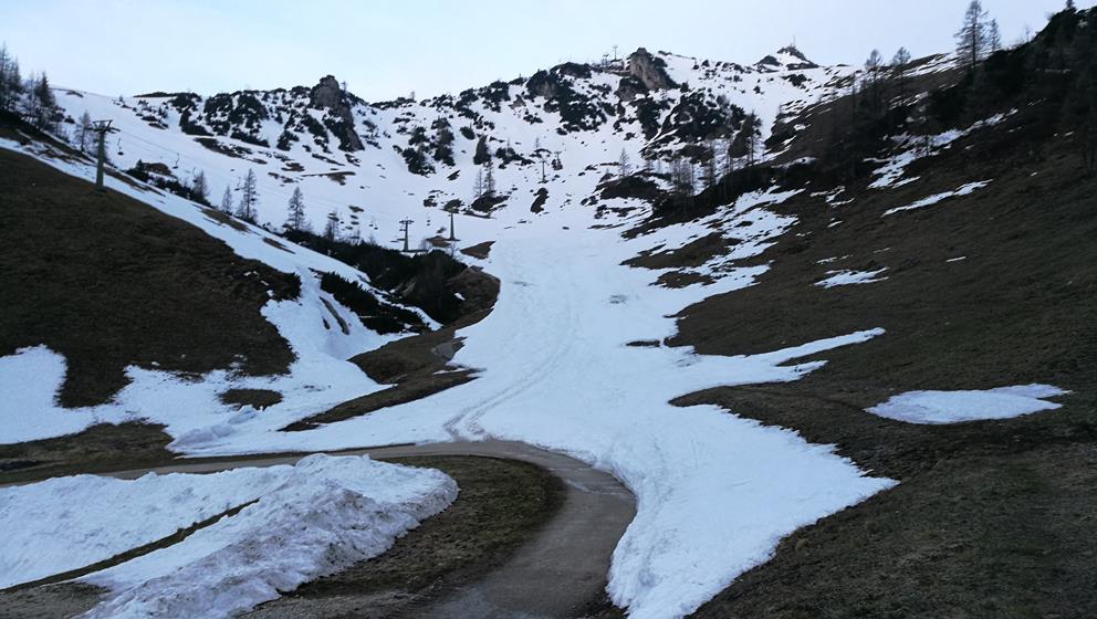 Kurz oberhalb der Königsstalalm müssen die Ski dann getragen werden. Aufstieg zum Schneibsteinhaus wieder mit Ski machbar. Vom Schneibsteinhaus hinüber zum Jenner und abfahrt über die Piste nach Hinterbrand. Traumhafter Firn auf der Piste.