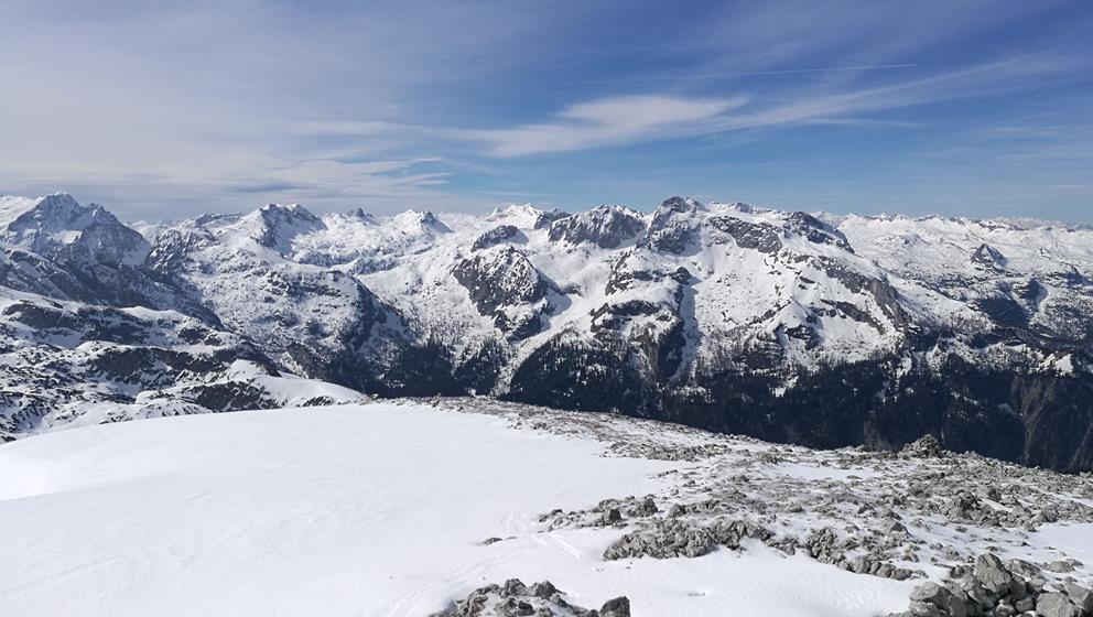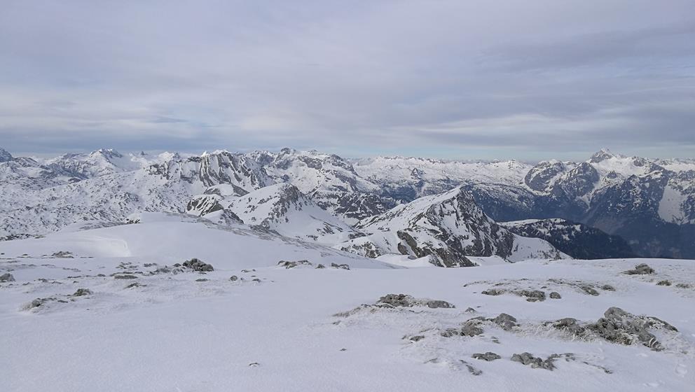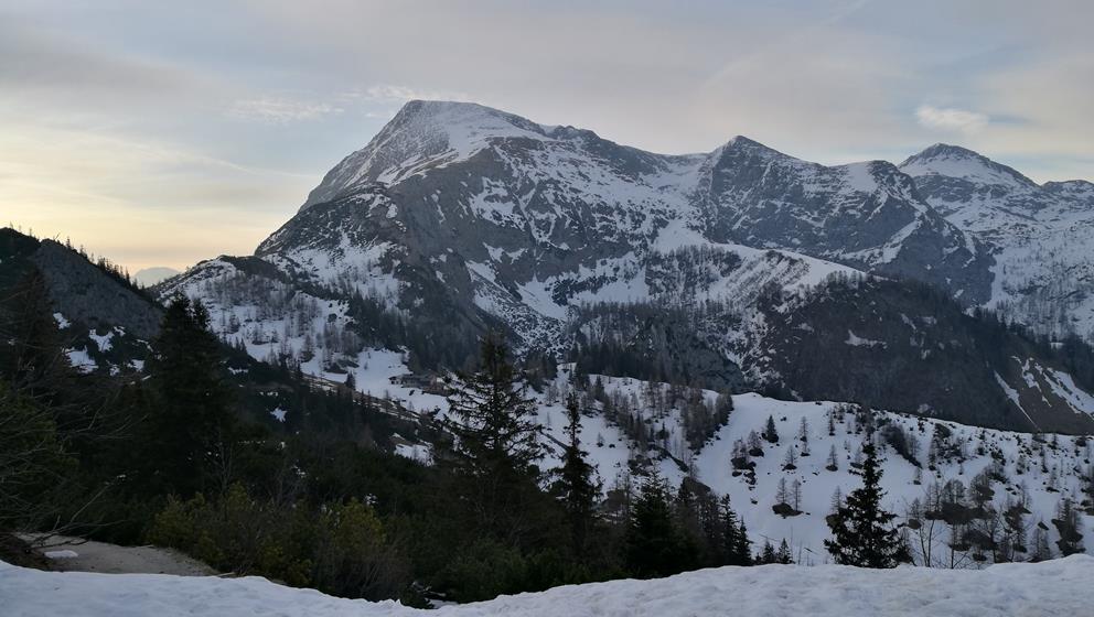 Start um 05:30 Uhr bei Vollmond. Aufstieg über die Jenner Piste bis zur Bergstation des neuen Sessellifts war noch machbar. Ziehweg zur Mitterkaseralm müssen die Ski getragen werden. Ab der Mitterkaser dann wieder mit Ski auf den Kamm. Querung zum Stahlhaus schneefrei. Vom Stahlhaus zum Schneibstein. Latschengürtel ist schneefrei. Die SKi müssen bis nach der Latschensteilstufe getragen werden. Danach durchgängige Schneedecke. Pickelhart im Aufstieg (Harscheisen). Abfahrt vom Schneibstein zur Windscharte mit 2 kleinen Schneefreien stellen. In die Windscharte müsen die Ski auch kurz getragen werden. Aufstieg Richtung Windschartenkopf und Schlumkopf problemlos. Abfahrt in die Schlum pickelhart und 2cm Neuschnee sehr gut zu fahren. Aufstieg durchs Hagengebirge und über den Rücken auf den Kahlersberg.