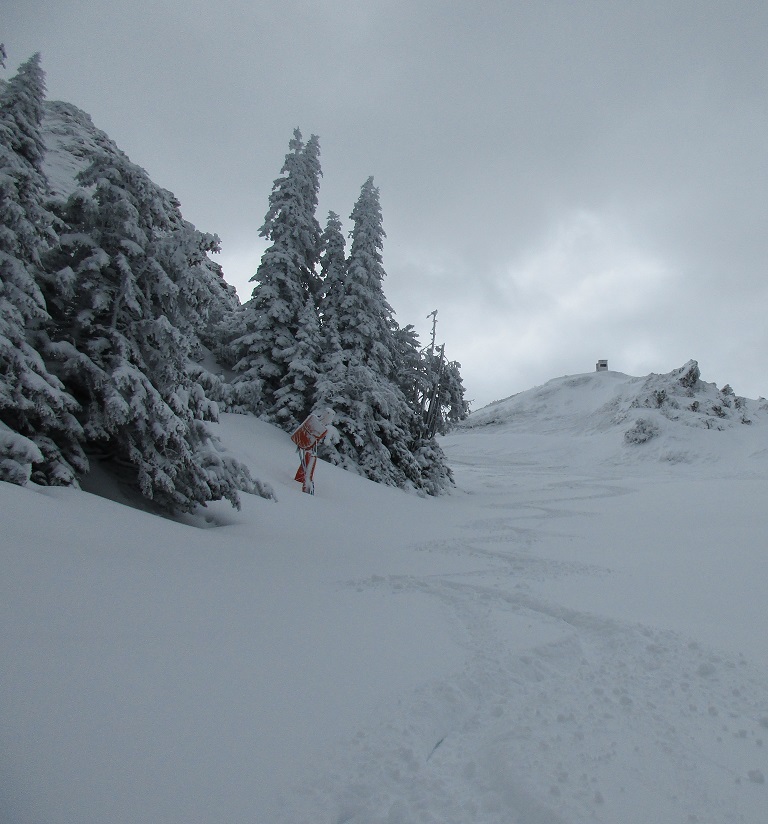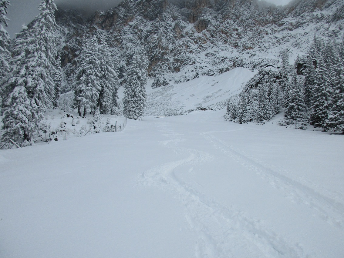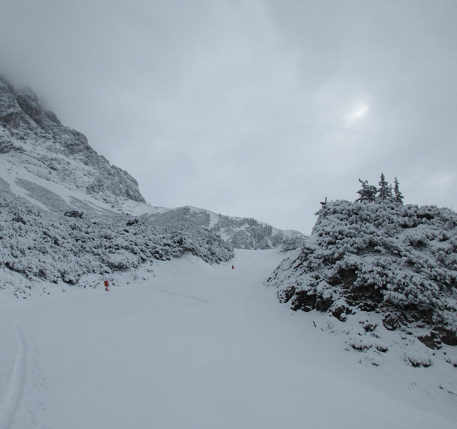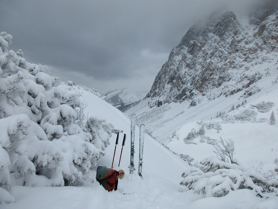 Schnee ( morgens ) vom Start weg / bis 1500 m feuchter Schnee ... darüber wirds pulvrig / ... von wenigen cm steigert es sich sich auf gut 30 cm / oben windig