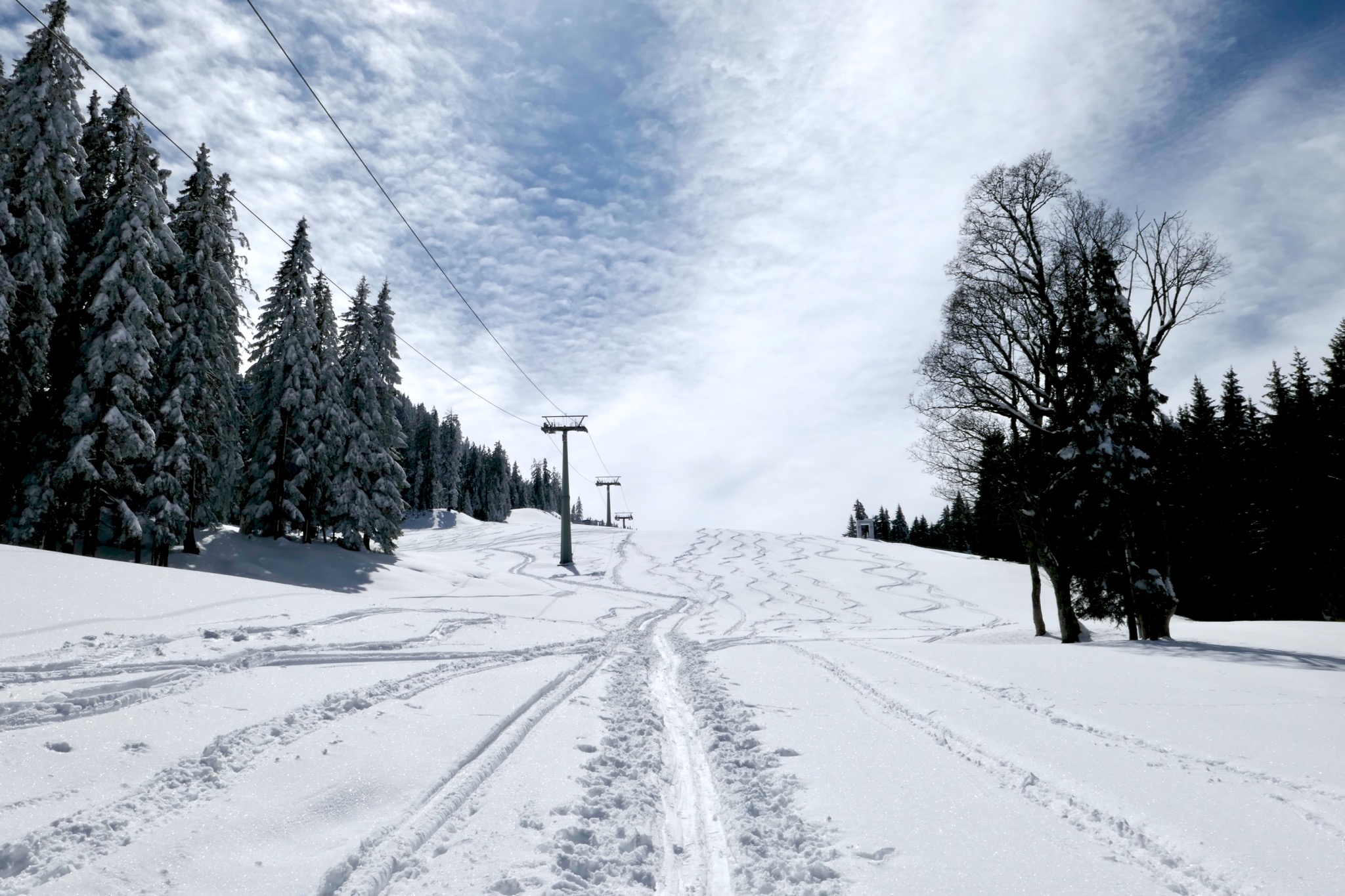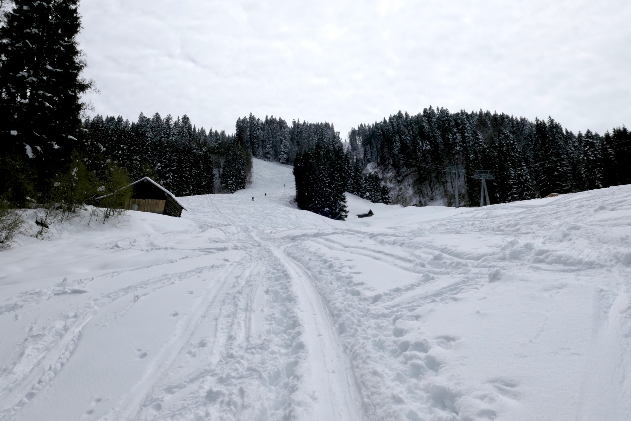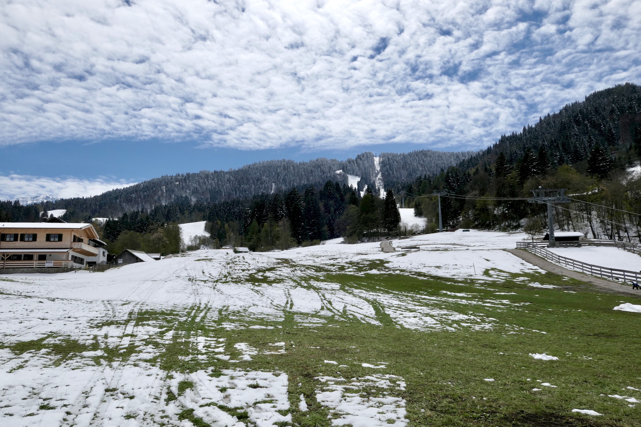 Sonstiges: Am Ostermontag wurde es nochmal Winter, aber erst am Freitag scheint die Sonne: Vom PP Hausbergbahn (710m) auf ganz dünner Schneedecke Richtung Horn-Abfahrt und dann weiter auf reichlich Schnee die Horn-Abfahrt auf den Hausberg hinauf und weiter Richtung SW zur Kreuzwankl-Bergstation. Runter über die schön zu fahrende Kochelberg-Abfahrt, die jedoch unten jetzt schon schneefrei ist – so schnell kann’s geh’n!