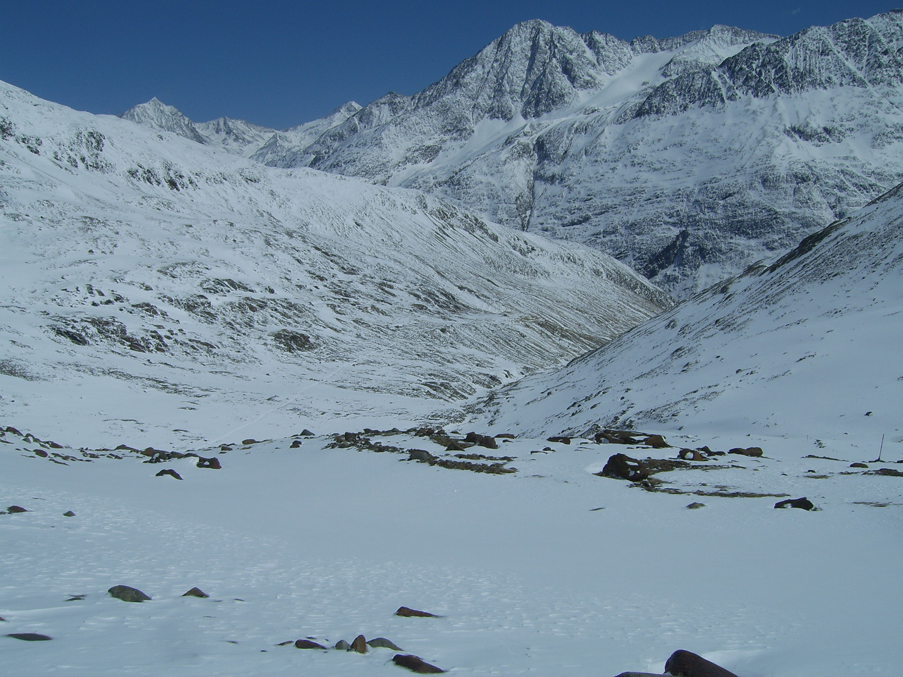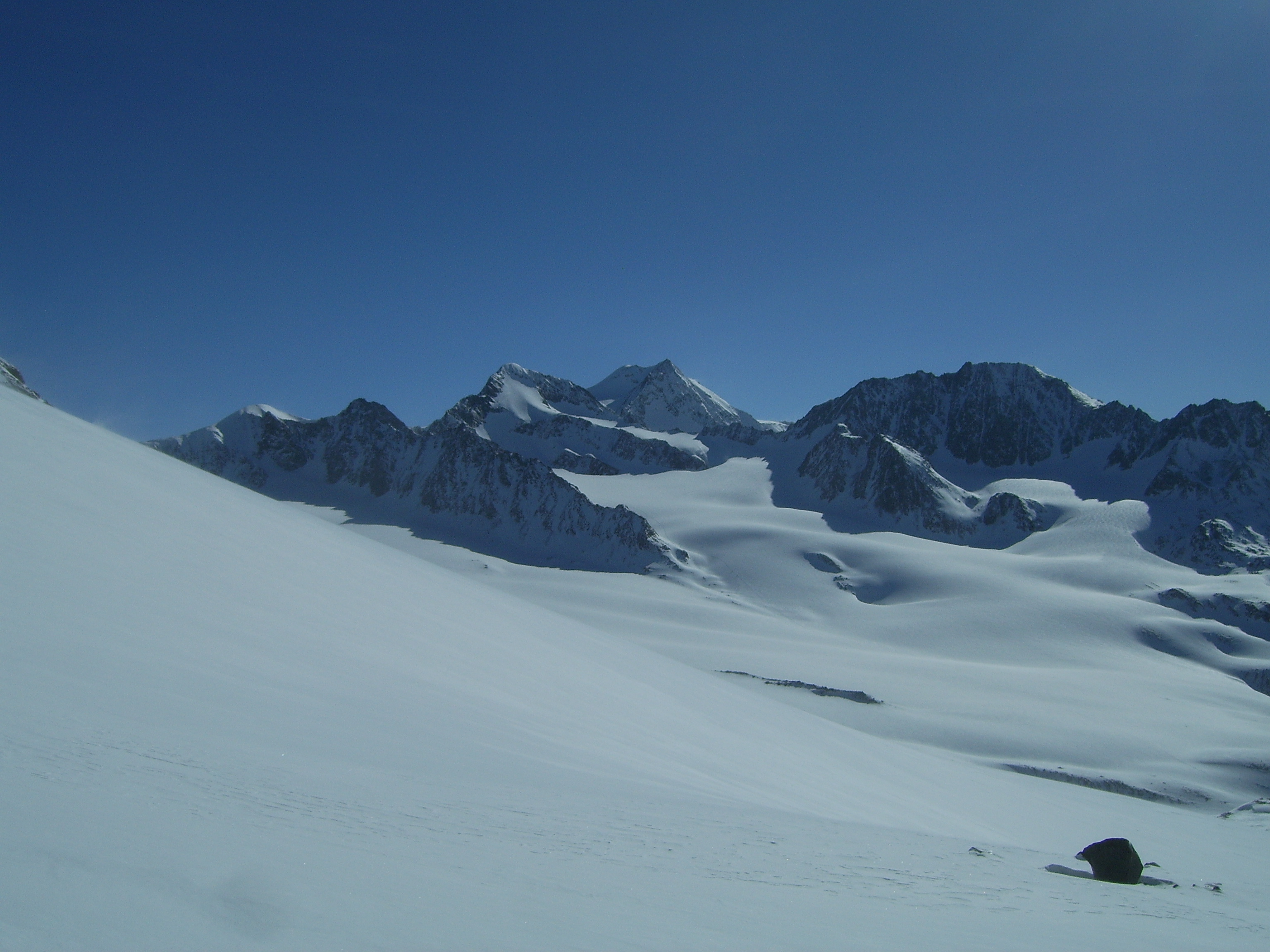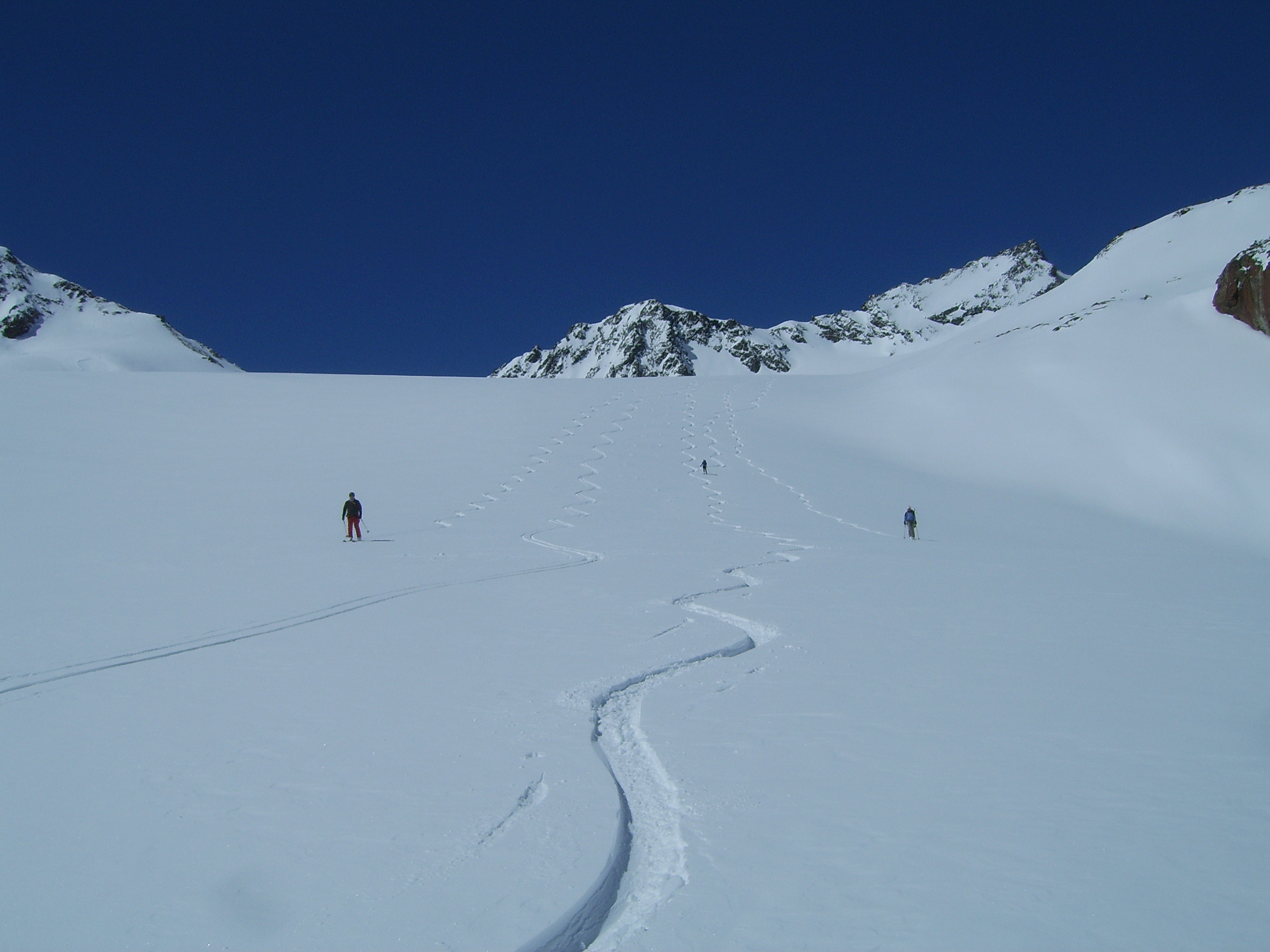 Tourenverhältnisse: Der Aufstieg zur Hütte war am Donnerstag noch auf den frisch gefallenen Neuschneeresten möglich. Jetzt beginnt der Schnee erst nach dem Vernagtegg auf ca. 2500m.Sehr gute Bedingungen auf den durchgeführten Touren. Kaum Spalten gesehen, nur weit abseits der üblichen Routen. Schnee: zwischen 10-30cm windbehandelter Pulver, jedoch super zu fahren. Kammnah allerdings hart gepresst oder abgeblasen. Von Tag zu Tag zunehmender, teils starker Wind meist aus Nord, entsprechende Verfrachtungen inklusive. Insgesamt wenig Schnee im Gebiet.