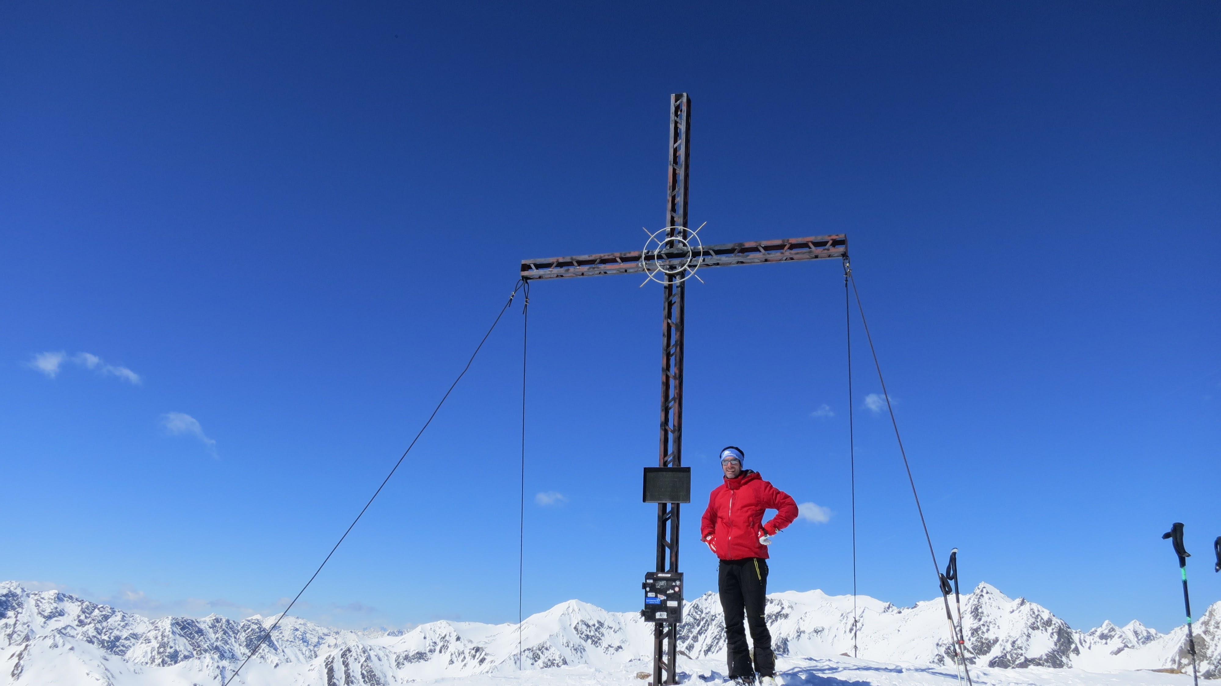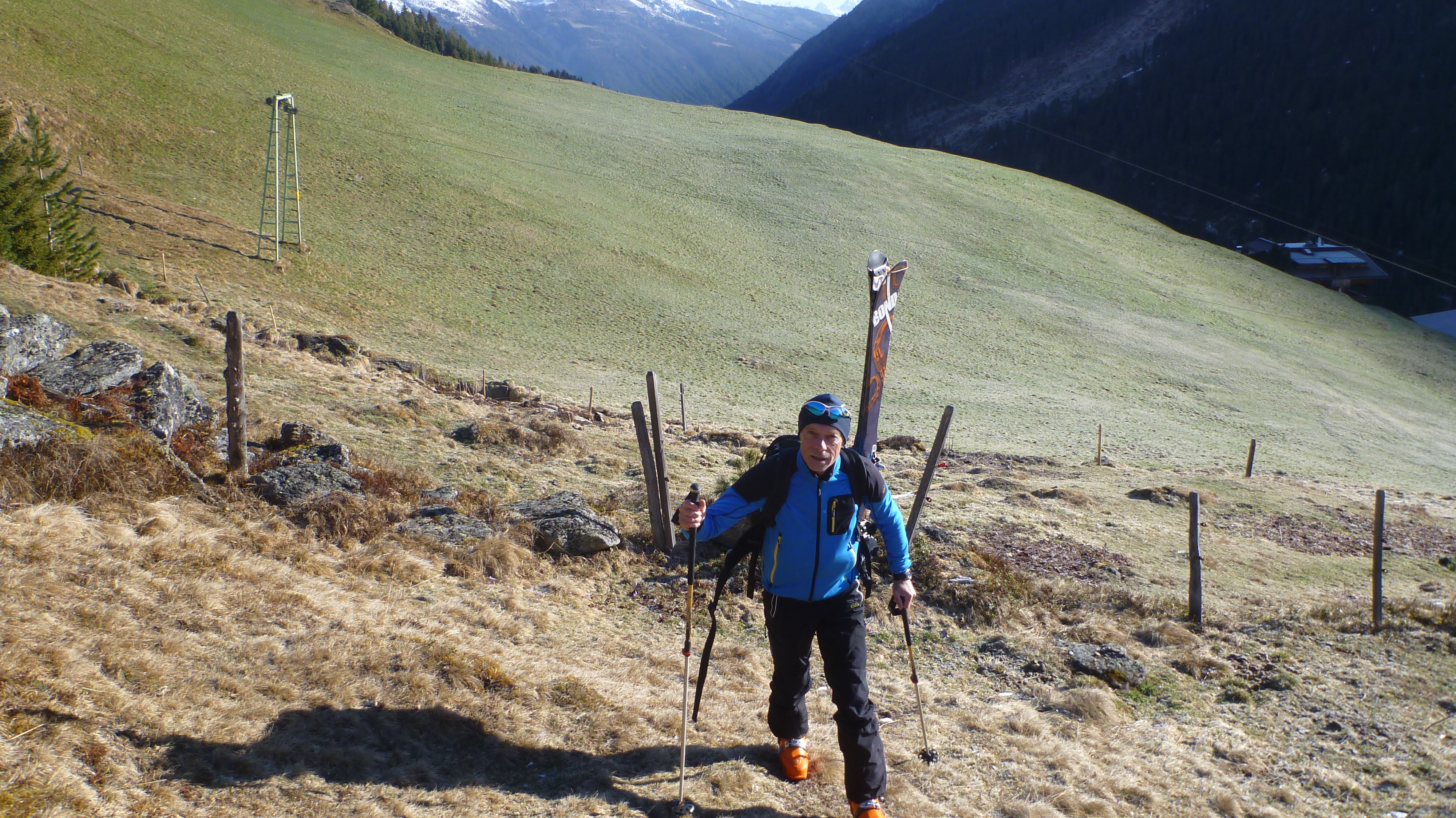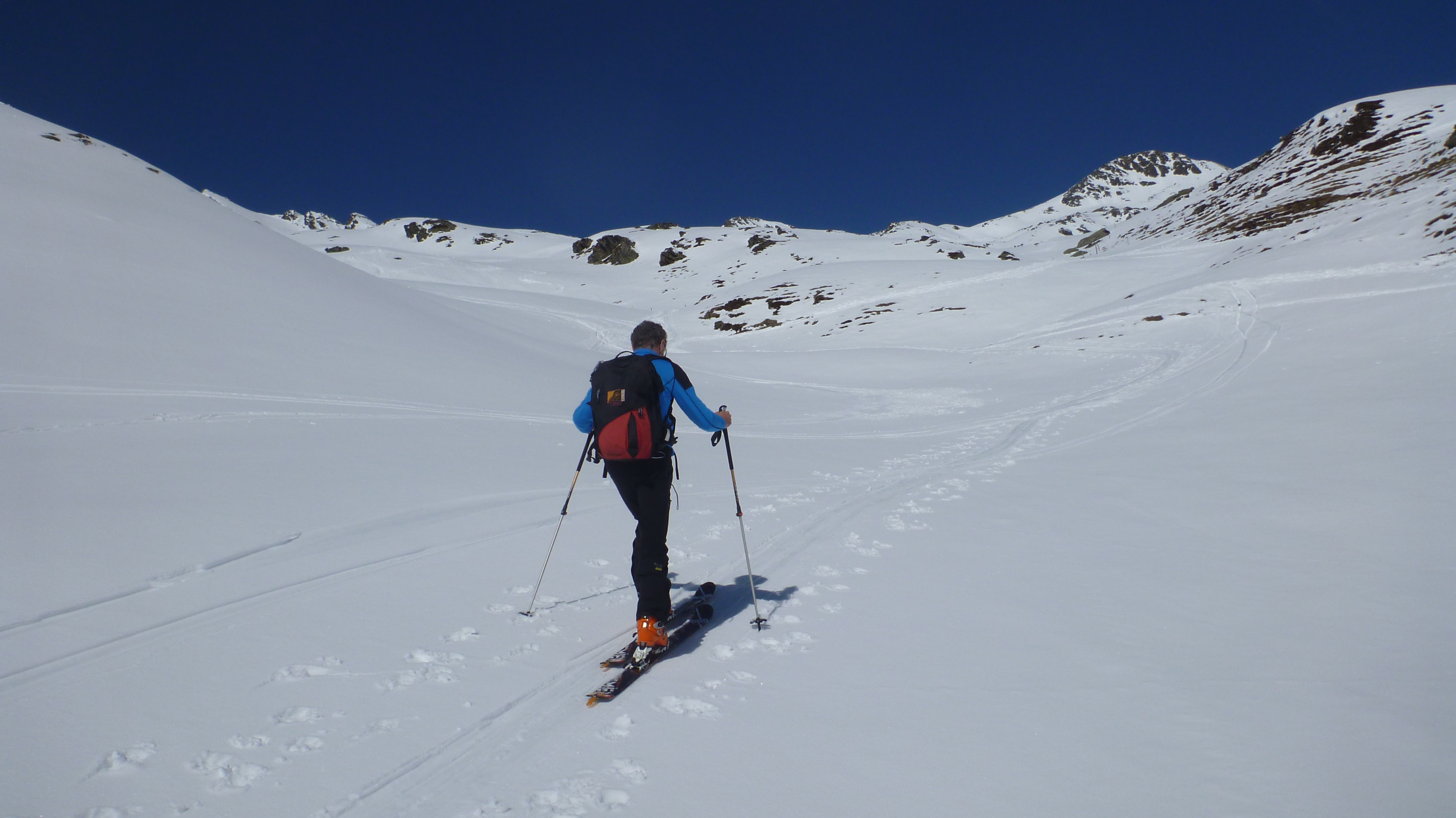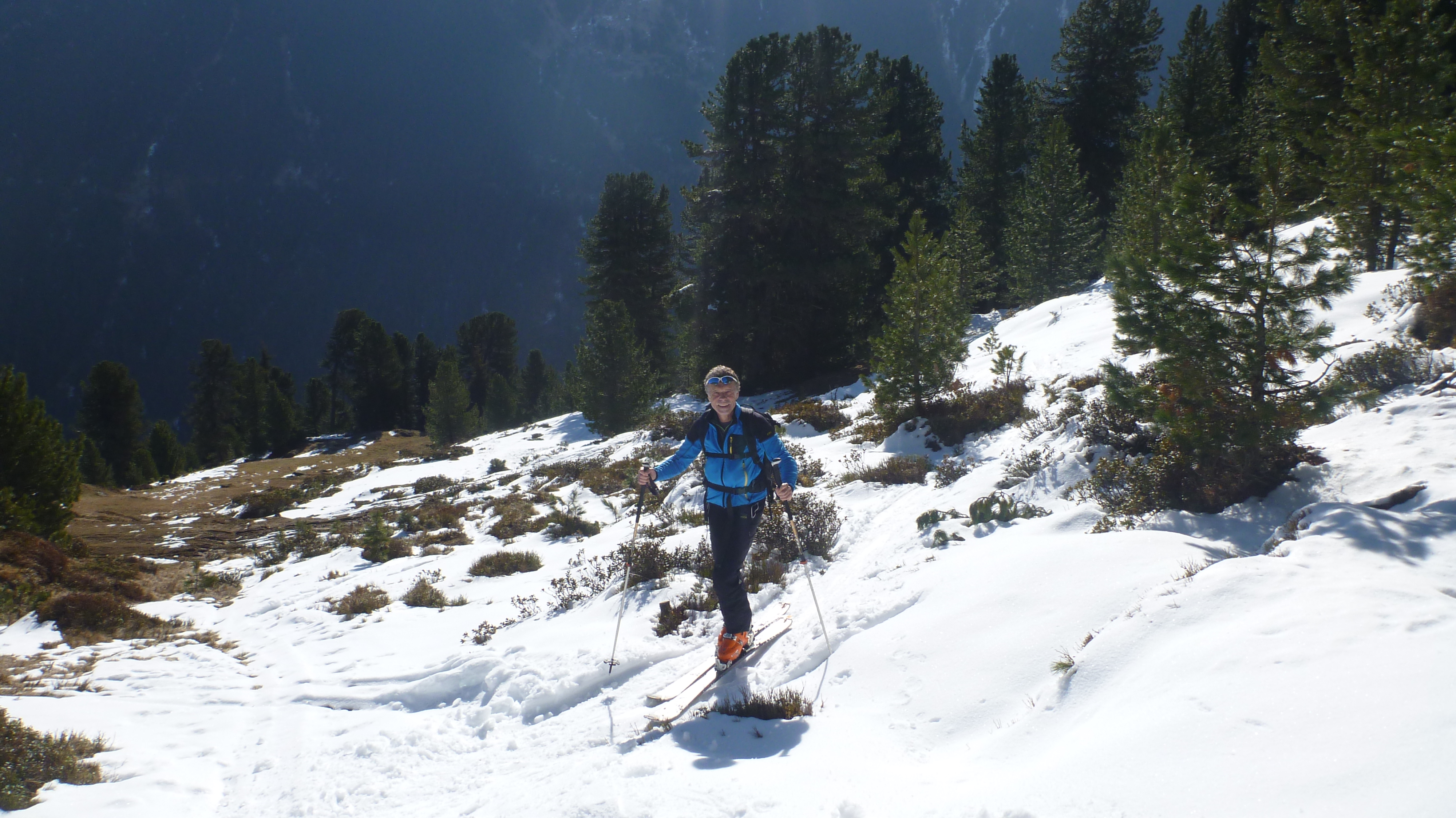 Sonstiges: vom PP weg zunächst 30 min Ski tragen entlang der üblichen Aufstiegsroute, danach der Aufstiegsspur sehr weit rechts in vielen Spitzkehren aufwärts folgend, lange Querung zum Schönbichl und weiter in der üblichen Aufstiegsroute durch Mulden zum Skidepot.