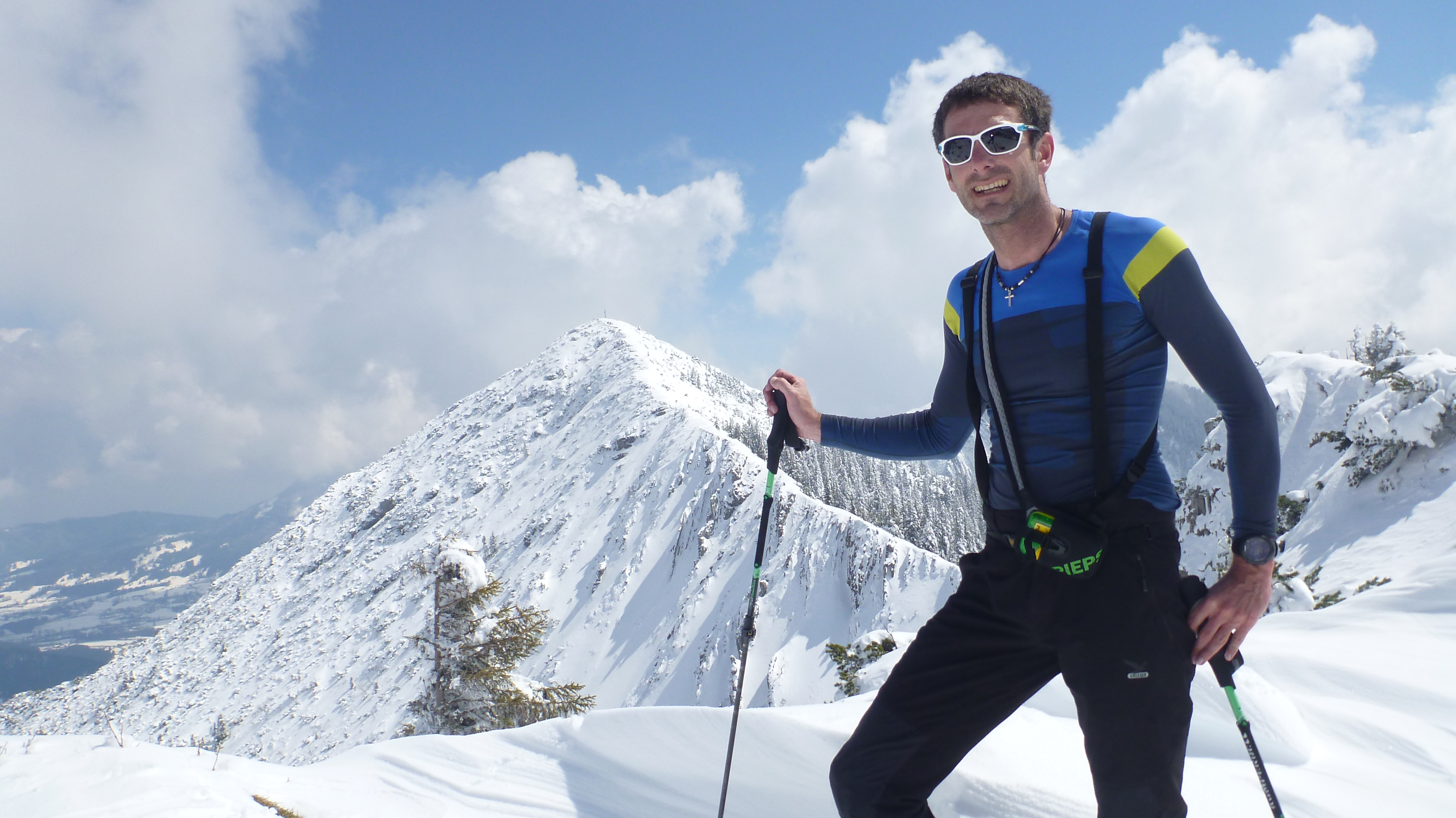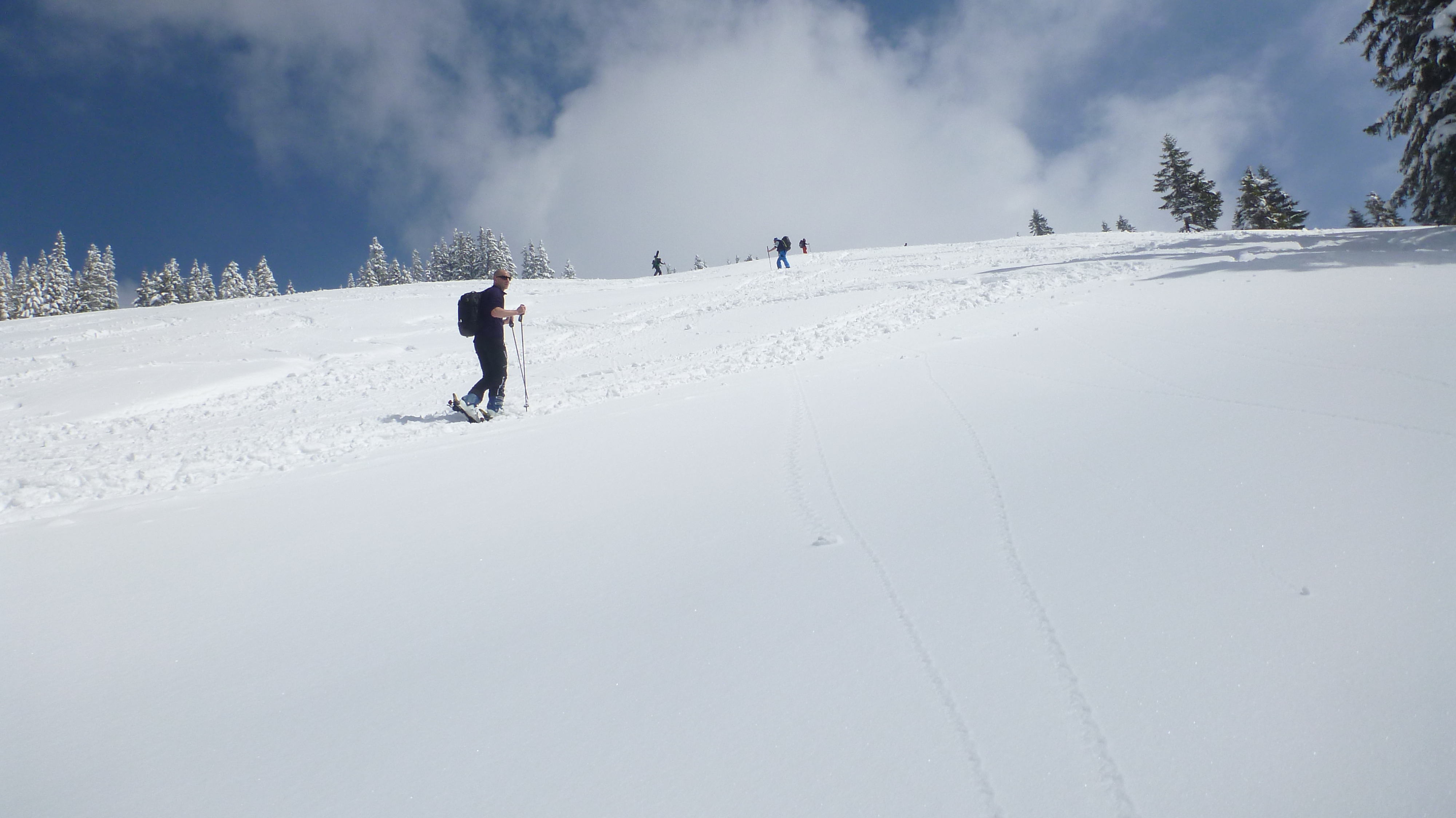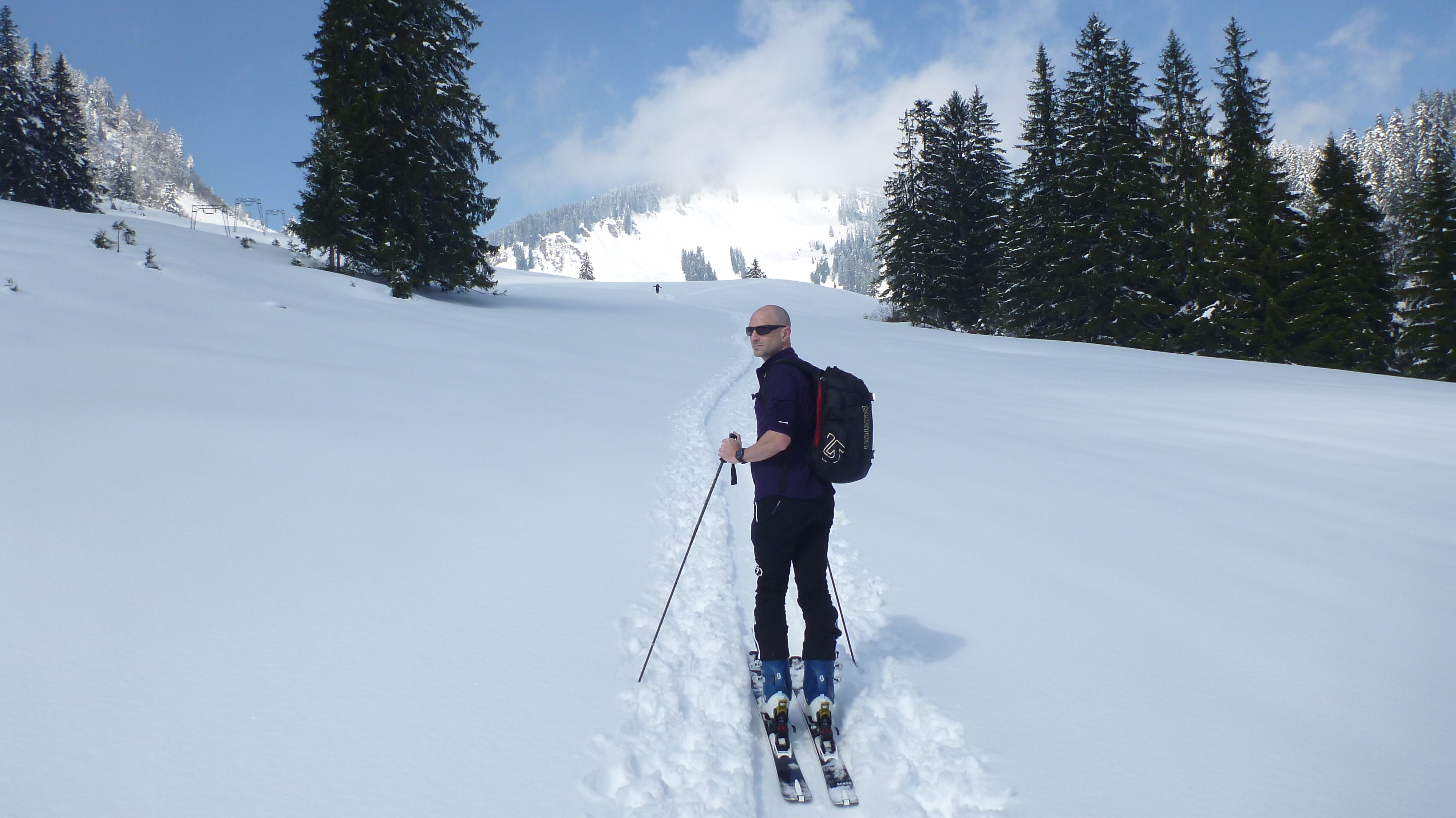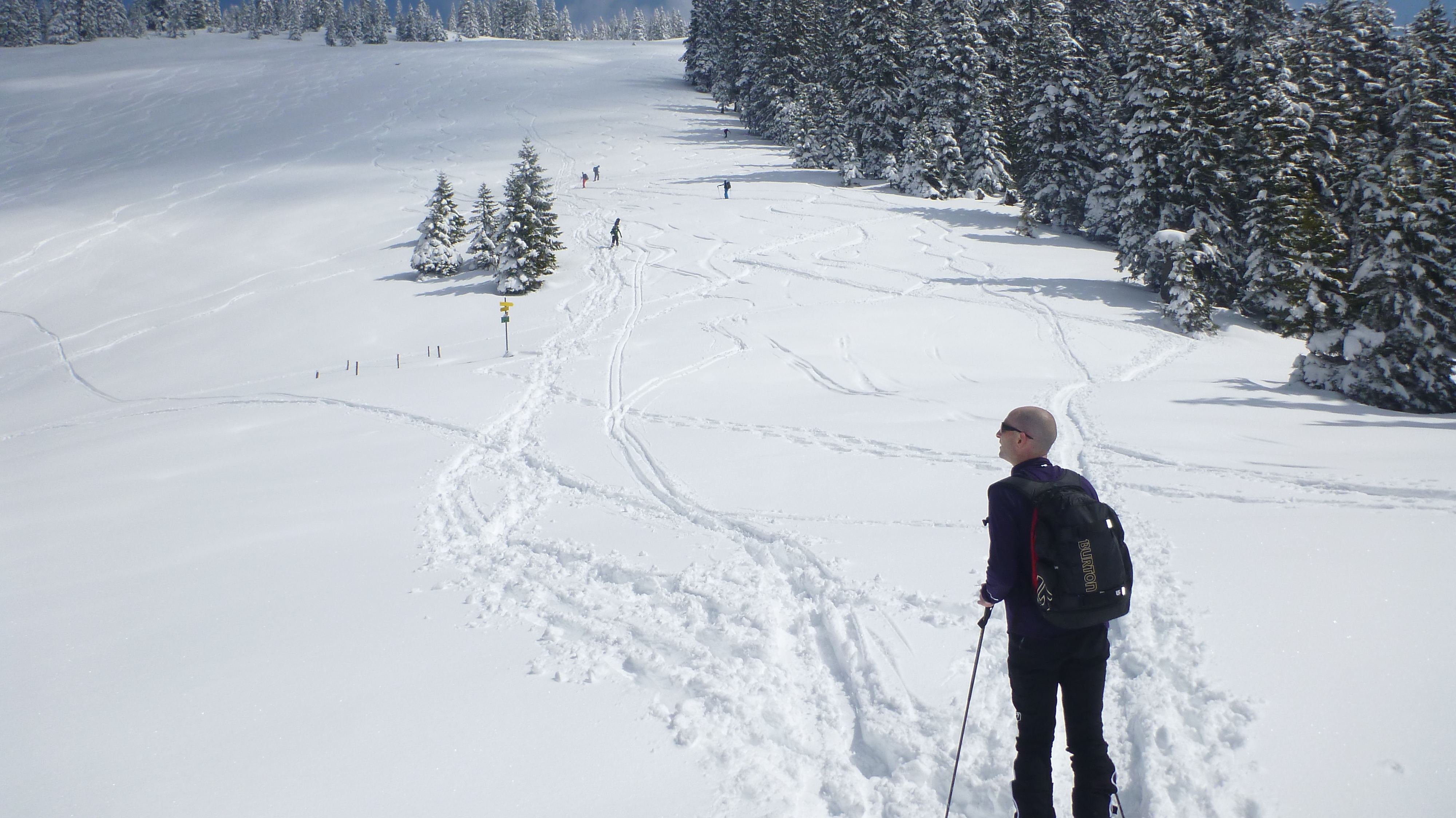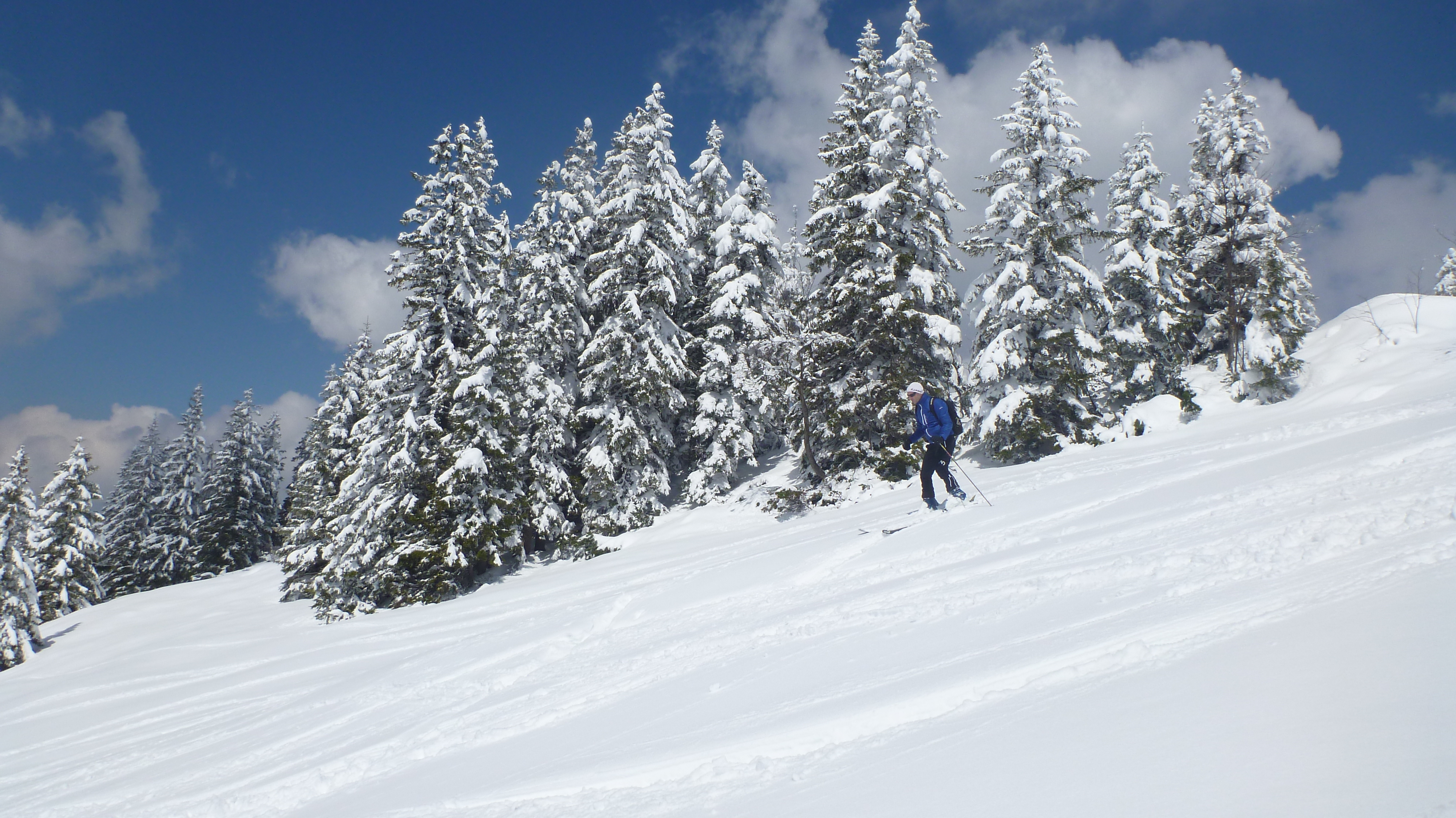 Tourenverhältnisse: für die Jahreszeit unglaublich gute Verhältnisse. Aufstieg vom PP zur Unteren Firstalm und weiter zur Oberen Firstalm. Von dort auf der rechten Seite zum Skigipfel. Abfahrt wie Aufstieg durch gut zu fahrenden, schon recht schweren Pulver.
