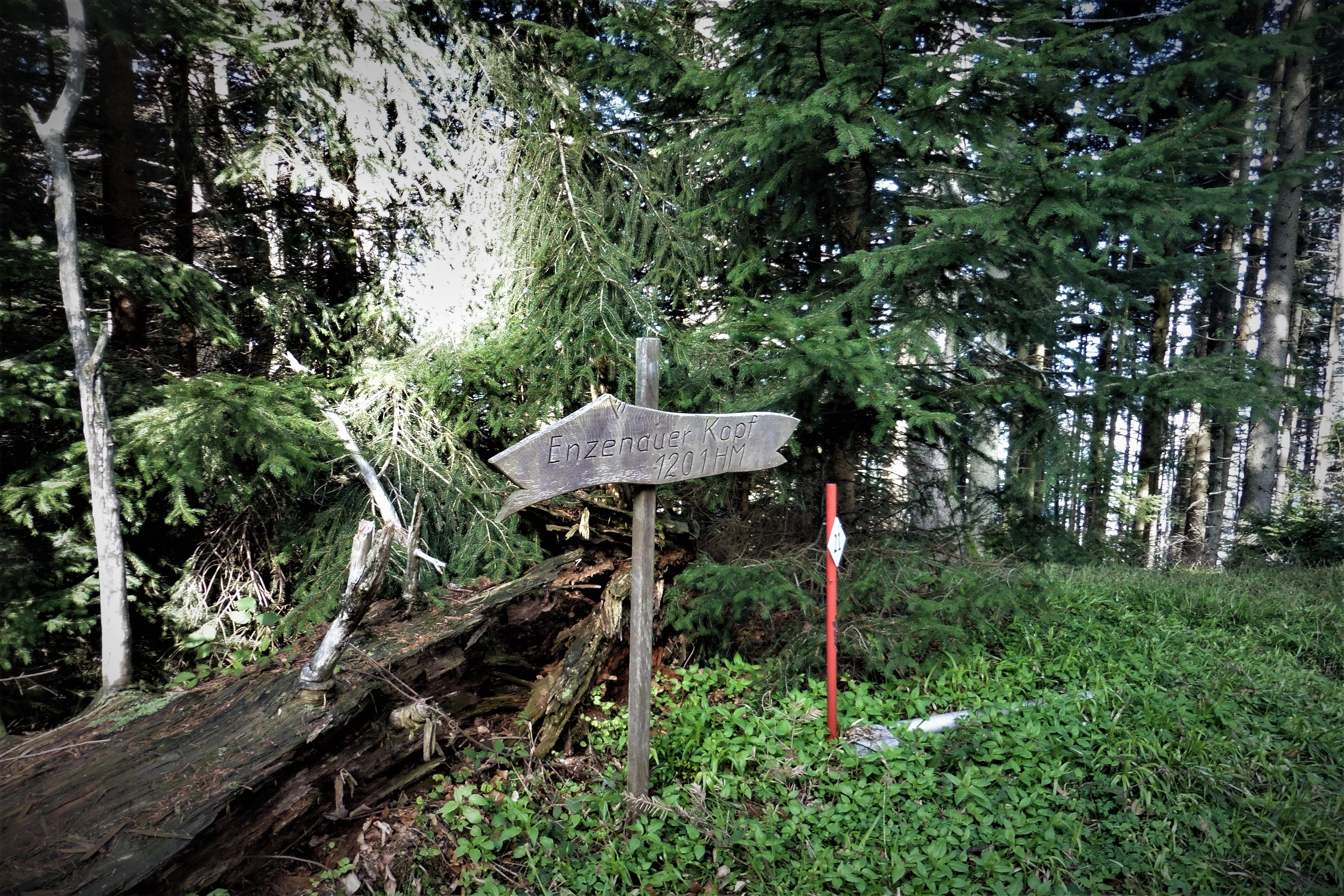 Vom Parkplatz zurück nach Obersteinbach, über die Brücke und dann entweder über die Forststraße oder diverse Abkürzungen bis zum Punkt 873m; dort nicht wie auf der Karte eingezeichnet, direkt auf den Rücken sondern, etwas bequemer der Forststraße noch ein Stück folgen bis links ein Karrenweg abzweigt; über diesen auf den Bergrücken und immer geradeaus hinauf; unterhalb des Enzenauer Kopfes zweigt links eine schmale Waldschneise ab; auf dieser (deutliche Trittspuren) steil auf den Gipfel; weiter auf dem Grat über die anderen Erhebungen zum Zwiesel;