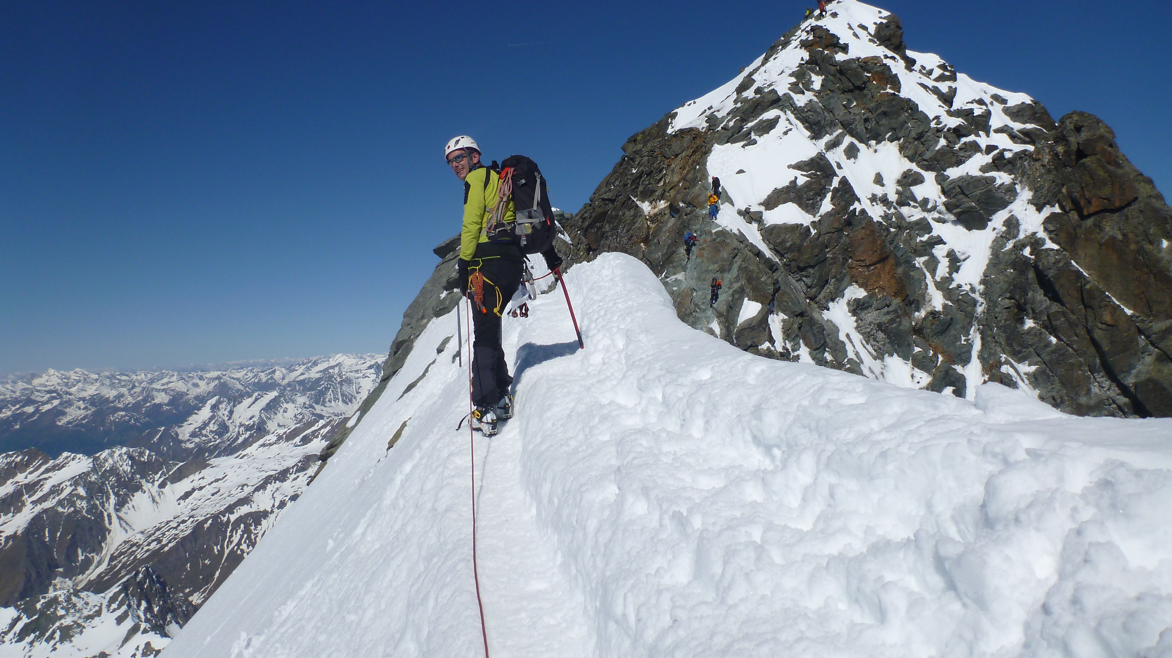 Sonstiges: Aufstieg vom Lucknerhaus über die Lucknerhütte zur Stüdlhütte, weiter zum Ködnitzkees und über den Steilhang, zuletzt mit Steigeisen zum Bahnhof. Von dort wieder mit Ski zum Ansatz des Leitls, dieses in gutem Trittfirn aufwärts und vom Sattele in guter Spur am laufenden Seil zum Kleinglockner, dort kurzer Stau vorm Abstieg in die Scharte und auch im Aufstieg (entgegenkommende 8er Seilschaft) auf den Gipfel. Dort traumhaftes Panorama. Nach kurzer Pause Abstieg und Abfahrt zunächst bis zum Bahnhof. Dort Einstieg in den Steilhang und super Abfahrt im Firn über das Ködnitzkees bis kurz oberhalb der Lucknerhütte.