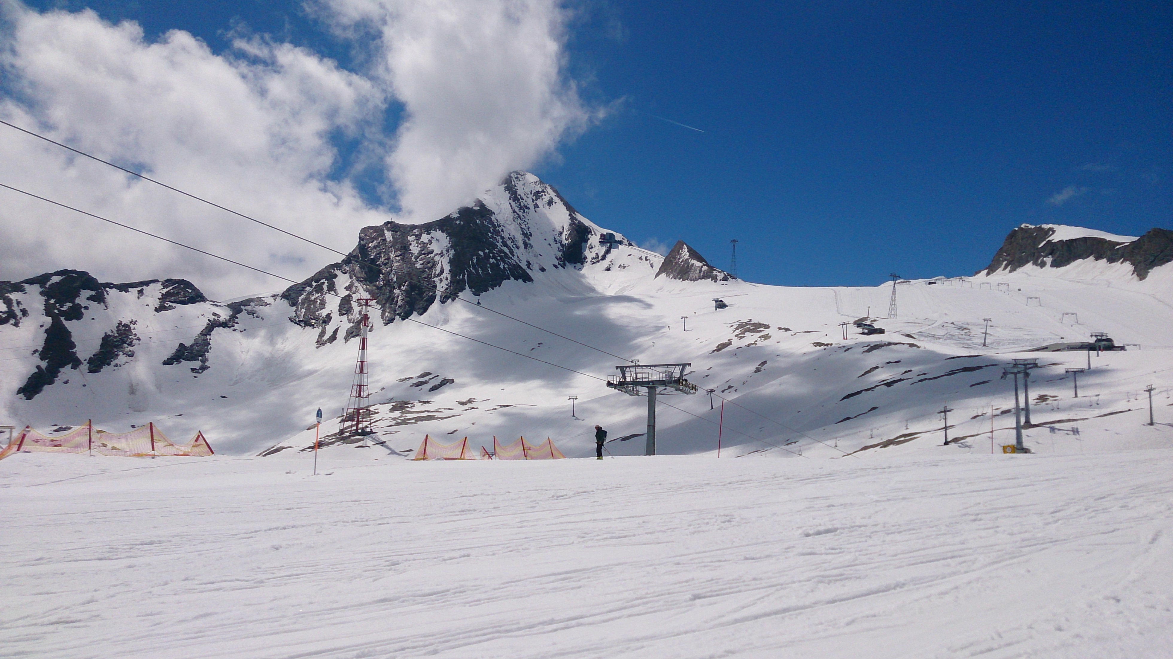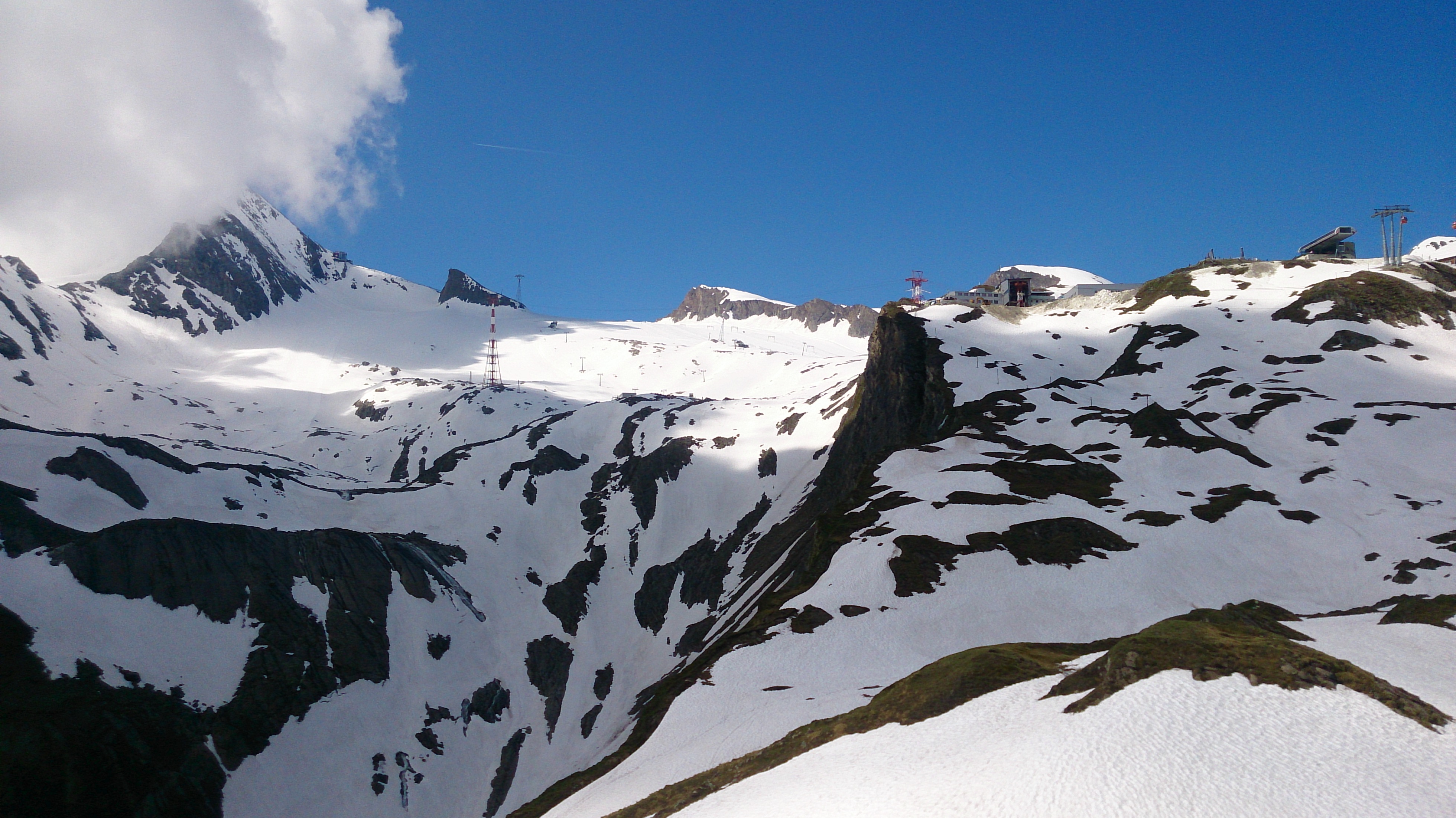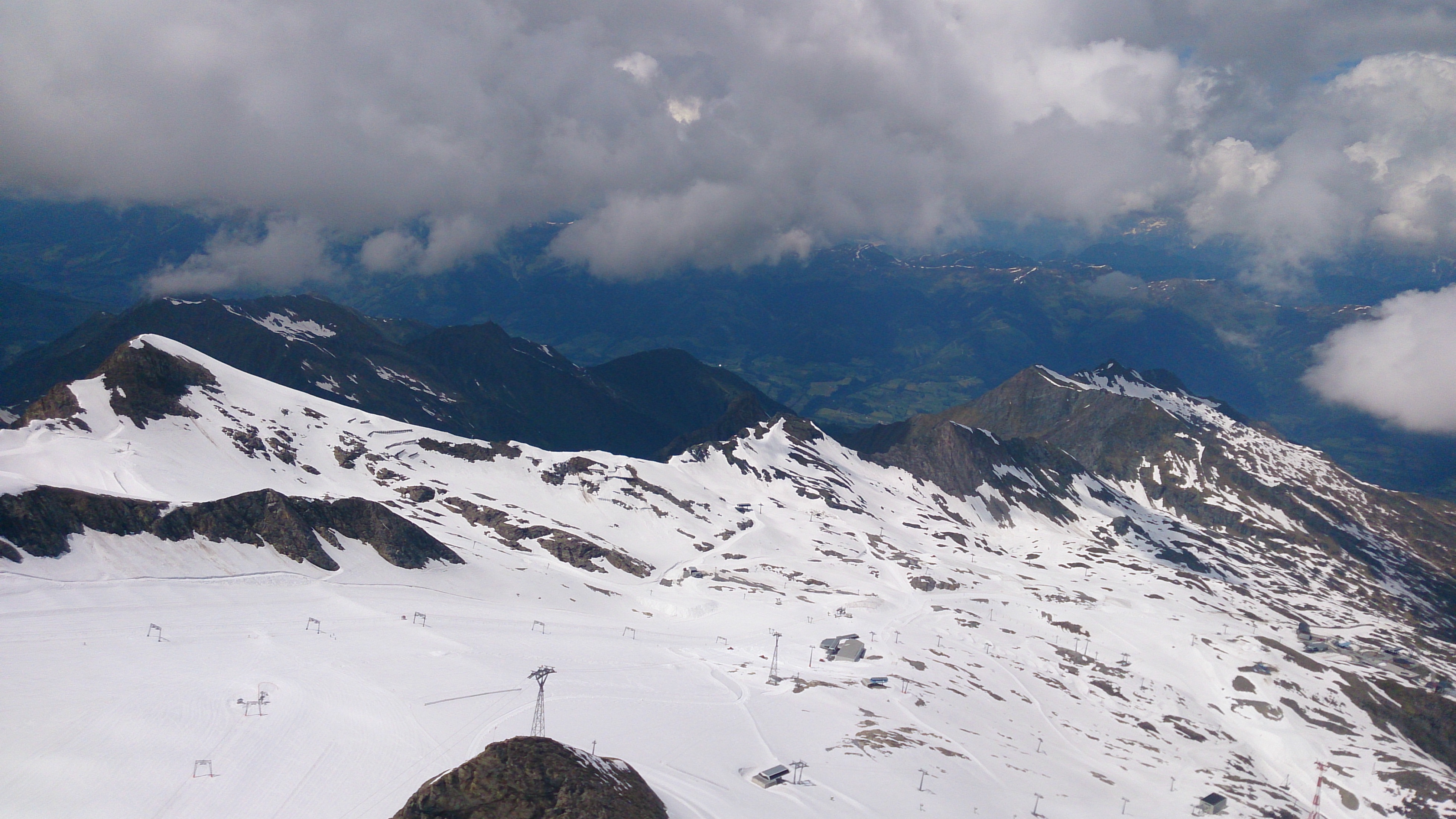 Der Aufstieg zu Fuß mit dem schweren Gepäck zieht sich doch etwas. Im Tal noch anfänglicher Nebel, oberhalb wurde es gleich schwül-warm. Bis zur Krefelder Hütte ging ich über den sog. Krefelderhüttensteig zu Fuß, oberhalb der Salzburger Hütte noch Schneefelder (gingen am Vormittag problemlos). Ab der Hütte dann mit Skiern, ab dem Alpincenter entlang der geöffneten Piste. Viel Betrieb war aber nicht. Am mühsamsten ist der Anstieg ab der Bergstation Gletscherjet 4 zum Gipfel: Zunächst zum Gletscher-Shuttle (Standseilbahn), dort einige Meter zu Fuß, dann wieder alles mit Skiern bis oberhalb der Bergstation der Gipfelbahn. Achtung beim Queren zu den Drahtseilen des Normalaufstiegs: Hier teilweise Blankeis unter wenig Schnee. Die Drahtseile zum Gipfel sind überwiegend frei, aber nicht alle. Außerdem gibt es viele vereiste Stellen. Es ging ohne Steigeisen und Pickel dank des Drahtseils und eines Textilseils sowie teilweise Ausweichen in die Felsen. Normale Liftfahr-Gipfelaspiranten sollten vielleicht noch etwas warten.