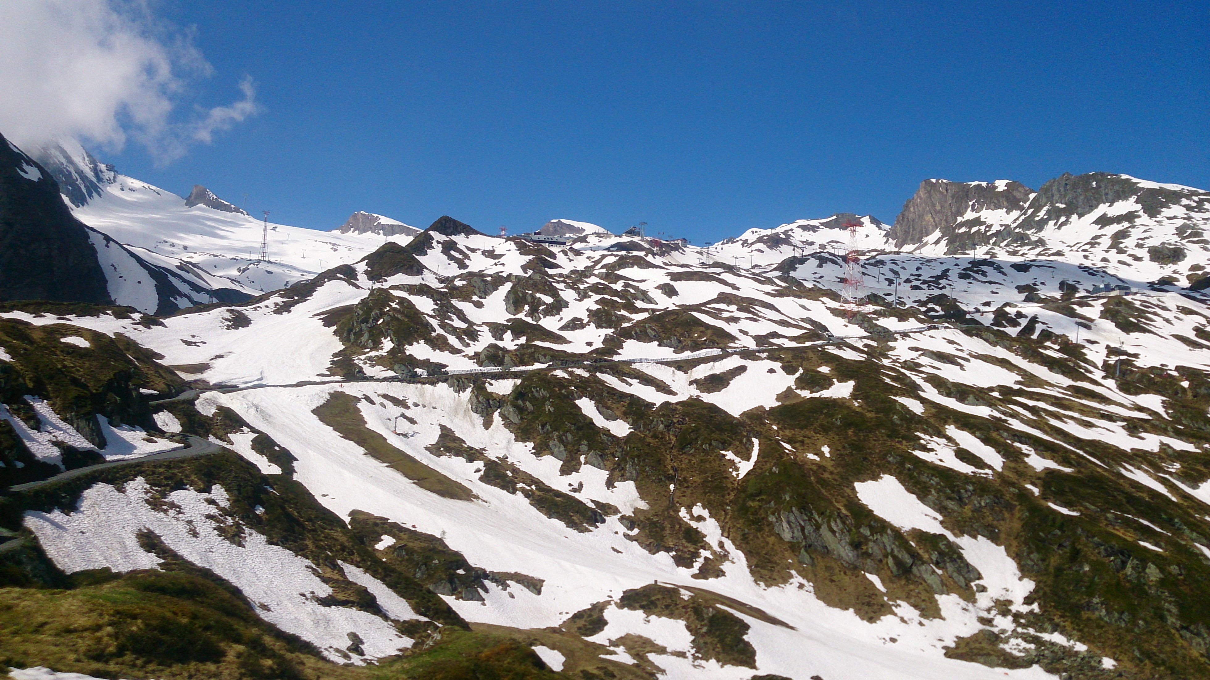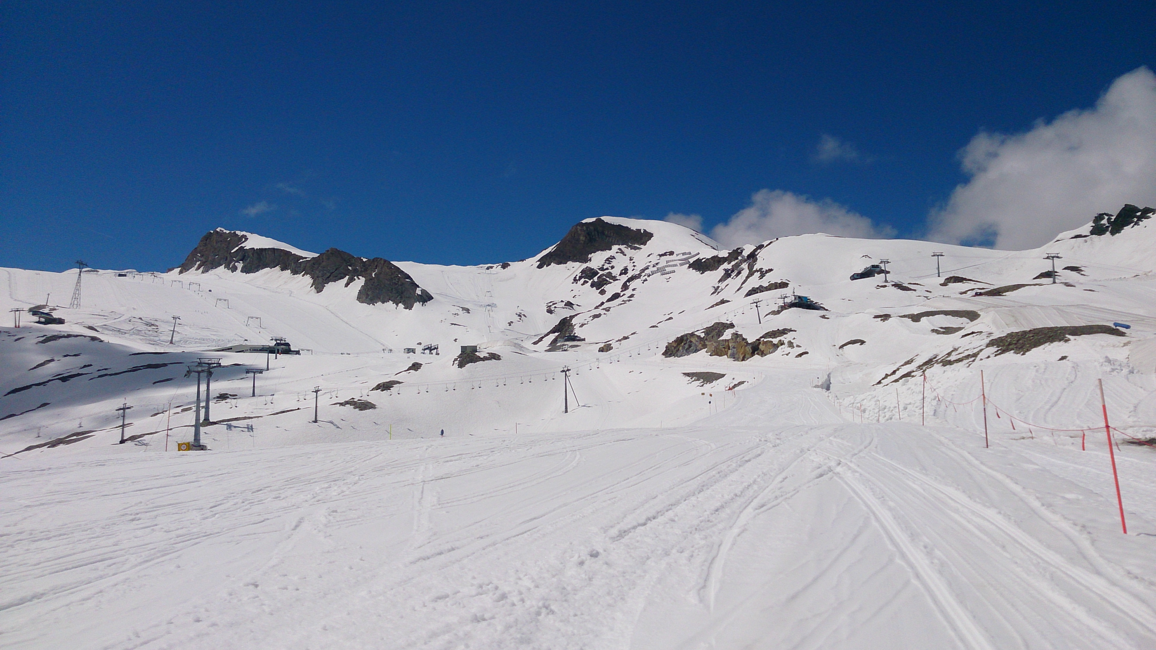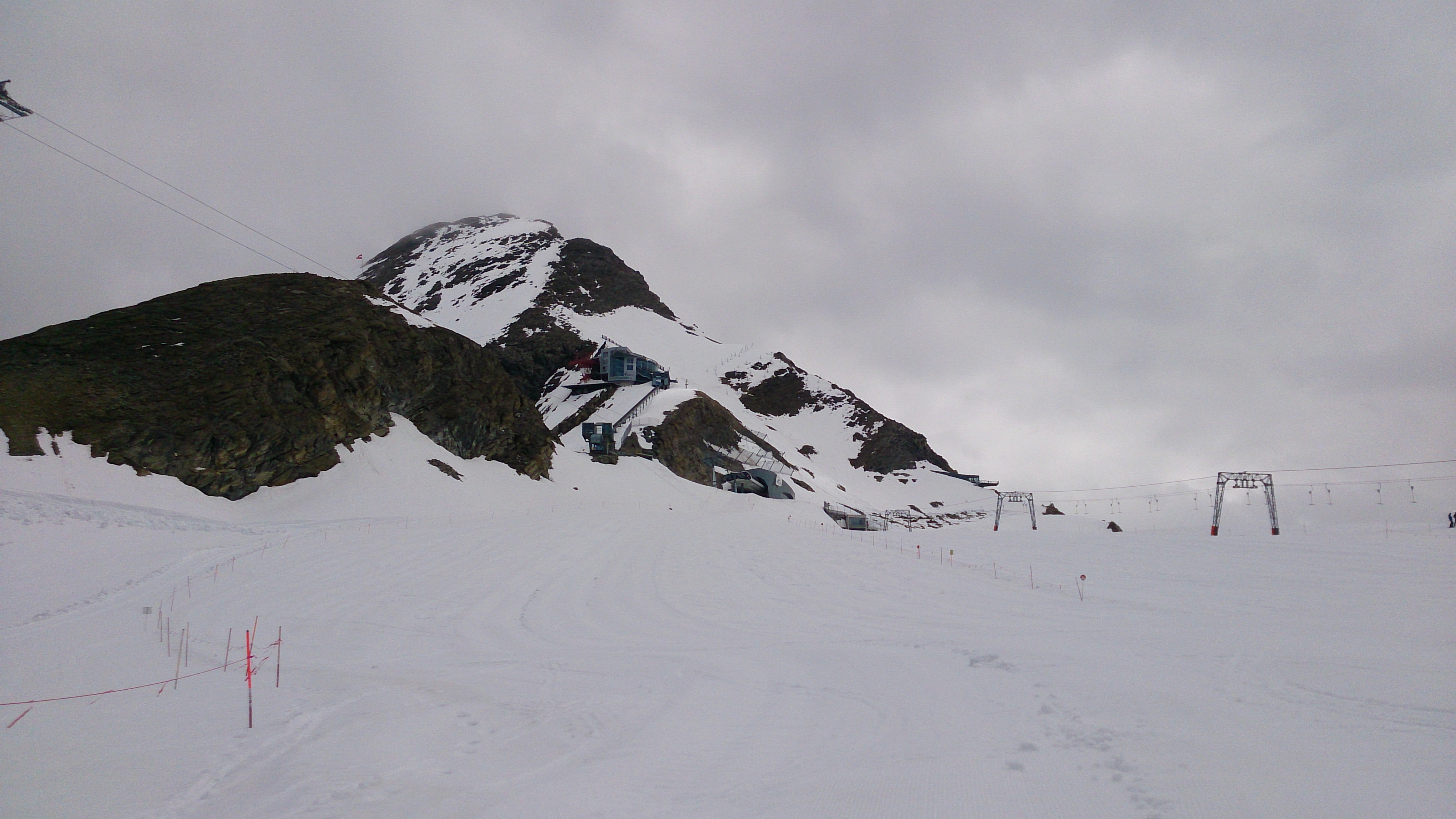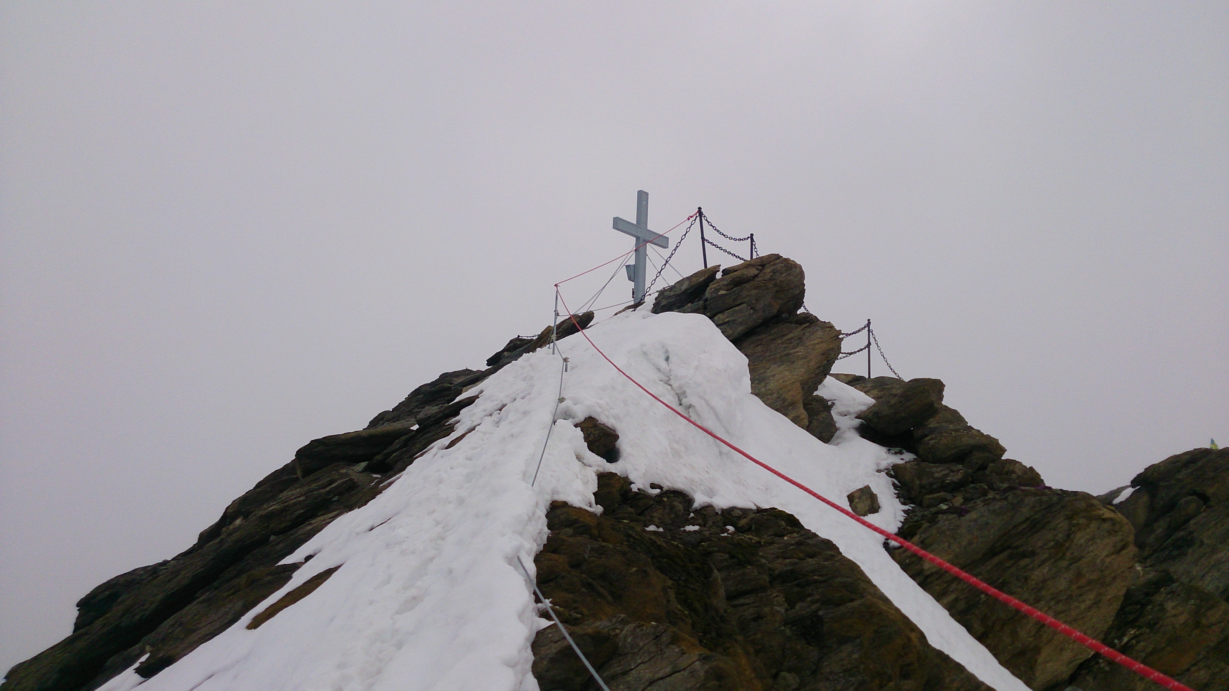 Der Aufstieg zu Fuß mit dem schweren Gepäck zieht sich doch etwas. Im Tal noch anfänglicher Nebel, oberhalb wurde es gleich schwül-warm. Bis zur Krefelder Hütte ging ich über den sog. Krefelderhüttensteig zu Fuß, oberhalb der Salzburger Hütte noch Schneefelder (gingen am Vormittag problemlos). Ab der Hütte dann mit Skiern, ab dem Alpincenter entlang der geöffneten Piste. Viel Betrieb war aber nicht. Am mühsamsten ist der Anstieg ab der Bergstation Gletscherjet 4 zum Gipfel: Zunächst zum Gletscher-Shuttle (Standseilbahn), dort einige Meter zu Fuß, dann wieder alles mit Skiern bis oberhalb der Bergstation der Gipfelbahn. Achtung beim Queren zu den Drahtseilen des Normalaufstiegs: Hier teilweise Blankeis unter wenig Schnee. Die Drahtseile zum Gipfel sind überwiegend frei, aber nicht alle. Außerdem gibt es viele vereiste Stellen. Es ging ohne Steigeisen und Pickel dank des Drahtseils und eines Textilseils sowie teilweise Ausweichen in die Felsen. Normale Liftfahr-Gipfelaspiranten sollten vielleicht noch etwas warten.