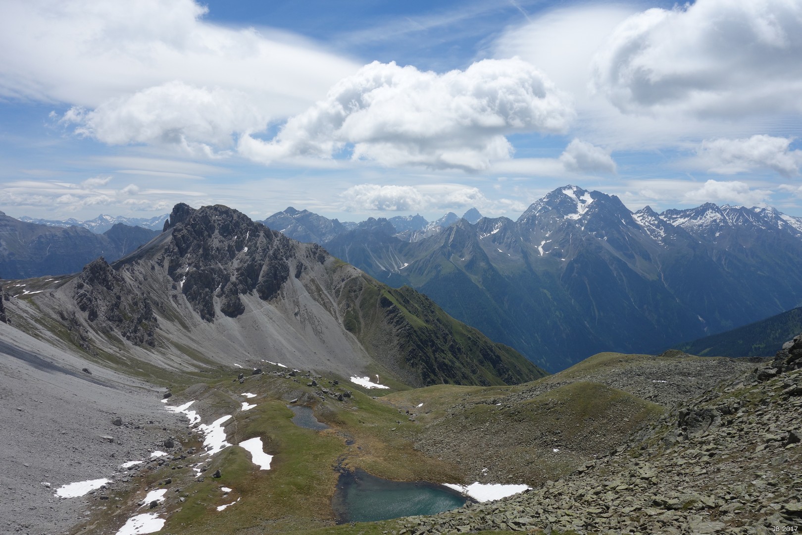 Alternativ vom Gipfel nach SW zum Sendersjöchl absteigen und von dort direkt duch das Senderstal zur Kemater Alm oder über den Höhenweg zur Adolf-Pichler-Hütte.
