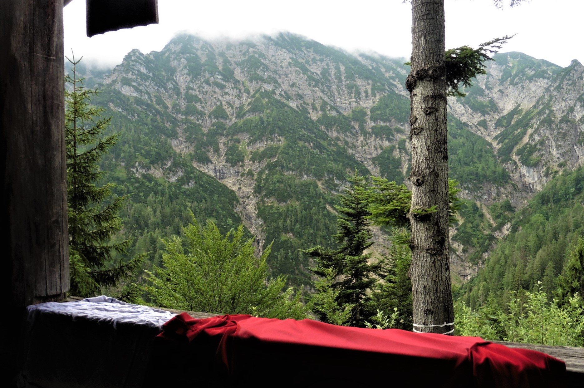 zu Bild 5: kurze Rast auf der Veranda der Diensthütte nach einem Graupelschauer;