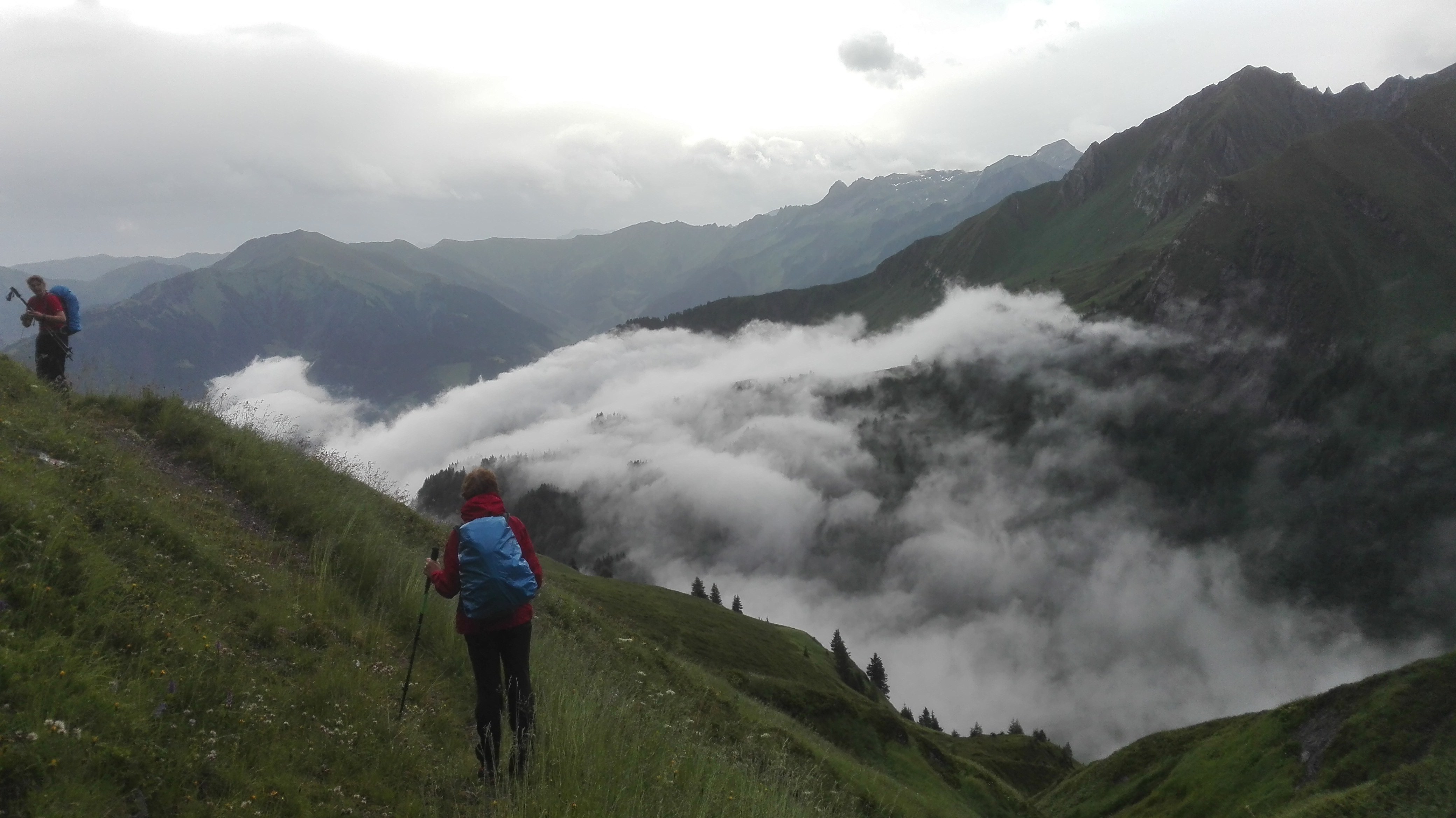 Am Sonntag blieb es länger trocken als angesagt. Regen und leichtes Gewitter erst ab ca. 17.00. Dafür regnete es in der Nacht auf Montag längere Zeit und hörte erst gegen 7.30 endgültig auf. Aus diesem Grund verzichteten wir auf die eigentlich vorgesehene Tour auf den Hohen Tenn. Vormittags blieb es dann trocken, aber starke Quellbewölkung.