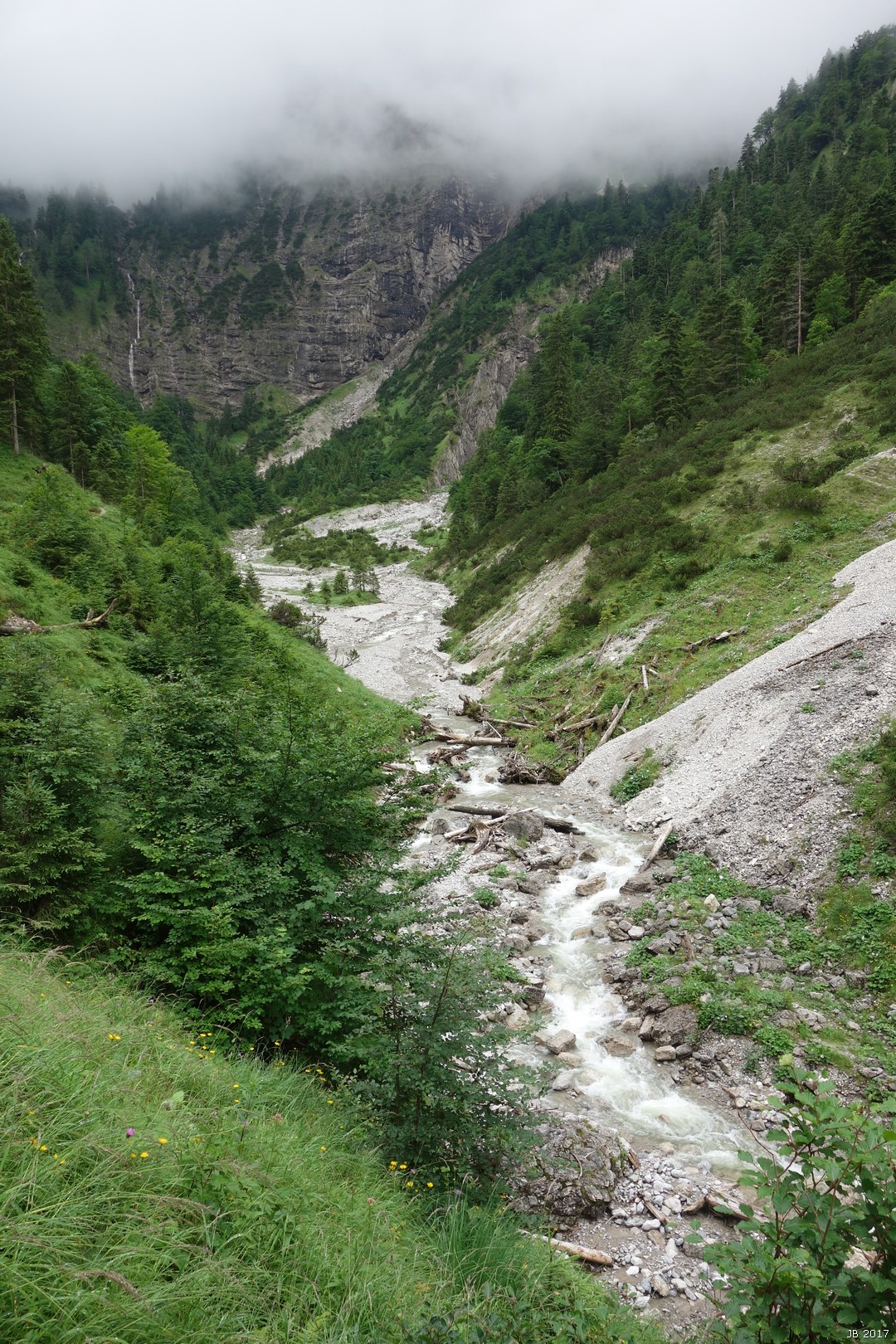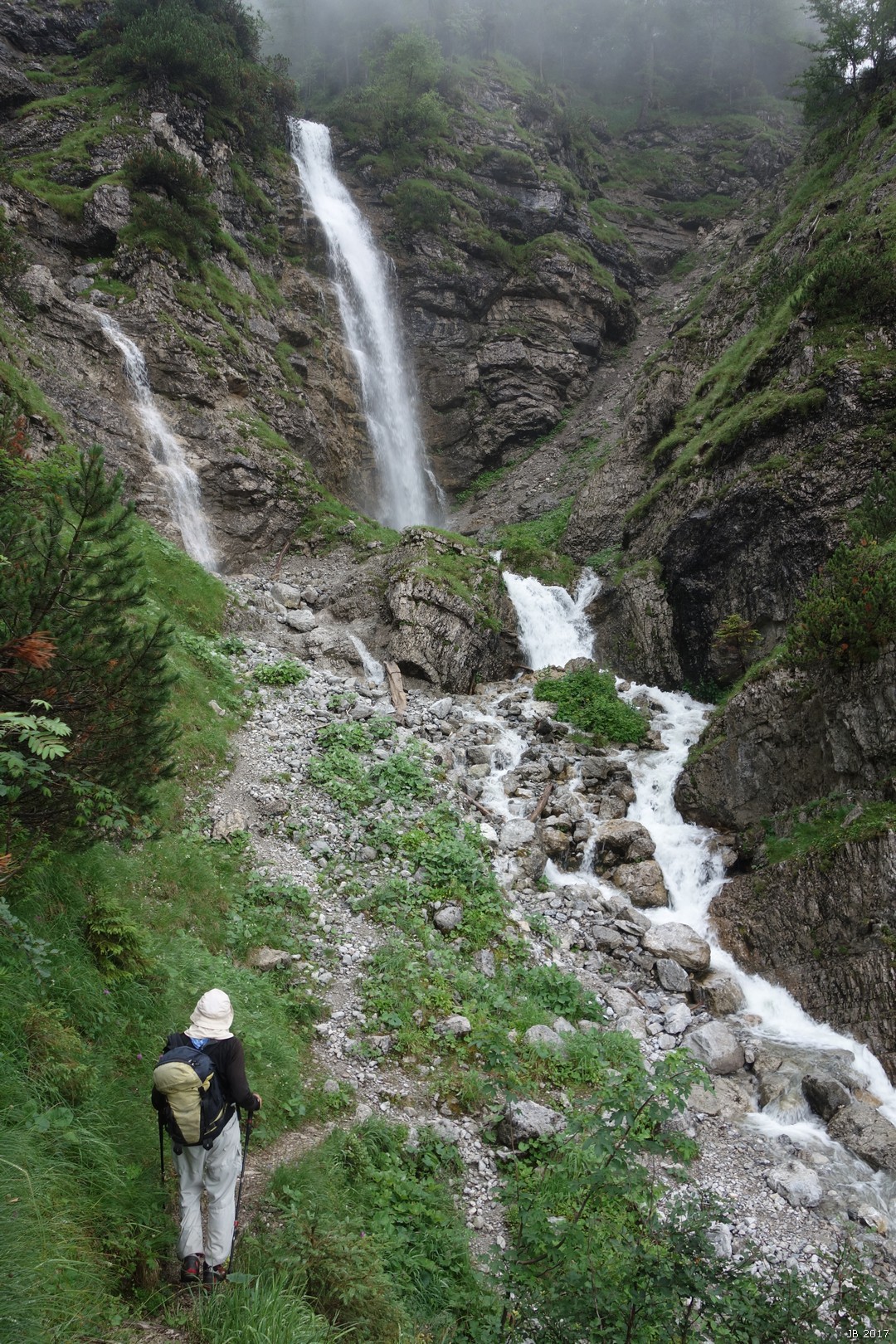 In der Hoffnung auf einen sonnigen Nachmittag später Start mit dem Radel von Fall ins S ins Dürrachtal und nach 1,5 km rechts hinauf ins Krottenbachtal. Nach 7,5 km ist auf 1000m Ende der fahrbaren Strecke. Zu Fuß durch das einsame und wildromantische Tal auf schmalem, sehr schön angelegtem Steig an zahlreichen Wasserfällen vorbei zum Delpsee 1590m. Das hohe Gras ist vom nächtlichen Regen tropfnaß und sorgt für feuchte Hosen und Schuhe, die Bäche haben sehr viel Wasser und sind nur mühsam zu durchqueren. Wegen der immer noch starken Bewölkung am Delpsee entfällt der geplante Anstieg zum Stierjoch, stattdessen geht's zur Knödelsuppe auf die Tölzer Hütte. Leider auch am späteren Nachmittag keine Wetterbesserung , aber zum Glück weiterhin kein Regen. Viele Gemsen unterhalb der Tölzer Hütte.
