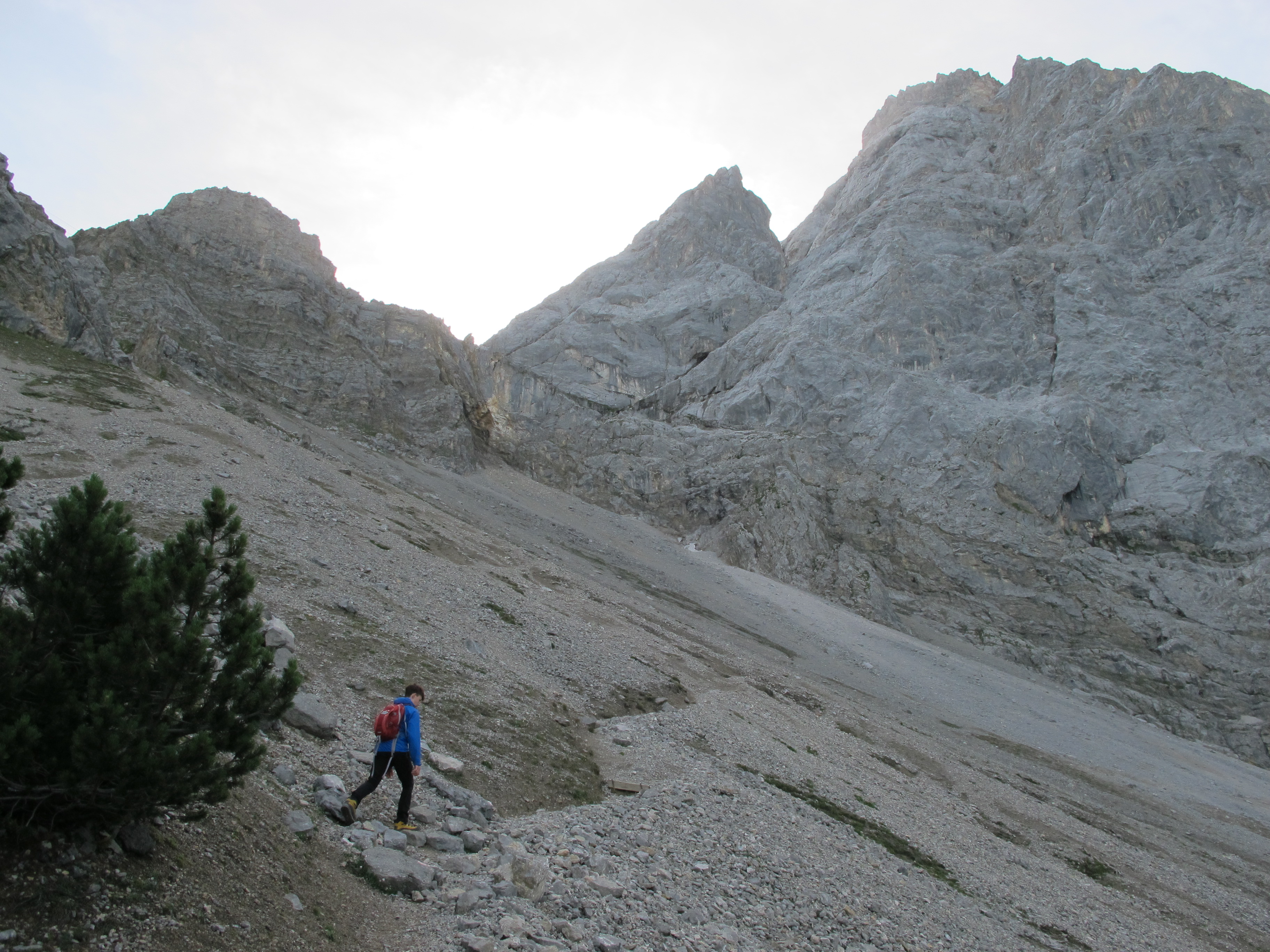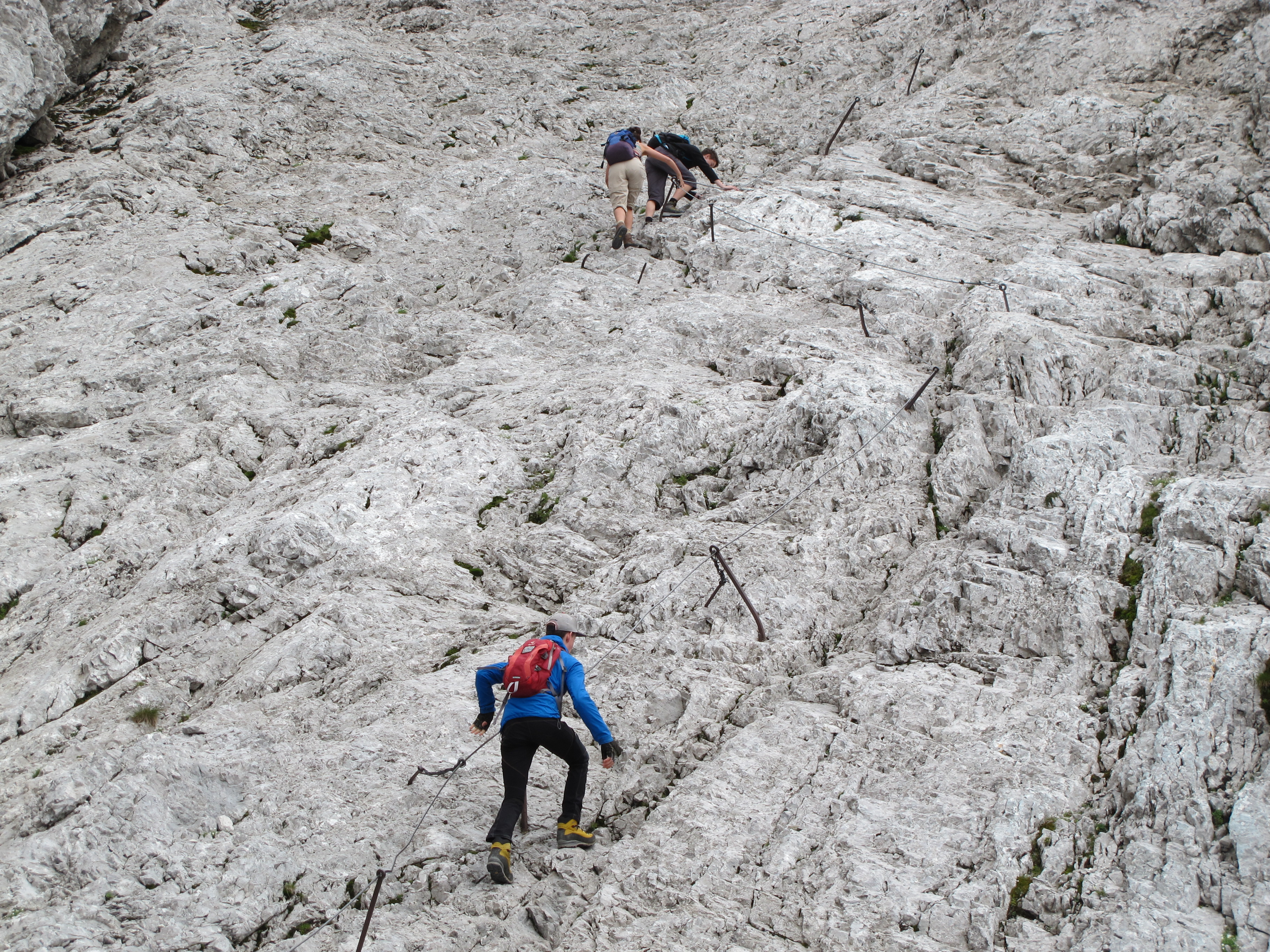 Tourenverhältnisse: Bestens! Wir sind um 8 Uhr los und hatten viel Schatten in der Route sowie eher kühle Temperaturen. Allerdings war der Himmel gegen Mittag etwas trüb, also nicht ganz so schön wie vorhergesagt. Der Steig ist kein klassischer Klettersteig, sondern ein Bergsteig mit Sicherungen und ein paar Eisenbügeln.