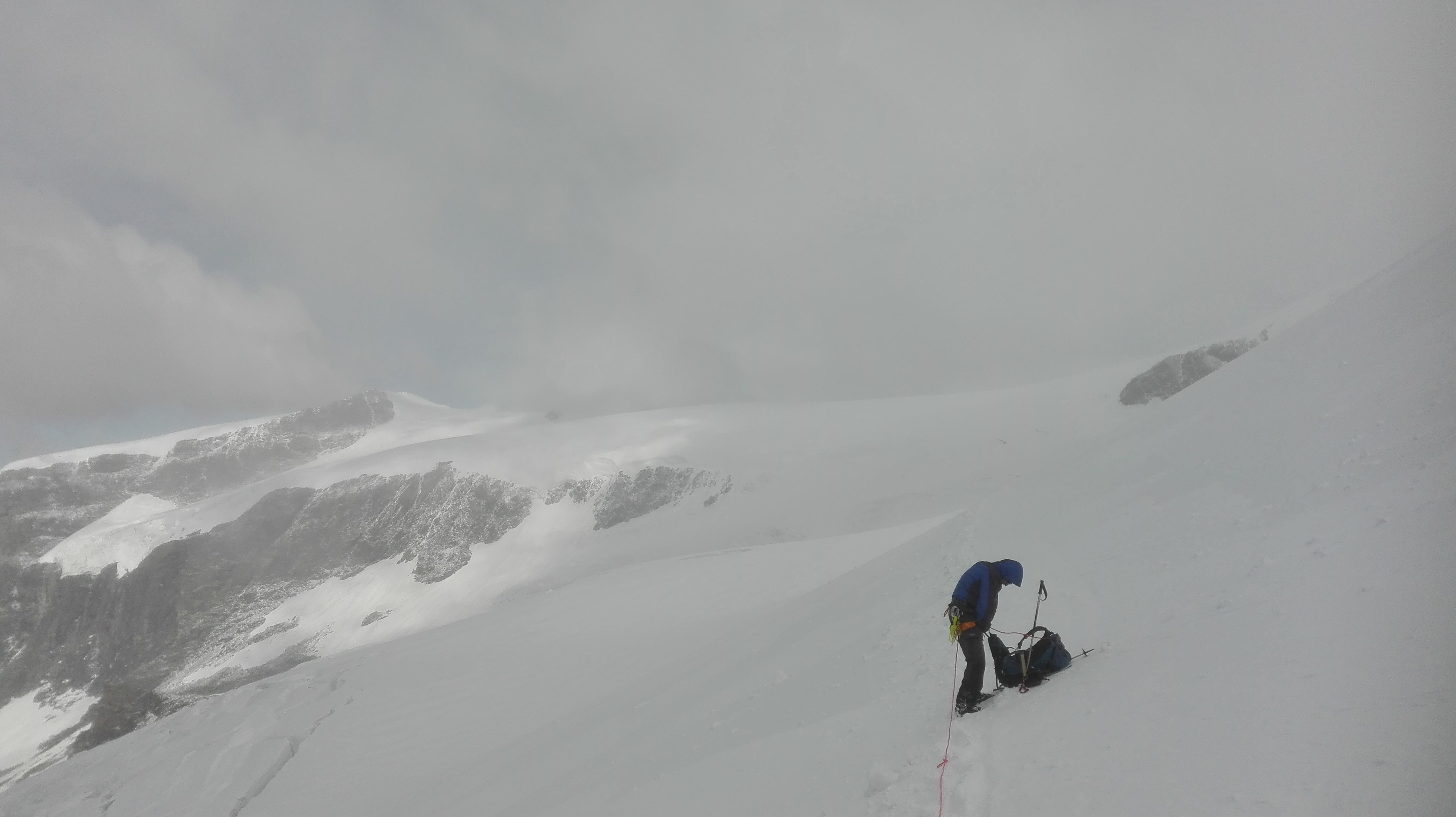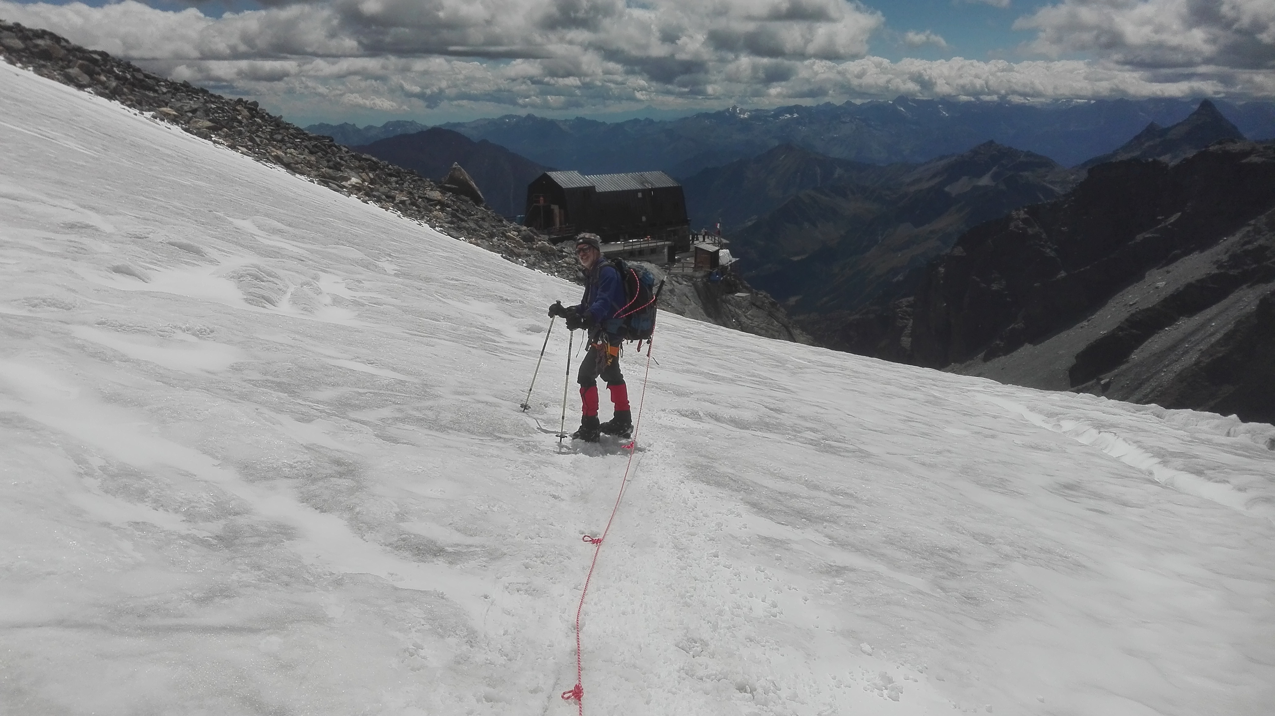 Sonstiges: Der Dienstag war der am wenigsten schlechte Tag von insgesamt vier Tagen, die wir in dem Gebiet waren. Der Aufstieg erfolgte am Sonntag noch bei schönem Wetter von St. Jaques im Val d´Ayas (ca. 1700m) zum Rifugio Guide Val d´Ayas (3400m) in ca. sechs Stunden. Montag früh dann einige cm nasser Neuschnee an der Hütte, dazu Wolken und stürmischer Wind. Da die Hütte Montagabend voll belegt war (dies ist sie an diesem Tag meistens, da am Montag die meisten Begeher der sogen. "Spaghettitour" in Zermatt mit der Seilbahn aufs Kleinmatterhorn starten und dann zu dieser Hütte gehen, so jedenfalls der Hüttenwirt), mussten wir zur Mezzalamahütte absteigen. Diese ist recht klein (30 Plätze), noch echt urig und war mit etwa 20 Personen belegt. Empfehlenswert, wenn man es etwas ruhiger mag! Die Gletscherausrüstung konnten wir auf der Ayashütte deponieren und am Morgen dort abholen (man kommt ja eh vorbei).