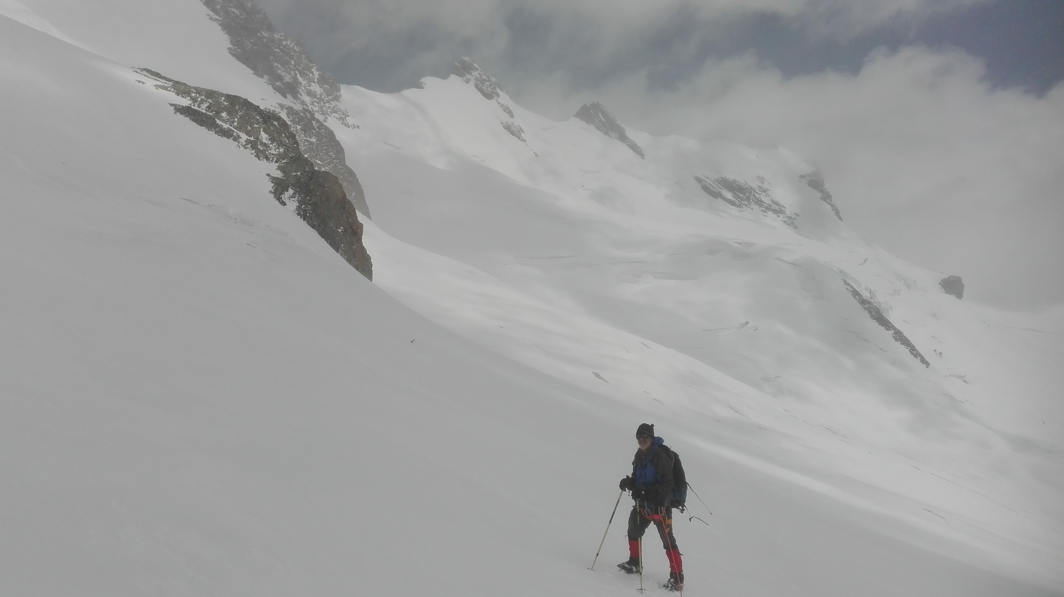 Tourenverhältnisse: Brauchbar. Wir stiegen von der Mezzalamahütte im Val d´Ayas auf, da das rund 400Hm höher gelegene Rifugio Guide Val d Áyas voll belegt war. Man braucht ca. eine Stunde von der unteren zur oberen Hütte und betritt unmittelbar nach der oberen Hütte den Verragletscher. Über diesen auf (wohl fast immer) vorhandener Spur Richtung Castor, bis man unter dem Pollux auf ca. 3650m scharf nach links (Westen) abbiegt. Unter dem SW-Grat des Pollux und knapp unter dem Schwarztor vorbei und (kilometer)lange Querung bis zum Breithornpass oder auch schon ein Stück vor dem Pass über die Südhänge Richtung Gipfel hoch. In diesem Bereich viele Seilschaften unterwegs, die alle vom Kleinmatterhorn kommen. Technisch problemlos bis zum Gipfel. Problematischer war an diesem Tag zeitweise die Orientierung, da insbesondere im Bereich des Schwarztors Wolken von Norden hereindrückten und der Nordföhn hier alle Spuren sehr schnell wieder zuwehte. Später besser, da man im Windschatten des Breithorns ging. Unmittelbar am Gipfel stürmisch aus Nord. Einige cm Neuschnee auf dem Gletscher. Zurück auf dem gleichen Weg.